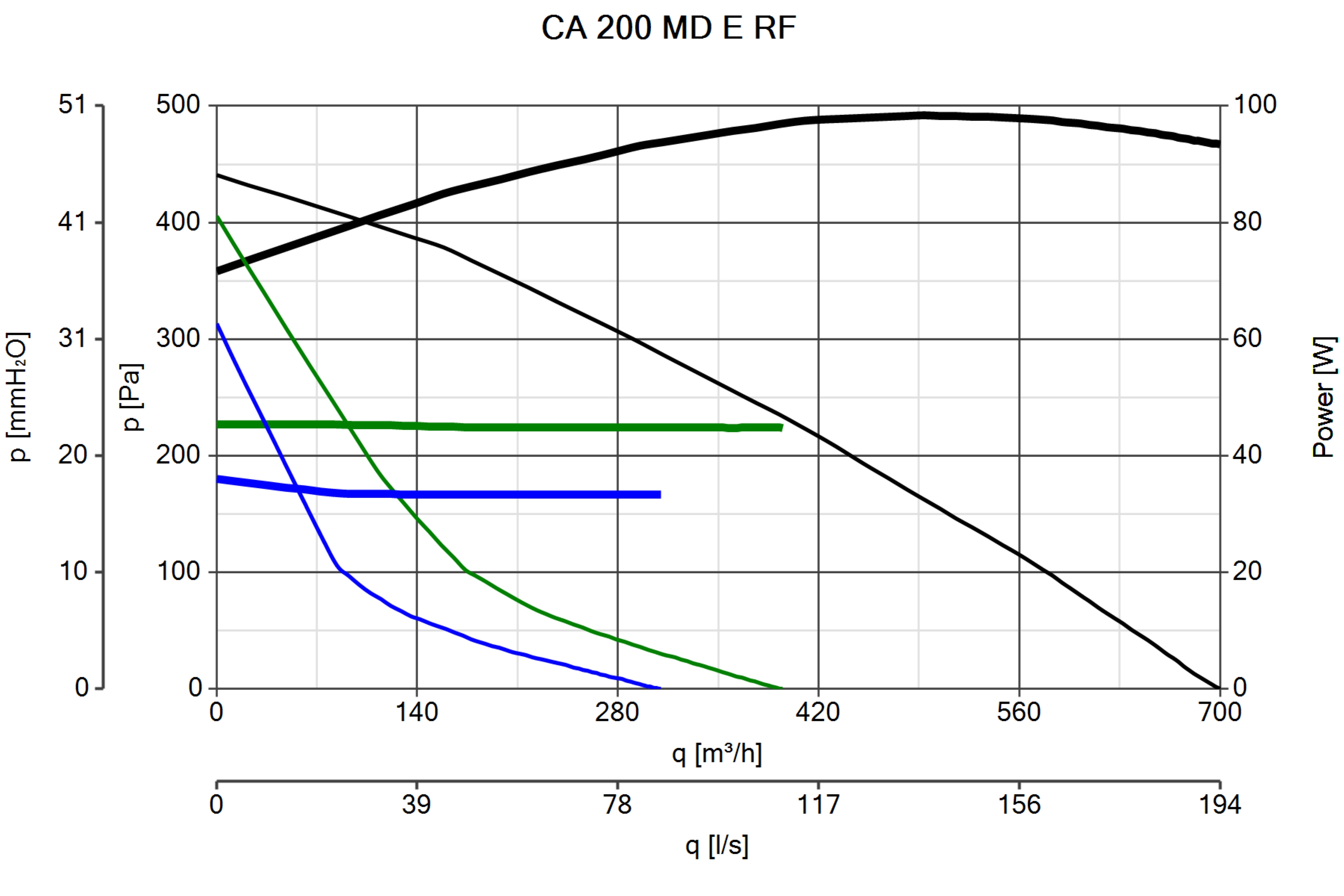 CA 200 MD E RF, Dach-Rohrradialventilator, NW 200 mm, aus verzinktem, lackiertem Stahlblech, Farbe hammerschlag grau, Dachhaube aus Kunststoff, 220-240 V~50 Hz, 95 W, max. 700 m³/h, max. 440,6 Pa, max. 2.555 U/min., LP max. 31,7 dB(A) -3m, Schutzart IP44, Schutzklasse II, Temp. max.für Dauerbetrieb 55° C, Motor kugelgelagert, 3-stufig, drehzahlregelbar, mit thermischen Überlastungsschutz