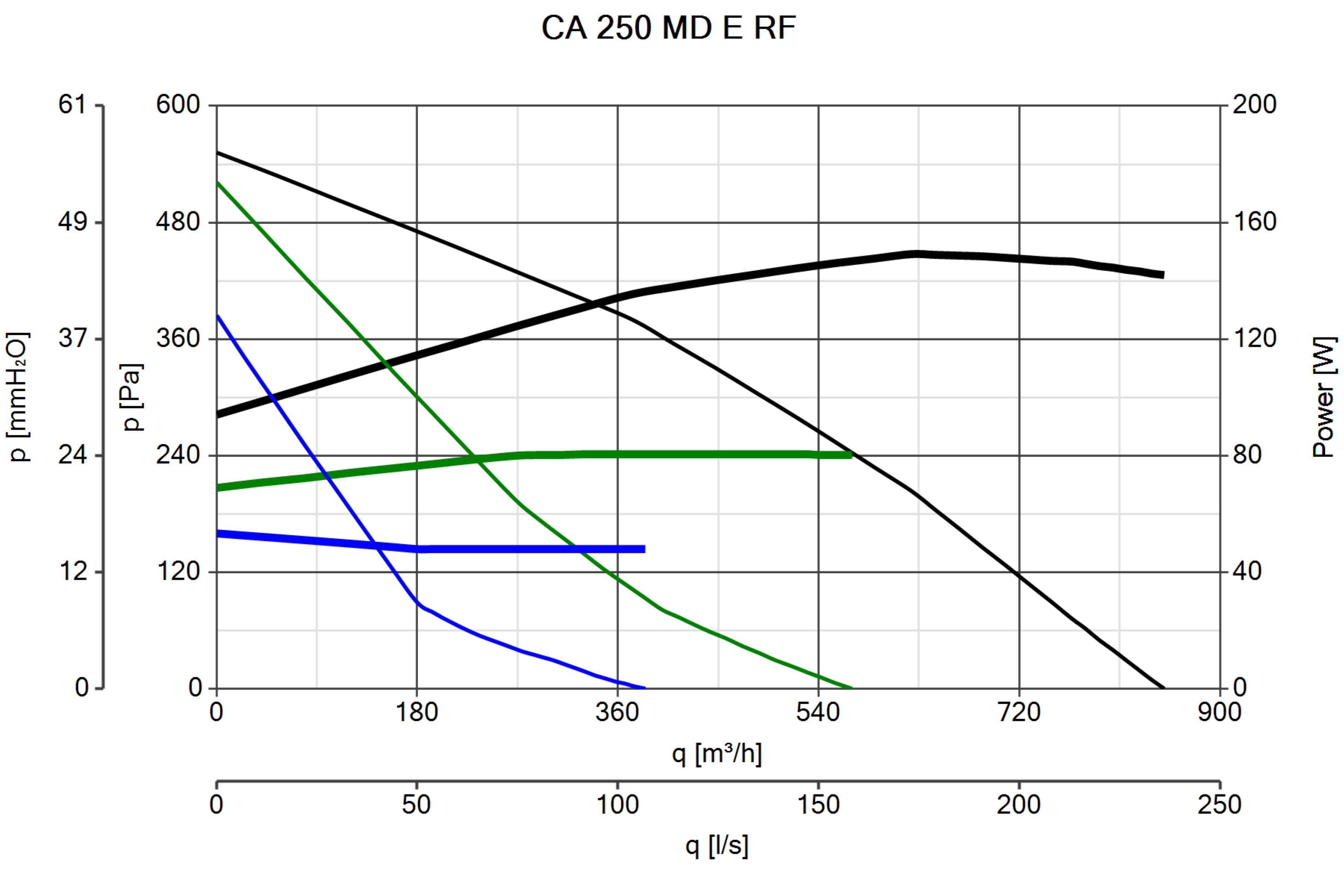 CA 250 MD E RF, Dach-Rohrradialventilator, NW 250 mm, aus verzinktem, lackiertem Stahlblech, Farbe hammerschlag grau, Dachhaube aus Kunststoff, 220-240 V~50 Hz, 130 W, max. 850 m³/h, max. 552,2 Pa, max. 2.565 U/min., LP max. 31,7 dB(A) -3m, Schutzart IP44, Schutzklasse II, Temp. max.für Dauerbetrieb 50° C, Motor kugelgelagert, 3-stufig, drehzahlregelbar, mit thermischen Überlastungsschutz