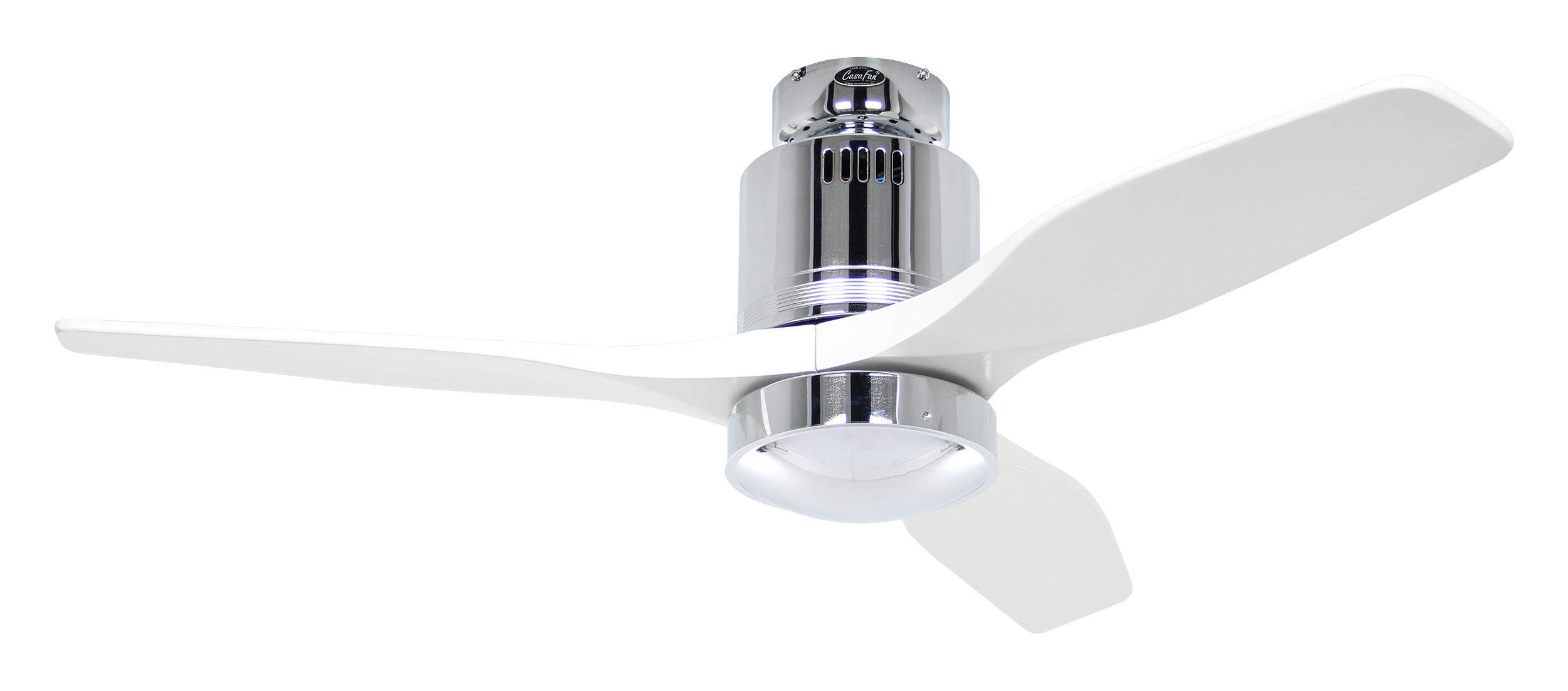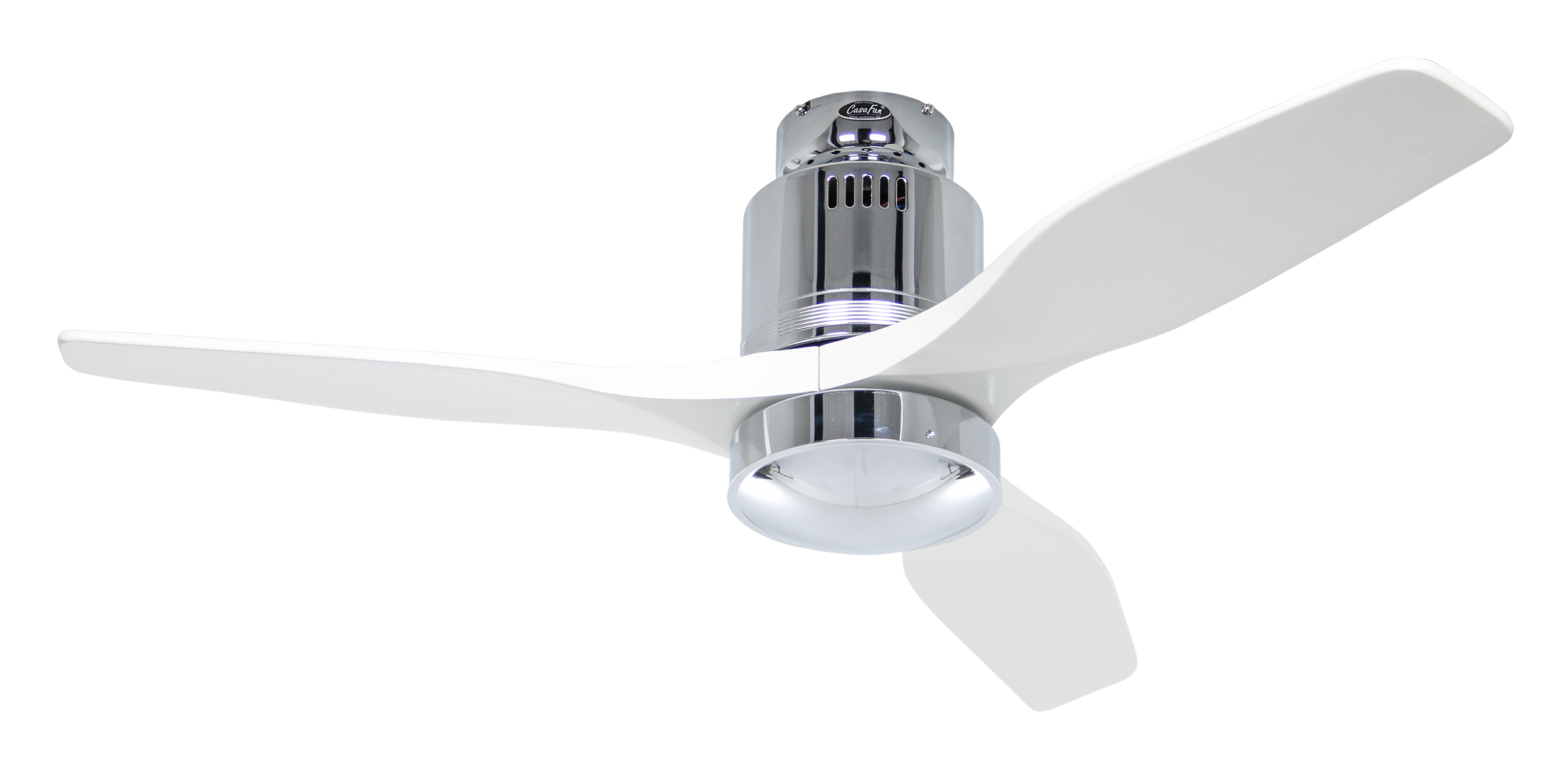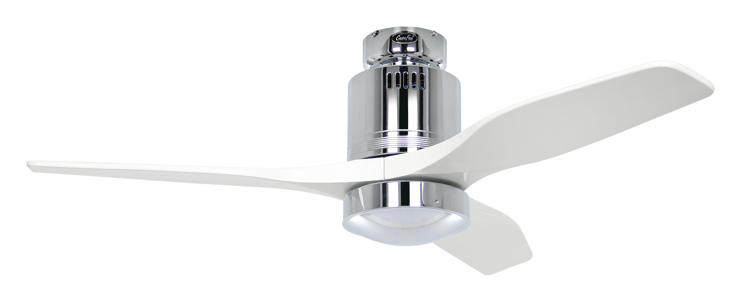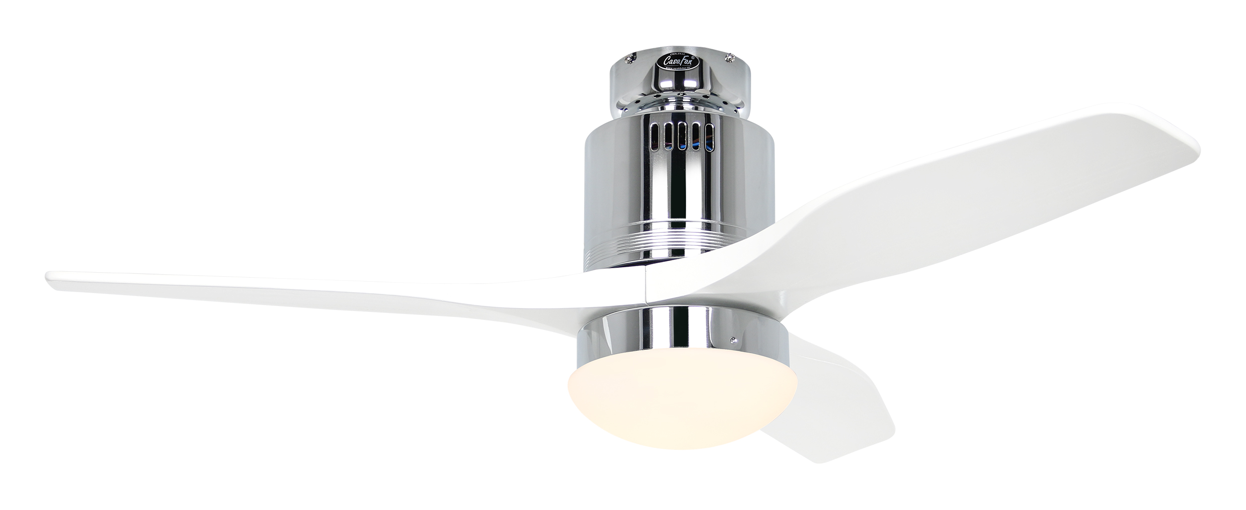 CasaFan AERODYNAMIX ECO 112 CH-WE, Energiespar Deckenventilator, Ø 112 cm, Gehäuse Chrom glänzend, 3 Flügel Lack weiß, handgefertigt, Massivholz gefräst, 220-240 V 50 Hz, DC/EC Motor 3,8-11,3 W, inkl. Funk-Fernbedienung (Motor 6 Stufen, Vor-/Rückwärtslauf - Sommer/Winter -, Licht ein/aus) und Wandhalter, inkl. Milchglasleuchte 2 x 40 W E14 , auch für Energiesparleuchtmittel geeignet, Montage auch ohne Leuchte und mit Blindabdeckung (im Lieferumfang) möglich, Drehzahl max. 72-191 U/min, Abstand Decke - Flügel 250 mm, Montage nur an geraden Decken (mit optionaler Deckenstange an Schrägen bis 28°), gewuchteter Motor und Flügel, für Raumgrößen bis 16 m², Zubehör wie Flügel und längere Deckenstangen erhältlich