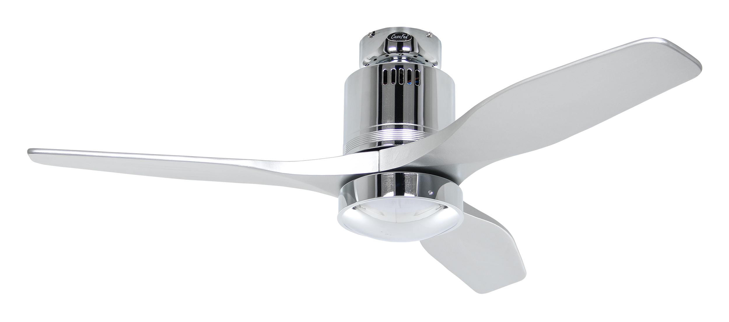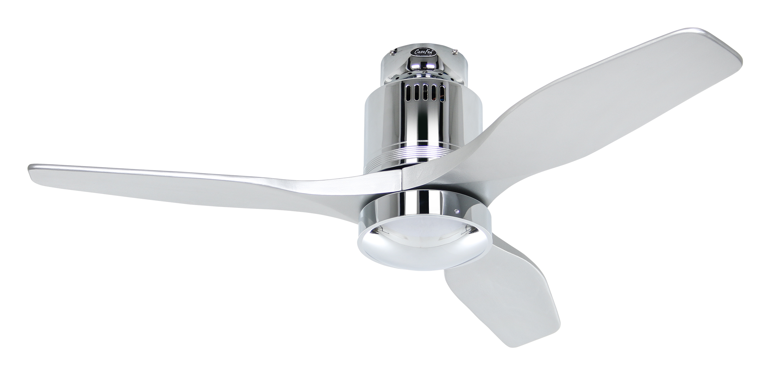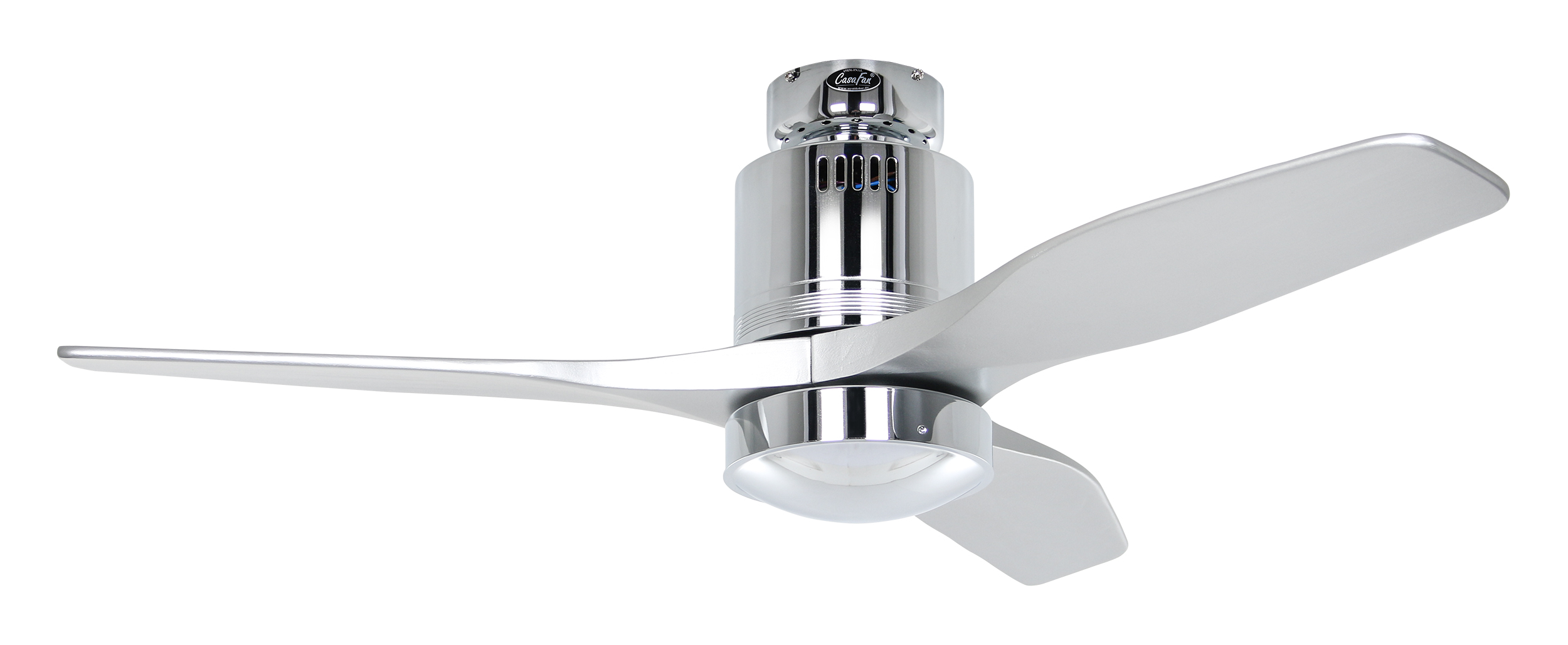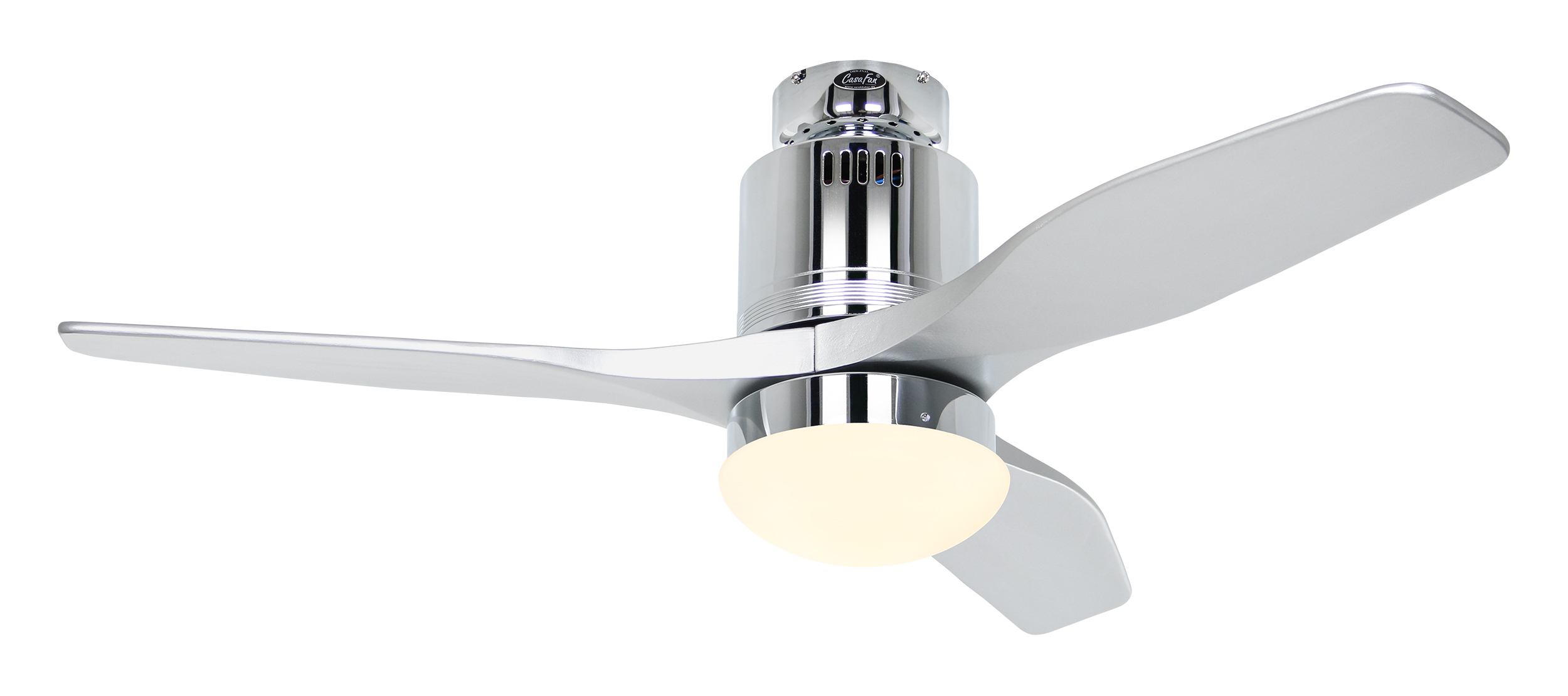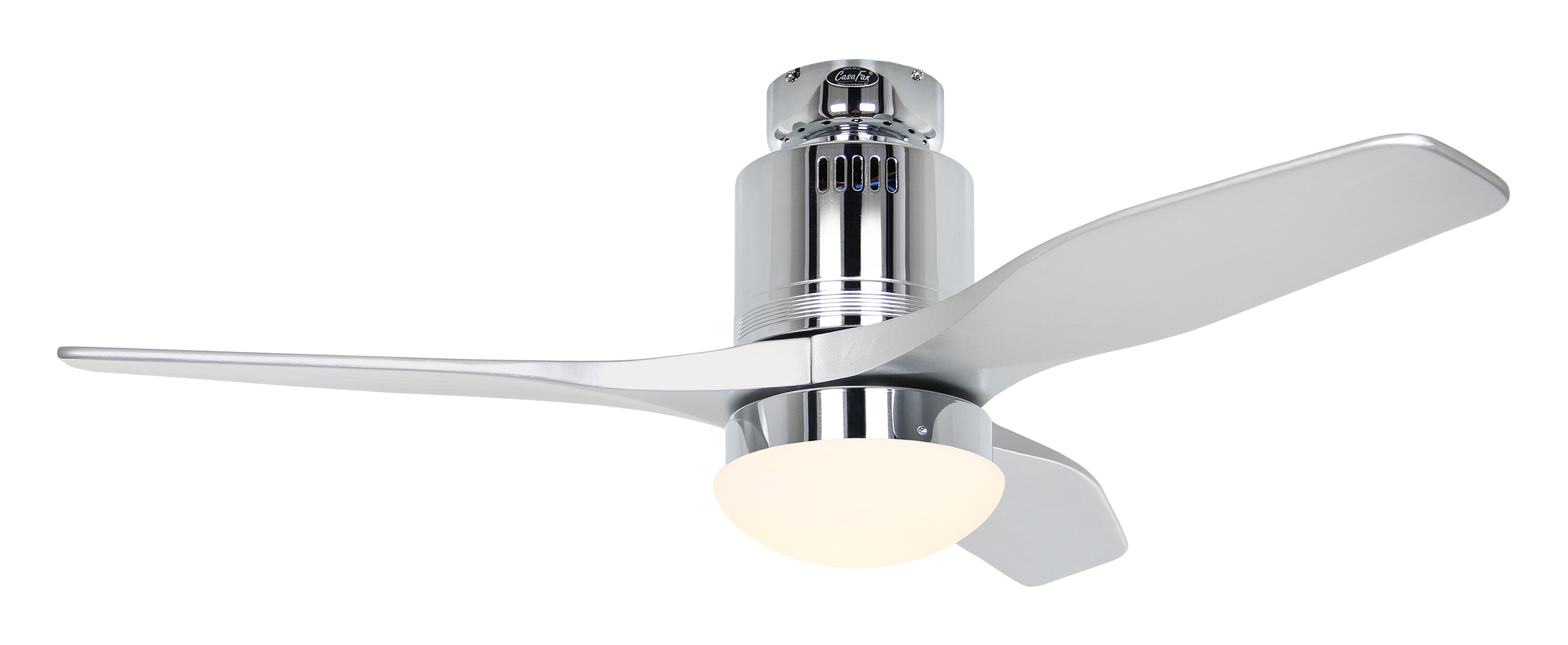 CasaFan AERODYNAMIX ECO 112 CH-SI, Energiespar Deckenventilator, Ø 112 cm, Gehäuse Chrom glänzend, 3 Flügel Lack silber, handgefertigt, Massivholz gefräst, 220-240 V 50 Hz, DC/EC Motor 3,8-11,3 W, inkl. Funk-Fernbedienung (Motor 6 Stufen, Vor-/Rückwärtslauf - Sommer/Winter -, Licht ein/aus) und Wandhalter, inkl. Milchglasleuchte 2 x 40 W E14 , auch für Energiesparleuchtmittel geeignet, Montage auch ohne Leuchte und mit Blindabdeckung (im Lieferumfang) möglich, Drehzahl max. 72-191 U/min, Abstand Decke - Flügel 250 mm, Montage nur an geraden Decken (mit optionaler Deckenstange an Schrägen bis 28°), gewuchteter Motor und Flügel, für Raumgrößen bis 16 m², Zubehör wie Flügel und längere Deckenstangen erhältlich