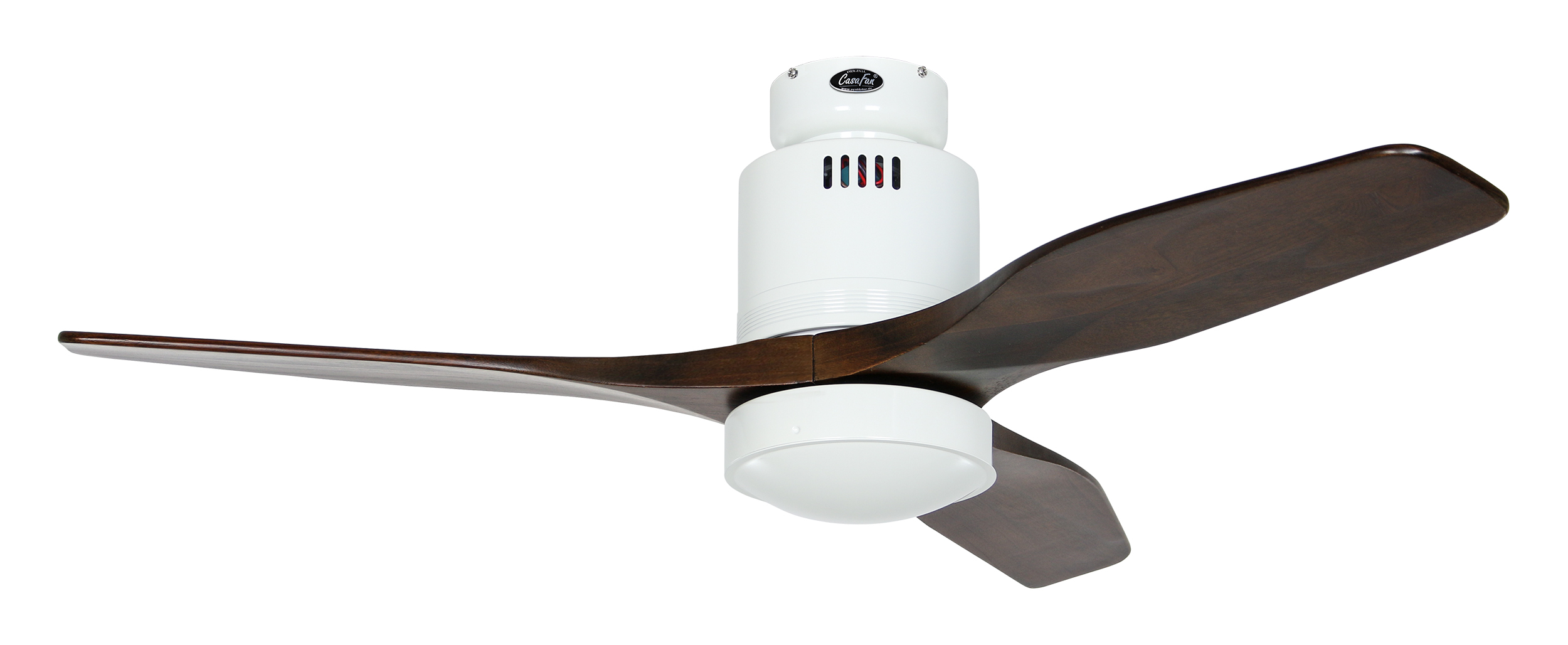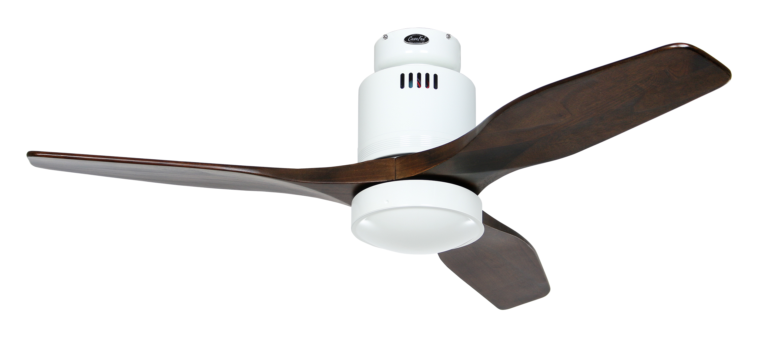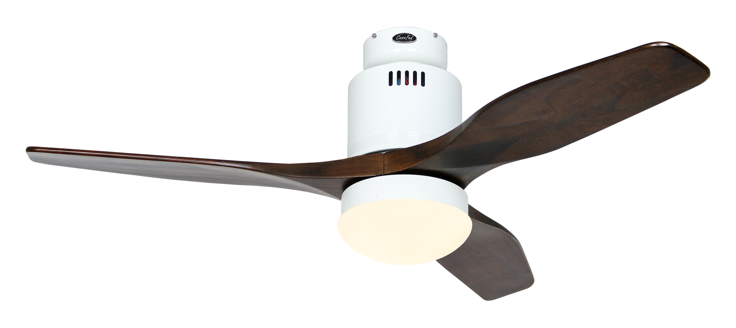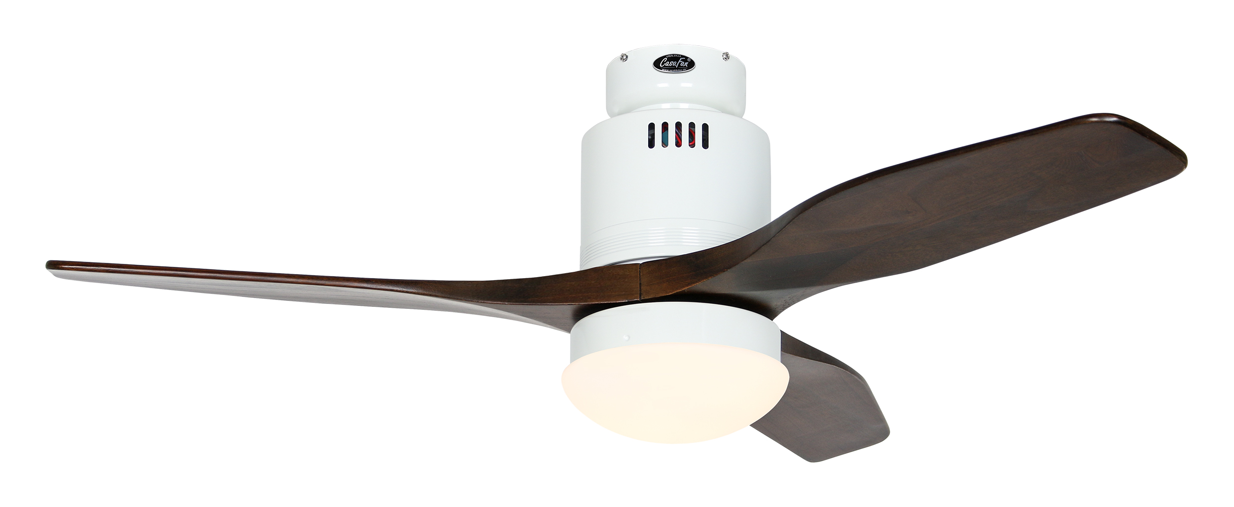 CasaFan AERODYNAMIX ECO 112 WE-NB, Energiespar Deckenventilator, Ø 112 cm, Gehäuse Lack weiß, 3 Flügel Nussbaum, handgefertigt, Massivholz gefräst, 220-240 V 50 Hz, DC/EC Motor 3,8-11,3 W, inkl. Funk-Fernbedienung (Motor 6 Stufen, Vor-/Rückwärtslauf - Sommer/Winter -, Licht ein/aus) und Wandhalter, inkl. Milchglasleuchte 2 x 40 W E14 , auch für Energiesparleuchtmittel geeignet, Montage auch ohne Leuchte und mit Blindabdeckung (im Lieferumfang) möglich, Drehzahl max. 72-191 U/min, Abstand Decke - Flügel 250 mm, Montage nur an geraden Decken (mit optionaler Deckenstange an Schrägen bis 28°), gewuchteter Motor und Flügel, für Raumgrößen bis 16 m², Zubehör wie Flügel und längere Deckenstangen erhältlich