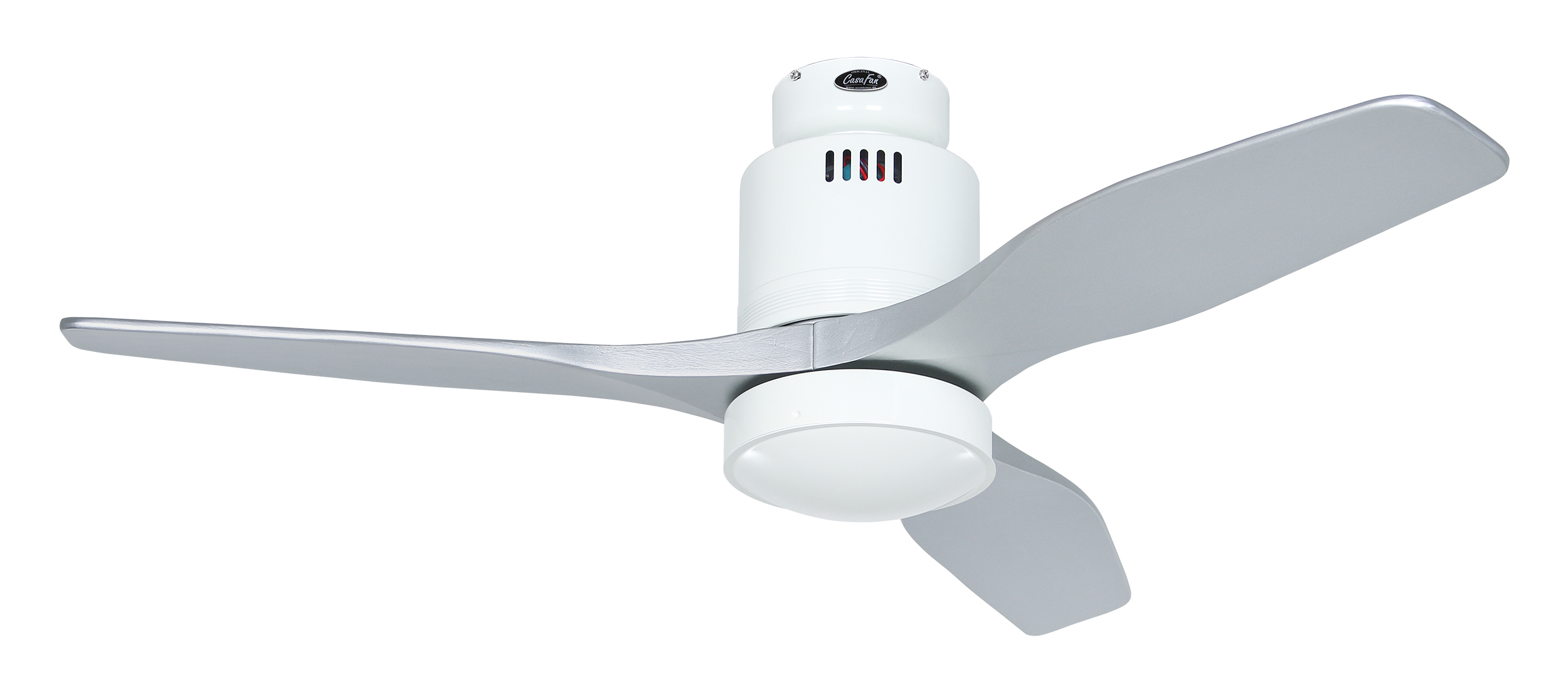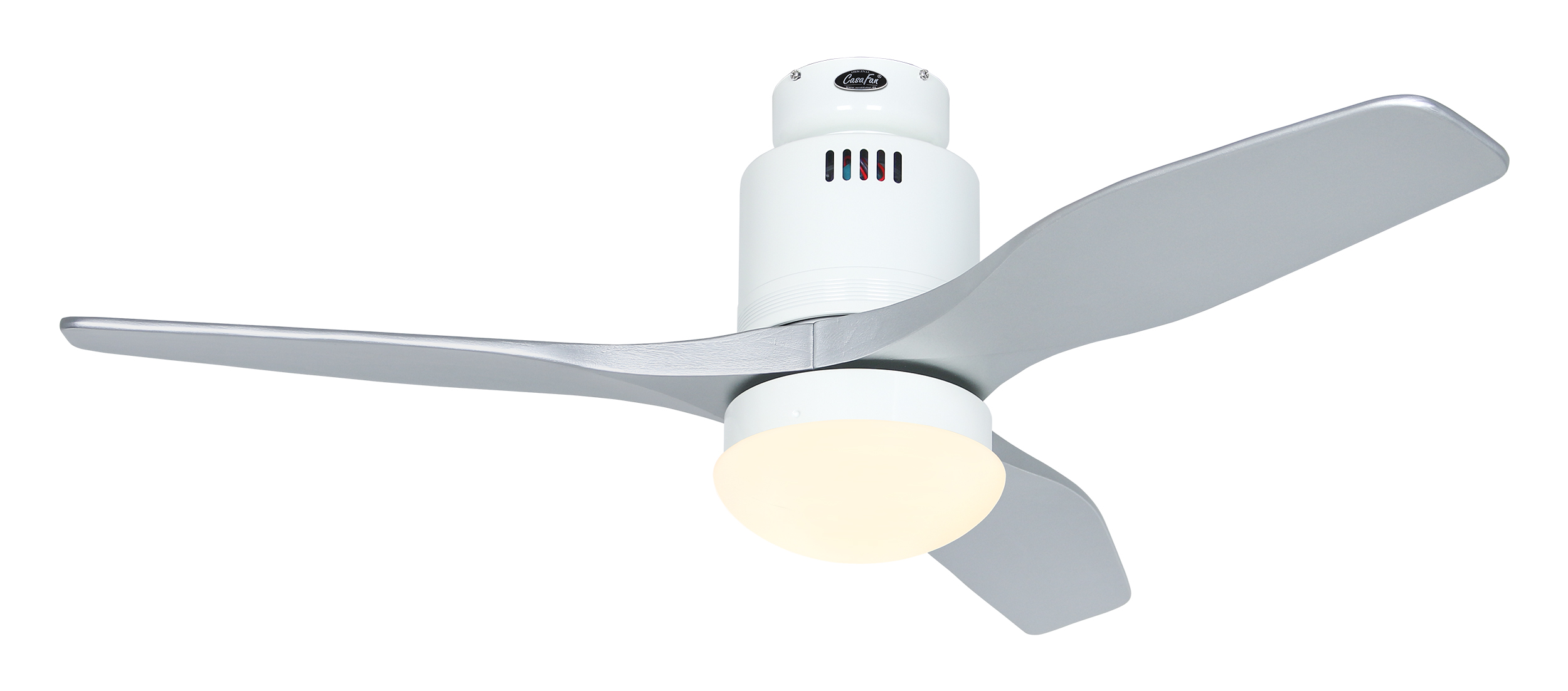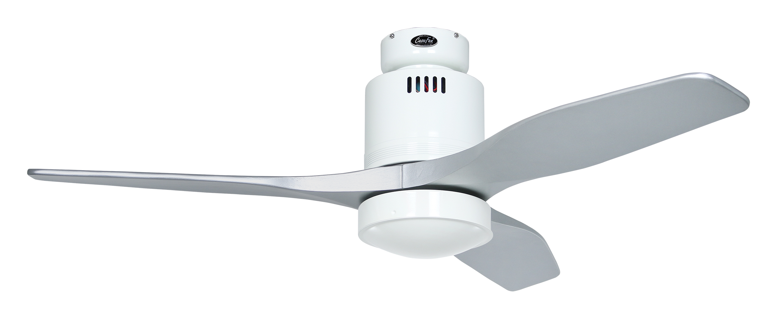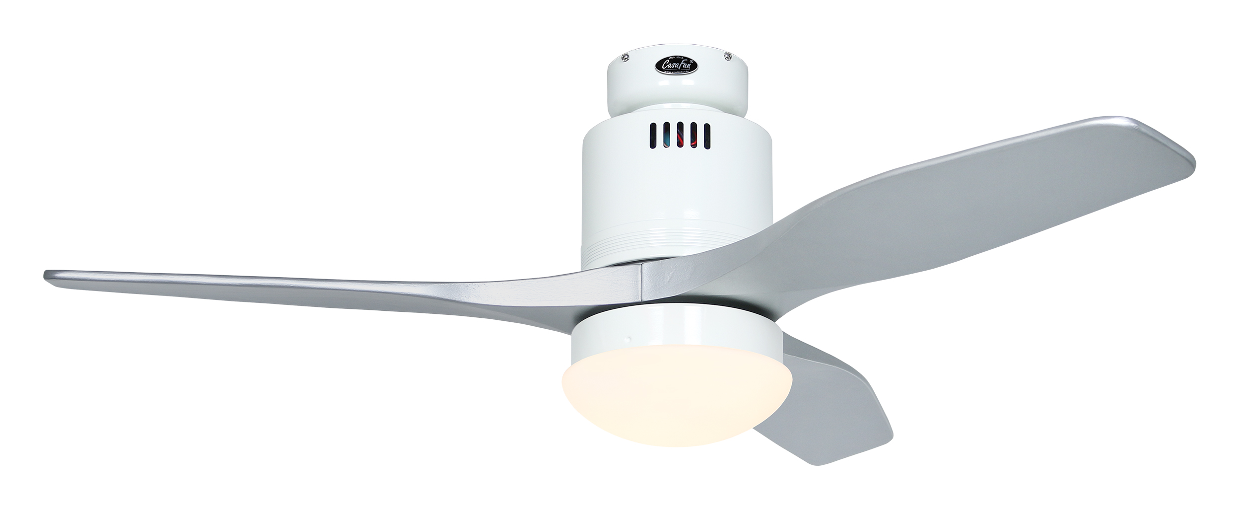 CasaFan AERODYNAMIX ECO 112 WE-SI, Energiespar Deckenventilator, Ø 112 cm, Gehäuse Lack weiß, 3 Flügel Lack silber, handgefertigt, Massivholz gefräst, 220-240 V 50 Hz, DC/EC Motor 3,8-11,3 W, inkl. Funk-Fernbedienung (Motor 6 Stufen, Vor-/Rückwärtslauf - Sommer/Winter -, Licht ein/aus) und Wandhalter, inkl. Milchglasleuchte 2 x 40 W E14 , auch für Energiesparleuchtmittel geeignet, Montage auch ohne Leuchte und mit Blindabdeckung (im Lieferumfang) möglich, Drehzahl max. 72-191 U/min, Abstand Decke - Flügel 250 mm, Montage nur an geraden Decken (mit optionaler Deckenstange an Schrägen bis 28°), gewuchteter Motor und Flügel, für Raumgrößen bis 16 m², Zubehör wie Flügel und längere Deckenstangen erhältlich