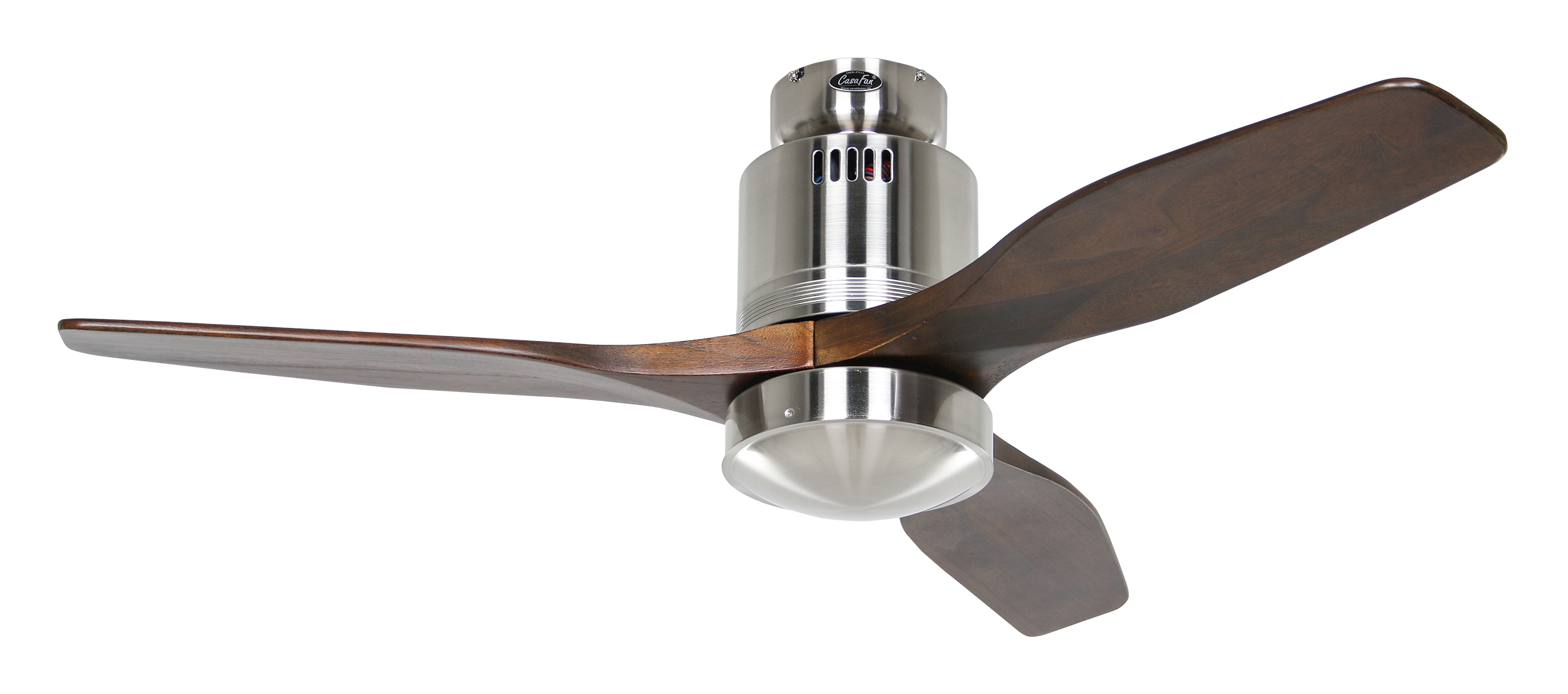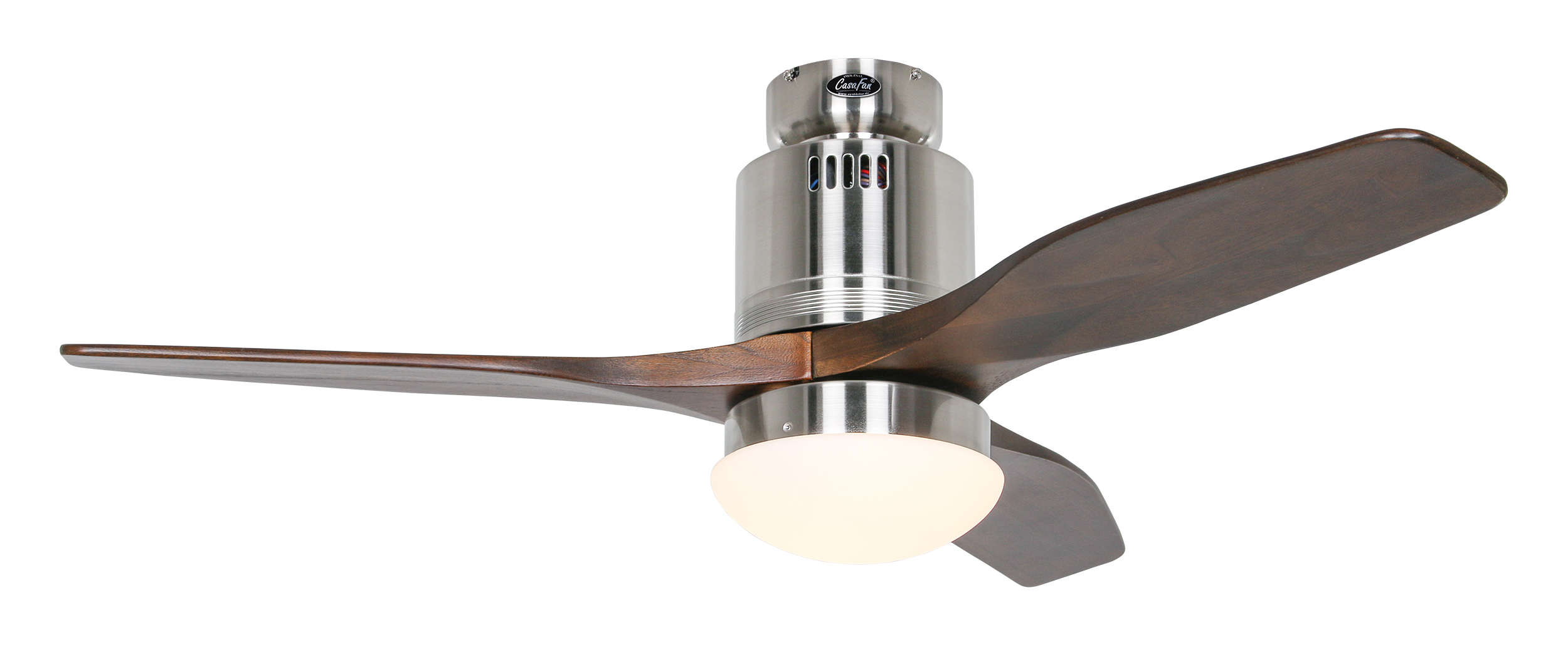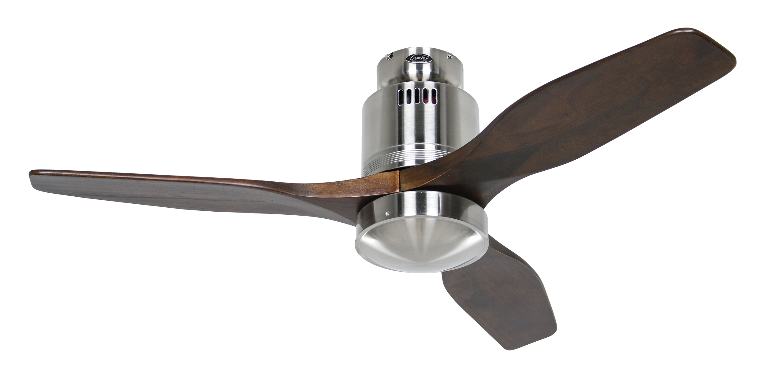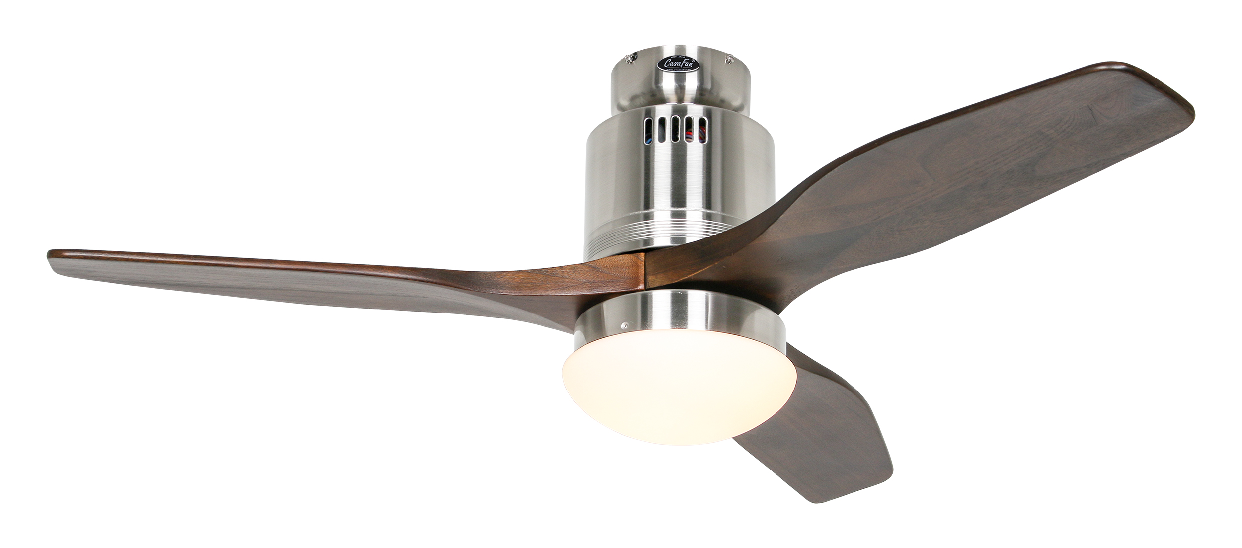 CasaFan AERODYNAMIX ECO 112 BN-NB, Energiespar Deckenventilator, Ø 112 cm, Gehäuse Chrom gebürstet, 3 Flügel Nussbaum, handgefertigt, Massivholz gefräst, 220-240 V 50 Hz, DC/EC Motor 3,8-11,3 W, inkl. Funk-Fernbedienung (Motor 6 Stufen, Vor-/Rückwärtslauf - Sommer/Winter -, Licht ein/aus) und Wandhalter, inkl. Milchglasleuchte 2 x 40 W E14 , auch für Energiesparleuchtmittel geeignet, Montage auch ohne Leuchte und mit Blindabdeckung (im Lieferumfang) möglich, Drehzahl max. 72-191 U/min, Abstand Decke - Flügel 250 mm, Montage nur an geraden Decken (mit optionaler Deckenstange an Schrägen bis 28°), gewuchteter Motor und Flügel, für Raumgrößen bis 16 m², Zubehör wie Flügel und längere Deckenstangen erhältlich