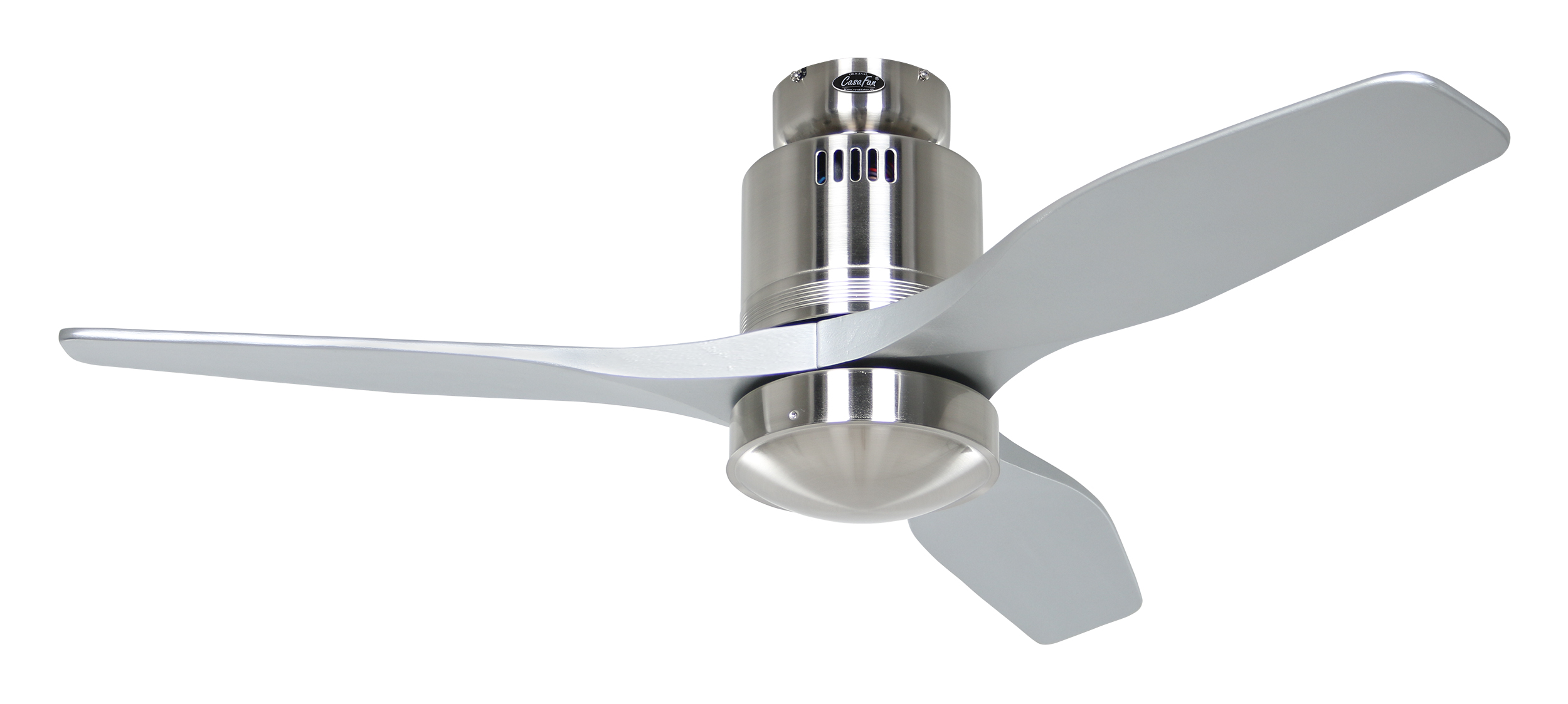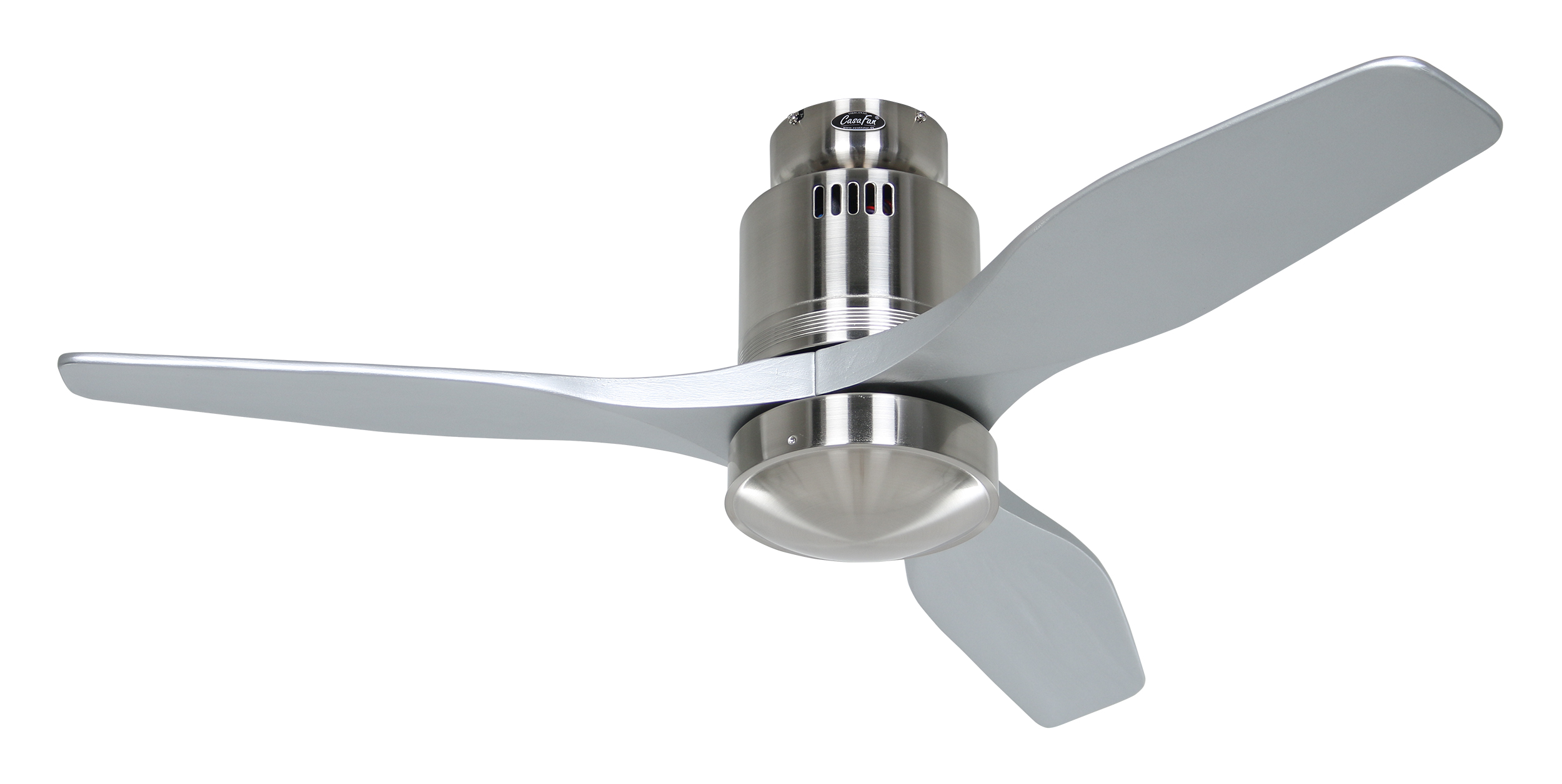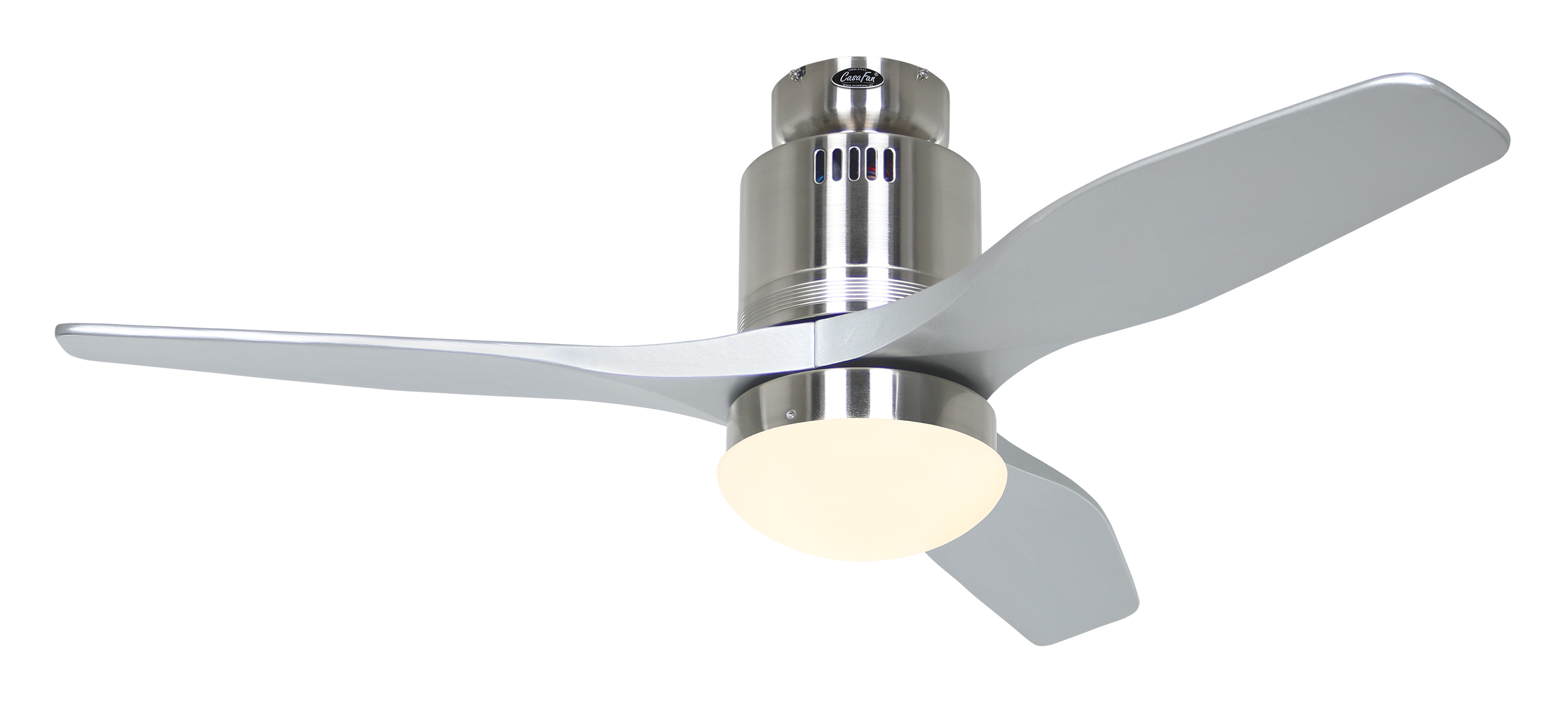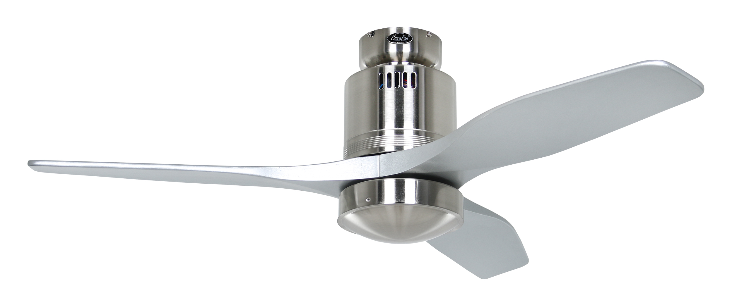 CasaFan AERODYNAMIX ECO 112 BN-SI, Energiespar Deckenventilator, Ø 112 cm, Gehäuse Chrom gebürstet, 3 Flügel Lack silber, handgefertigt, Massivholz gefräst, 220-240 V 50 Hz, DC/EC Motor 3,8-11,3 W, inkl. Funk-Fernbedienung (Motor 6 Stufen, Vor-/Rückwärtslauf - Sommer/Winter -, Licht ein/aus) und Wandhalter, inkl. Milchglasleuchte 2 x 40 W E14 , auch für Energiesparleuchtmittel geeignet, Montage auch ohne Leuchte und mit Blindabdeckung (im Lieferumfang) möglich, Drehzahl max. 72-191 U/min, Abstand Decke - Flügel 250 mm, Montage nur an geraden Decken (mit optionaler Deckenstange an Schrägen bis 28°), gewuchteter Motor und Flügel, für Raumgrößen bis 16 m², Zubehör wie Flügel und längere Deckenstangen erhältlich
