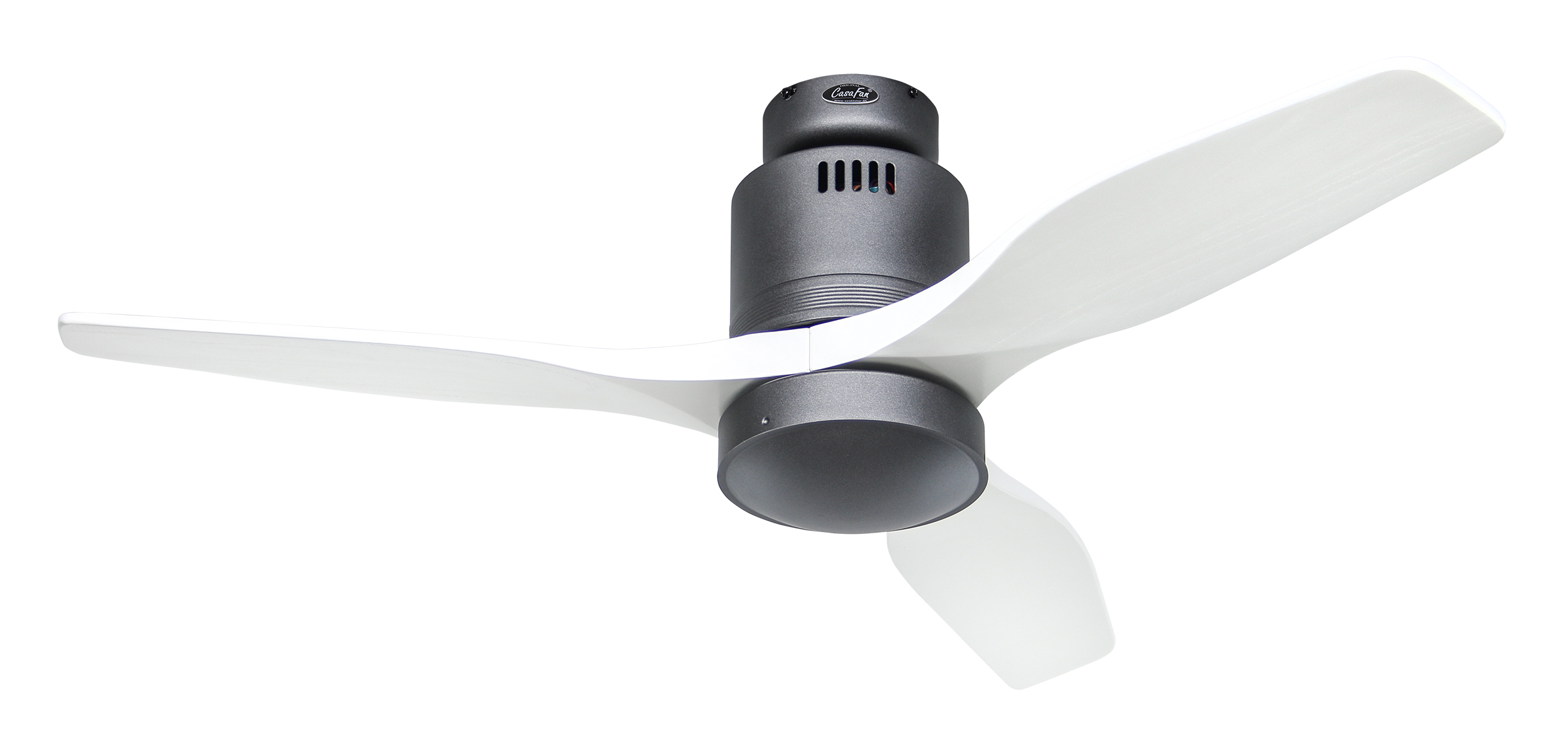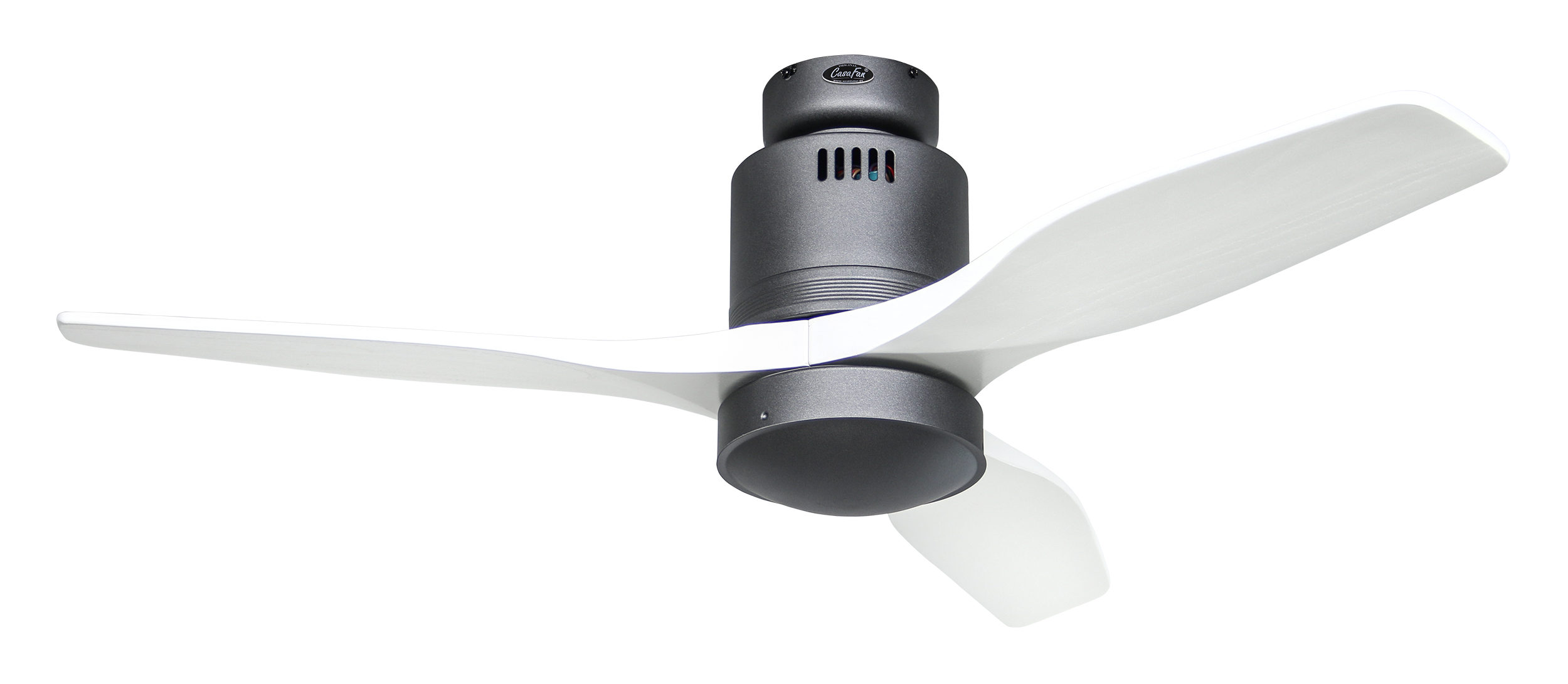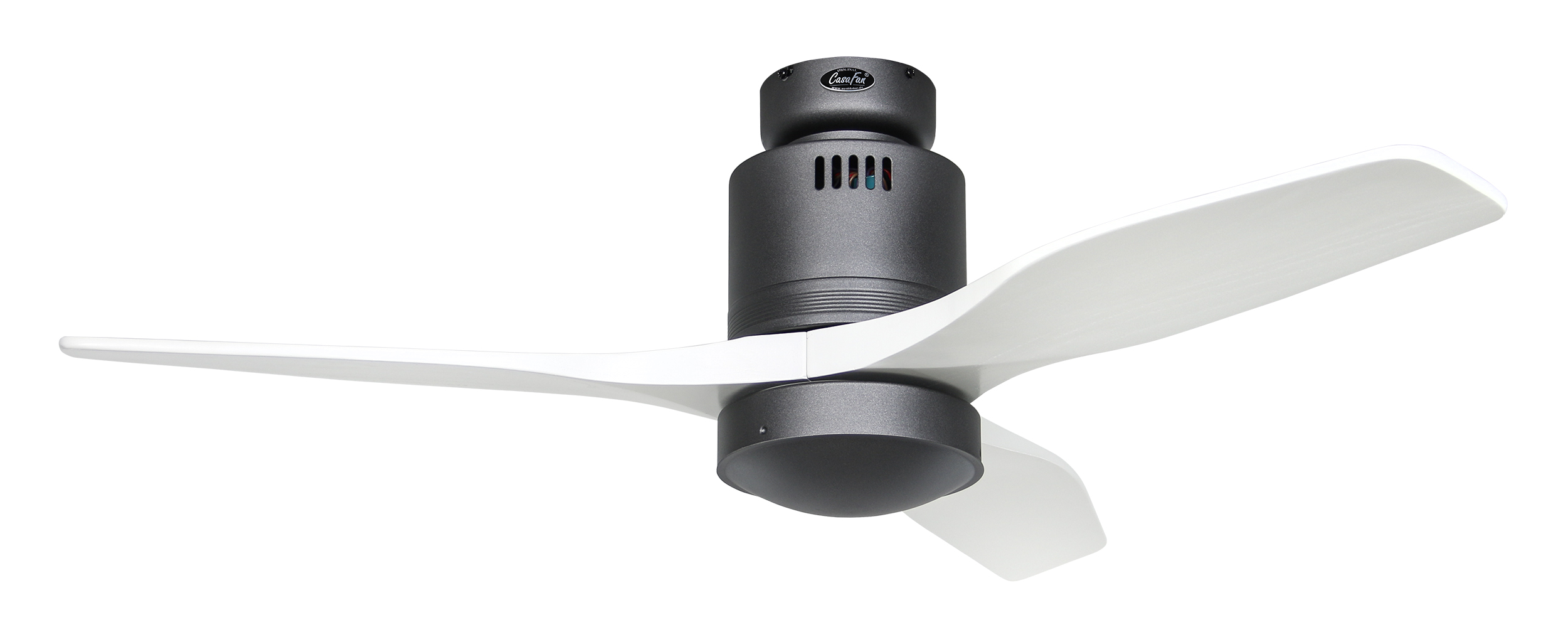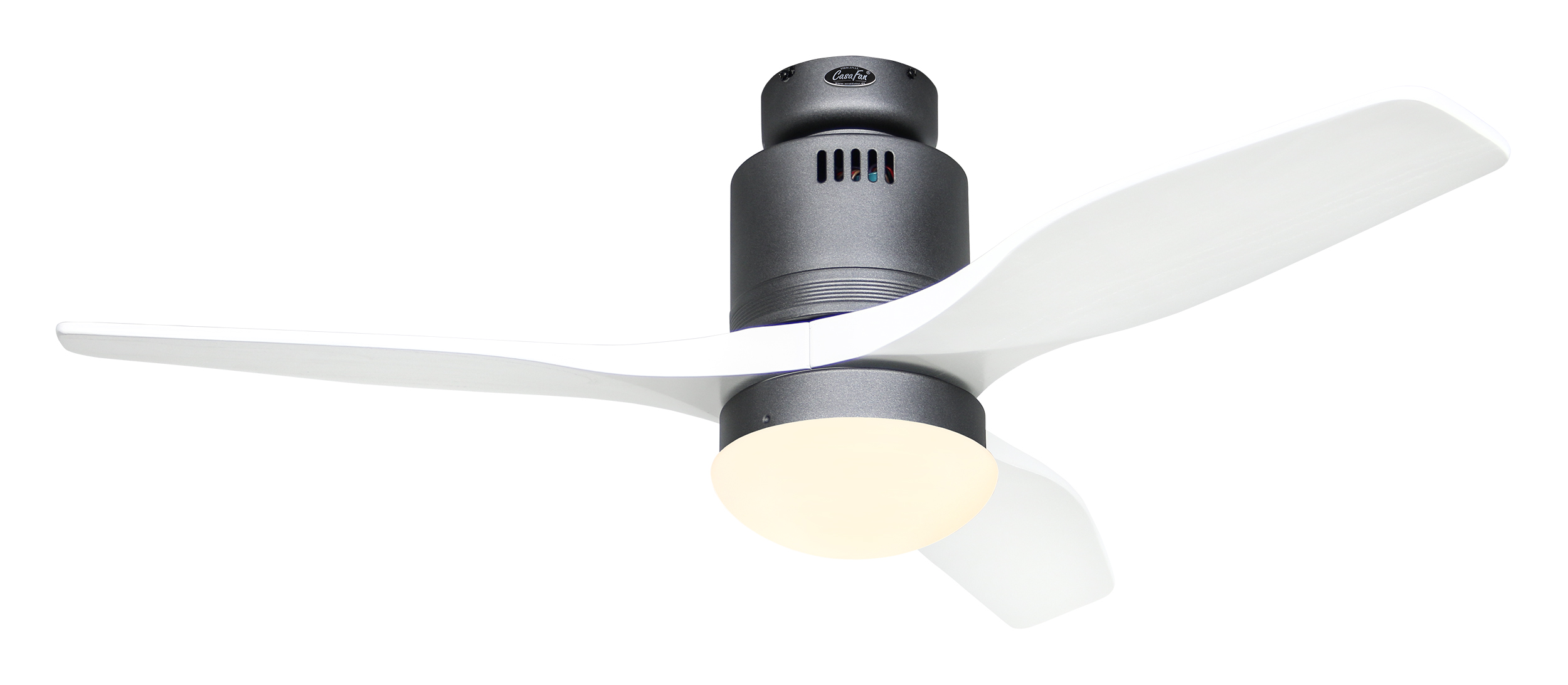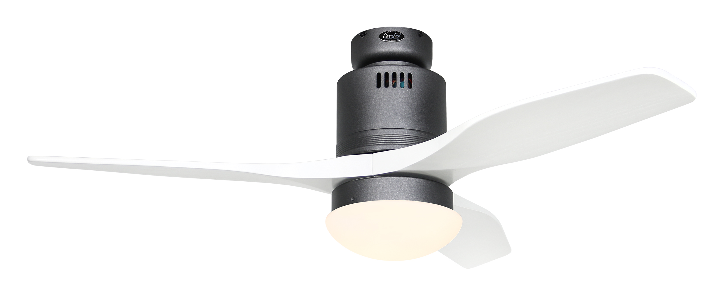 CasaFan AERODYNAMIX ECO 112 BG-WE, Energiespar Deckenventilator, Ø 112 cm, Gehäuse Lack basaltgrau, 3 Flügel Lack weiß, handgefertigt, Massivholz gefräst, 220-240 V 50 Hz, DC/EC Motor 3,8-11,3 W, inkl. Funk-Fernbedienung (Motor 6 Stufen, Vor-/Rückwärtslauf - Sommer/Winter -, Licht ein/aus) und Wandhalter, inkl. Milchglasleuchte 2 x 40 W E14 , auch für Energiesparleuchtmittel geeignet, Montage auch ohne Leuchte und mit Blindabdeckung (im Lieferumfang) möglich, Drehzahl max. 72-191 U/min, Abstand Decke - Flügel 250 mm, Montage nur an geraden Decken (mit optionaler Deckenstange an Schrägen bis 28°), gewuchteter Motor und Flügel, für Raumgrößen bis 16 m², Zubehör wie Flügel und längere Deckenstangen erhältlich