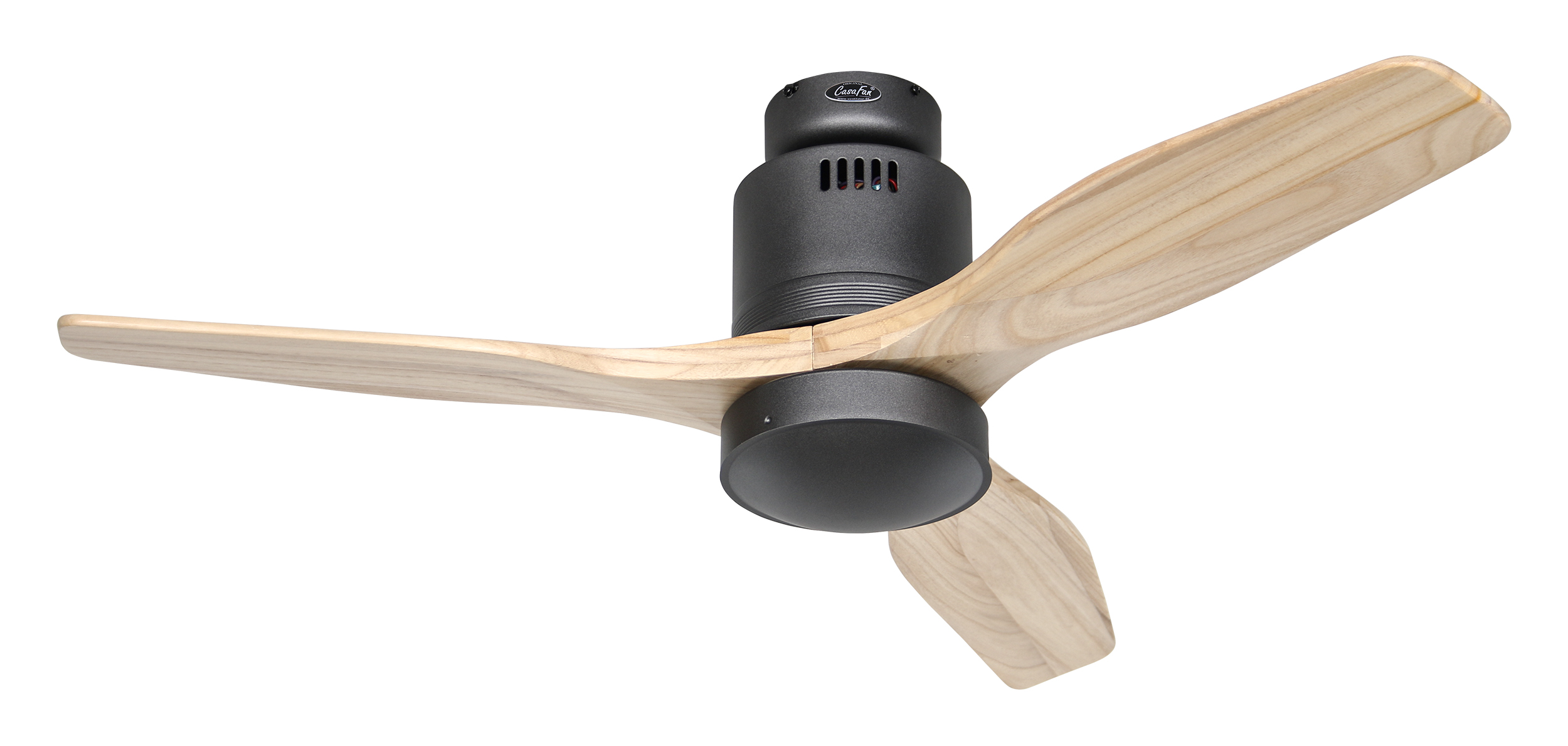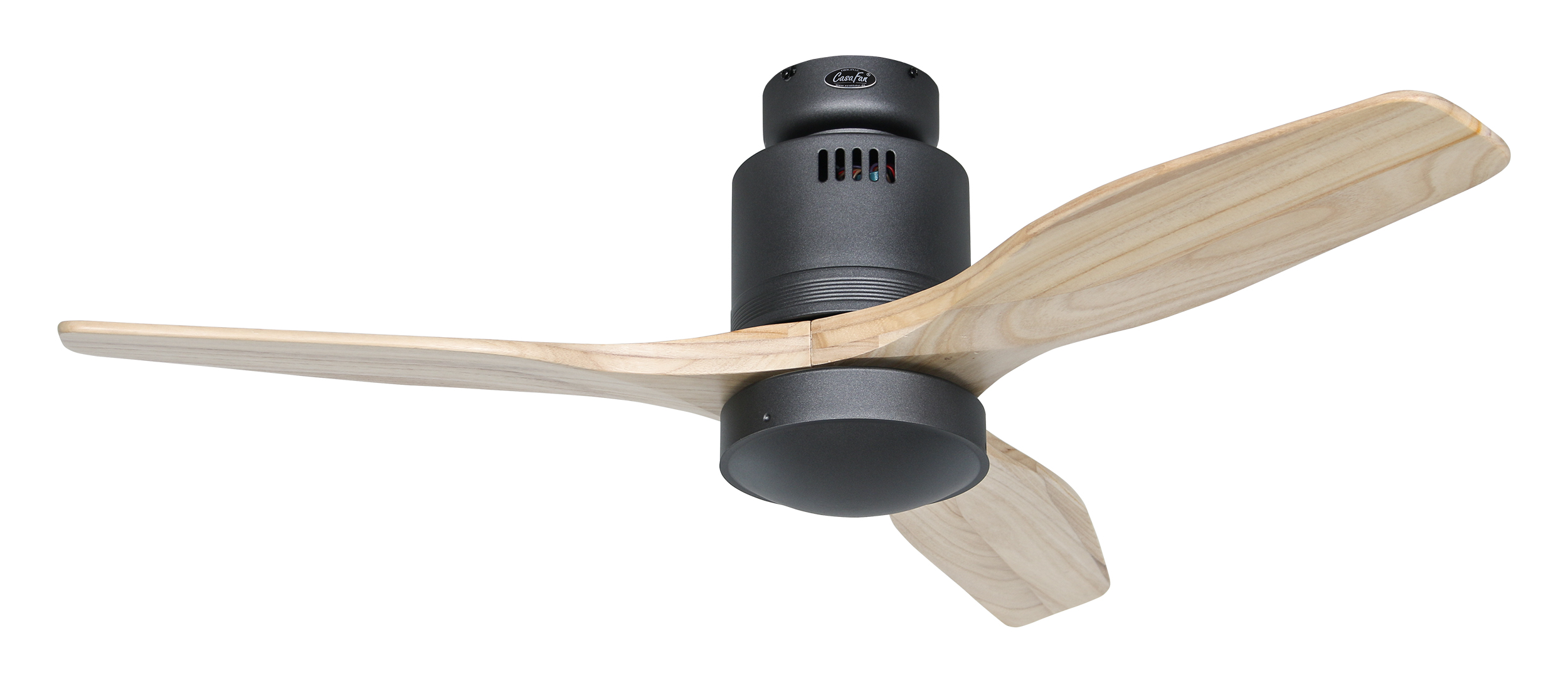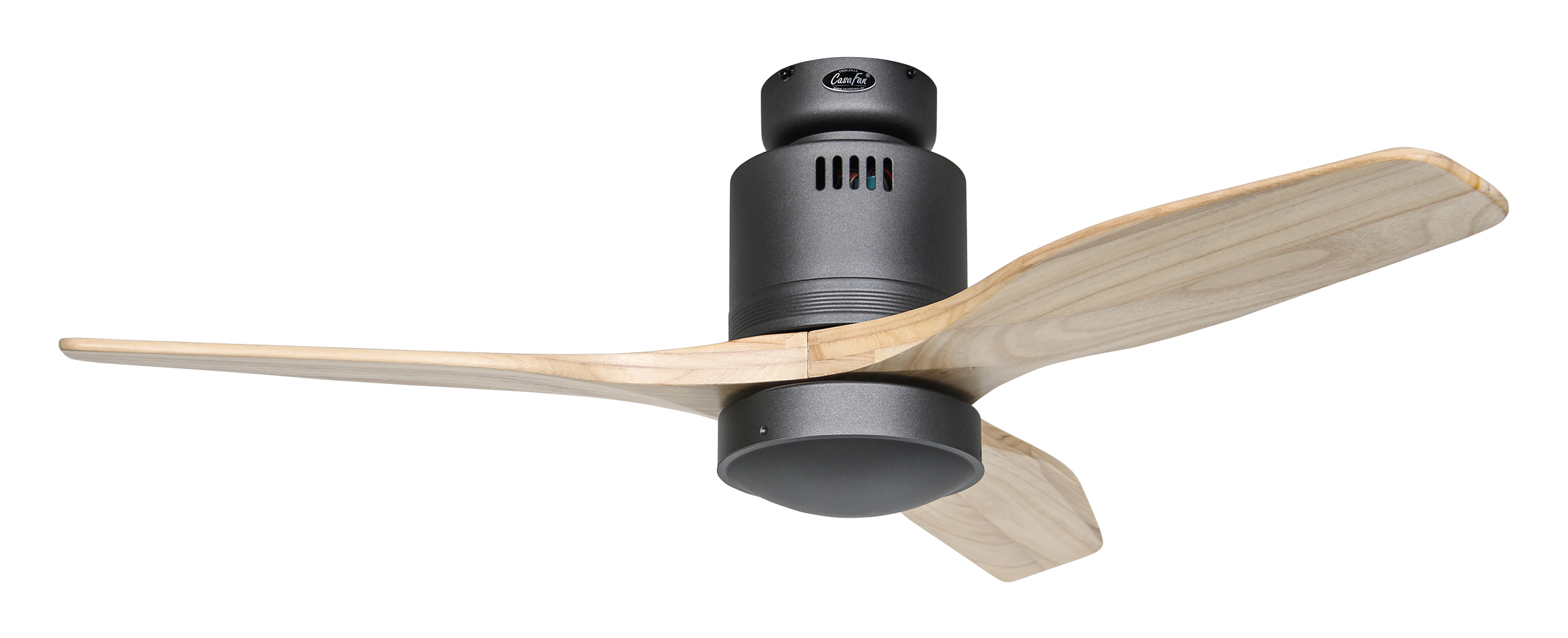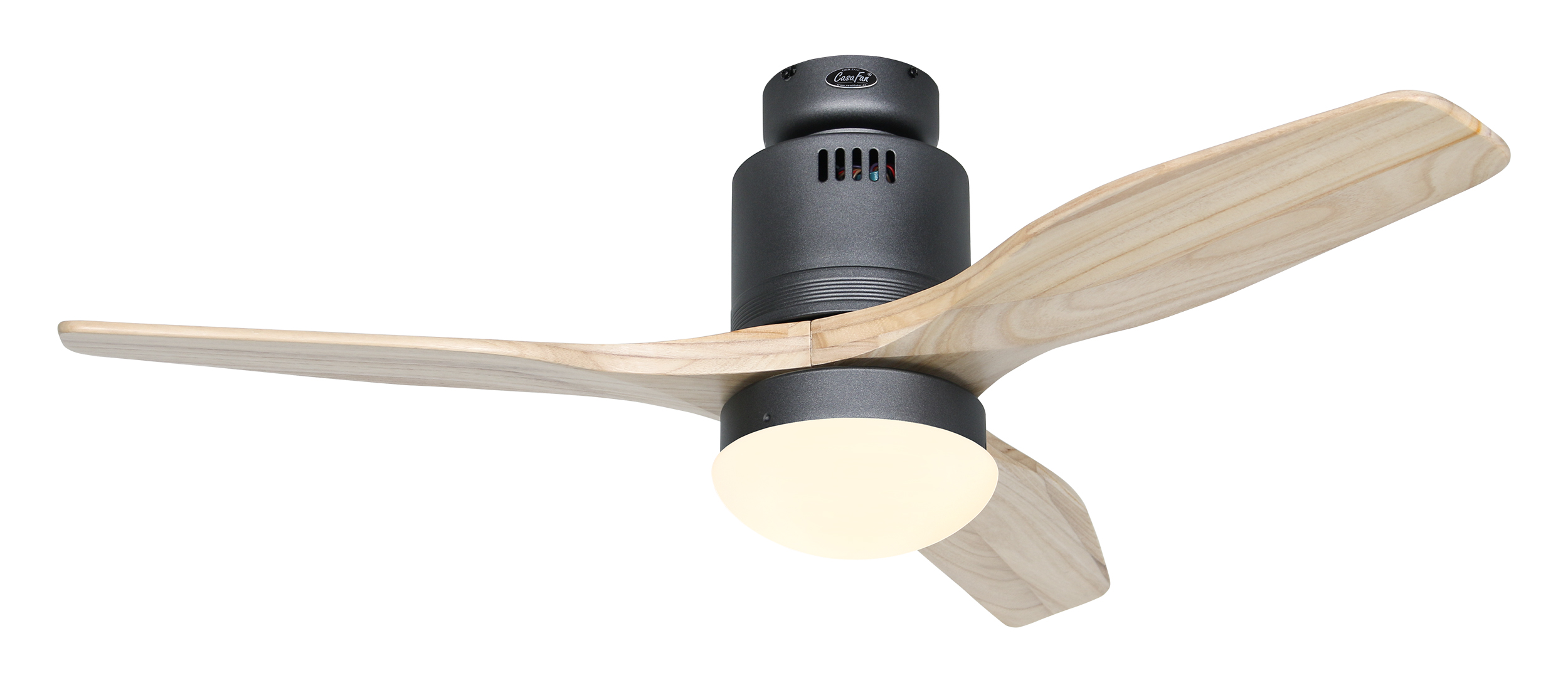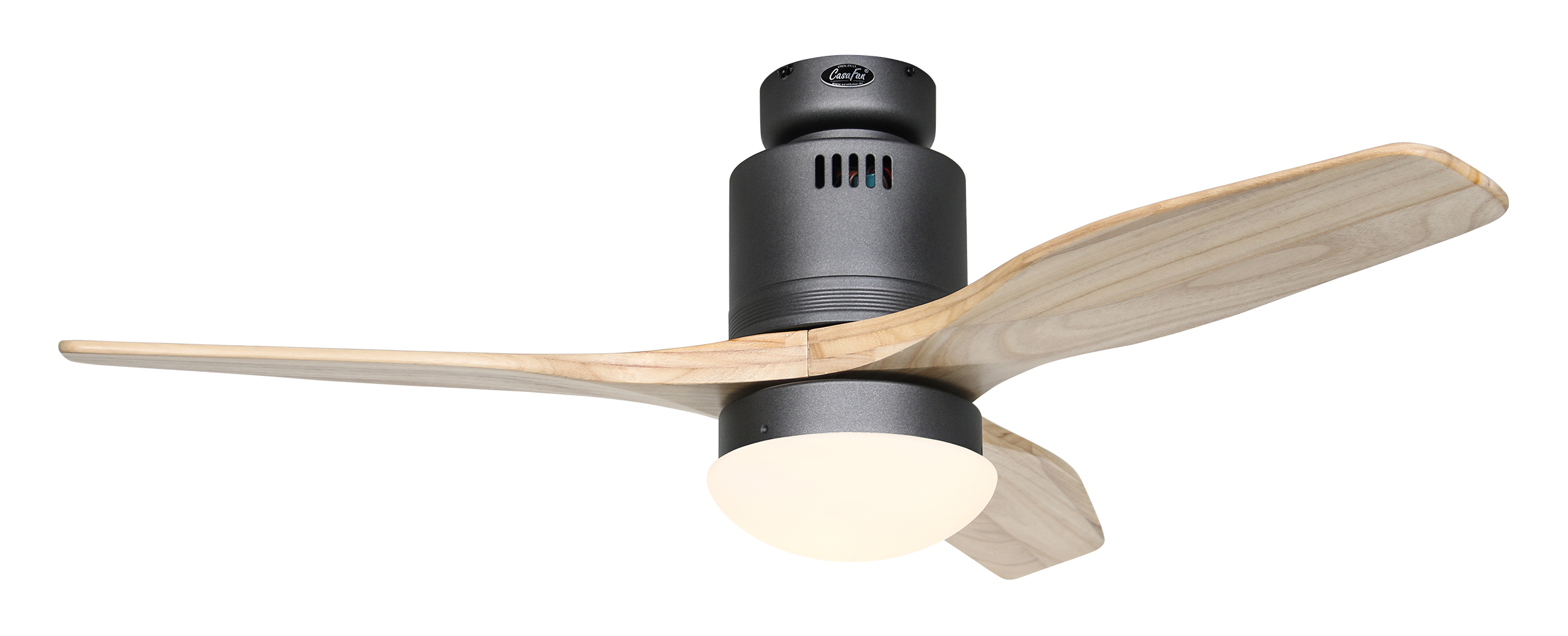 CasaFan AERODYNAMIX ECO 112 BG-NT, Energiespar Deckenventilator, Ø 112 cm, Gehäuse Lack basaltgrau, 3 Flügel Holz natur, handgefertigt, Massivholz gefräst, 220-240 V 50 Hz, DC/EC Motor 3,8-11,3 W, inkl. Funk-Fernbedienung (Motor 6 Stufen, Vor-/Rückwärtslauf - Sommer/Winter -, Licht ein/aus) und Wandhalter, inkl. Milchglasleuchte 2 x 40 W E14 , auch für Energiesparleuchtmittel geeignet, Montage auch ohne Leuchte und mit Blindabdeckung (im Lieferumfang) möglich, Drehzahl max. 72-191 U/min, Abstand Decke - Flügel 250 mm, Montage nur an geraden Decken (mit optionaler Deckenstange an Schrägen bis 28°), gewuchteter Motor und Flügel, für Raumgrößen bis 16 m², Zubehör wie Flügel und längere Deckenstangen erhältlich