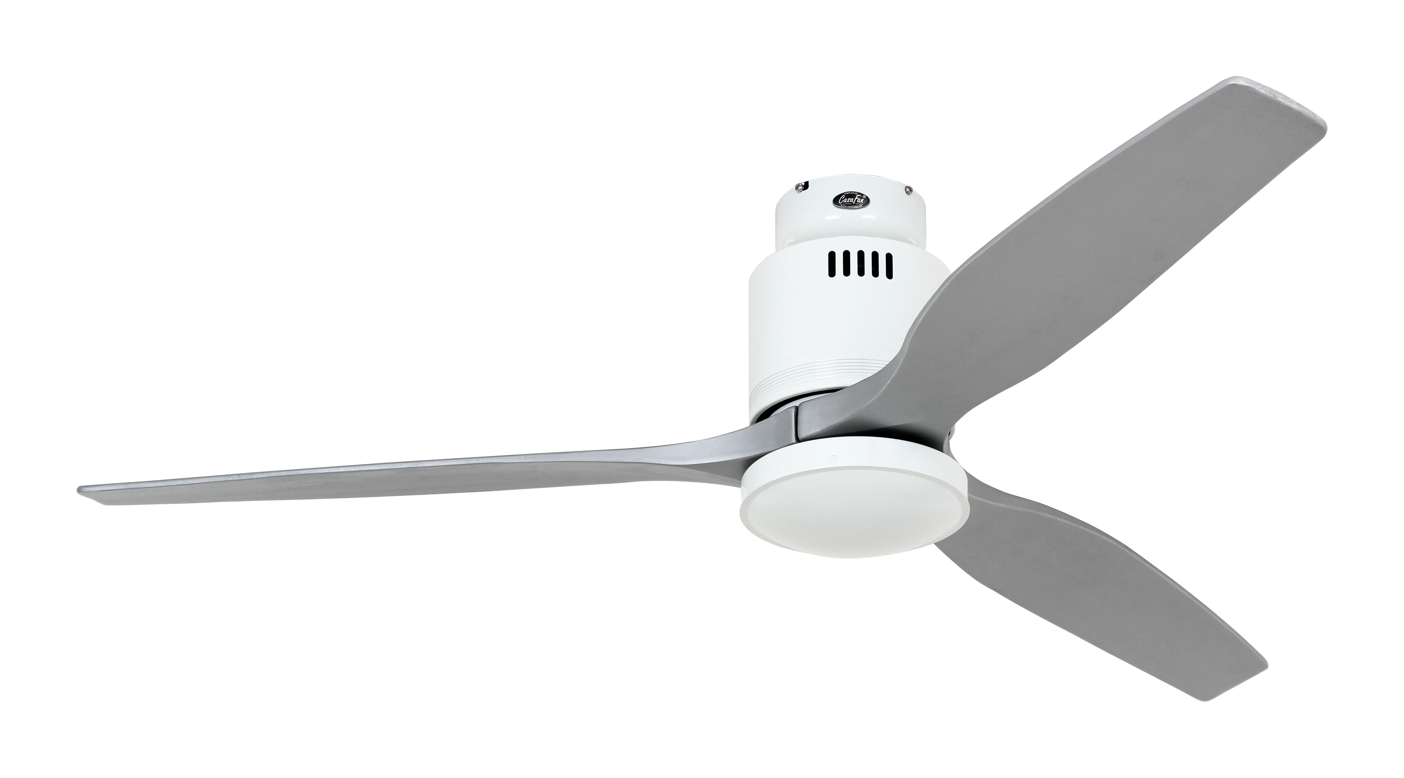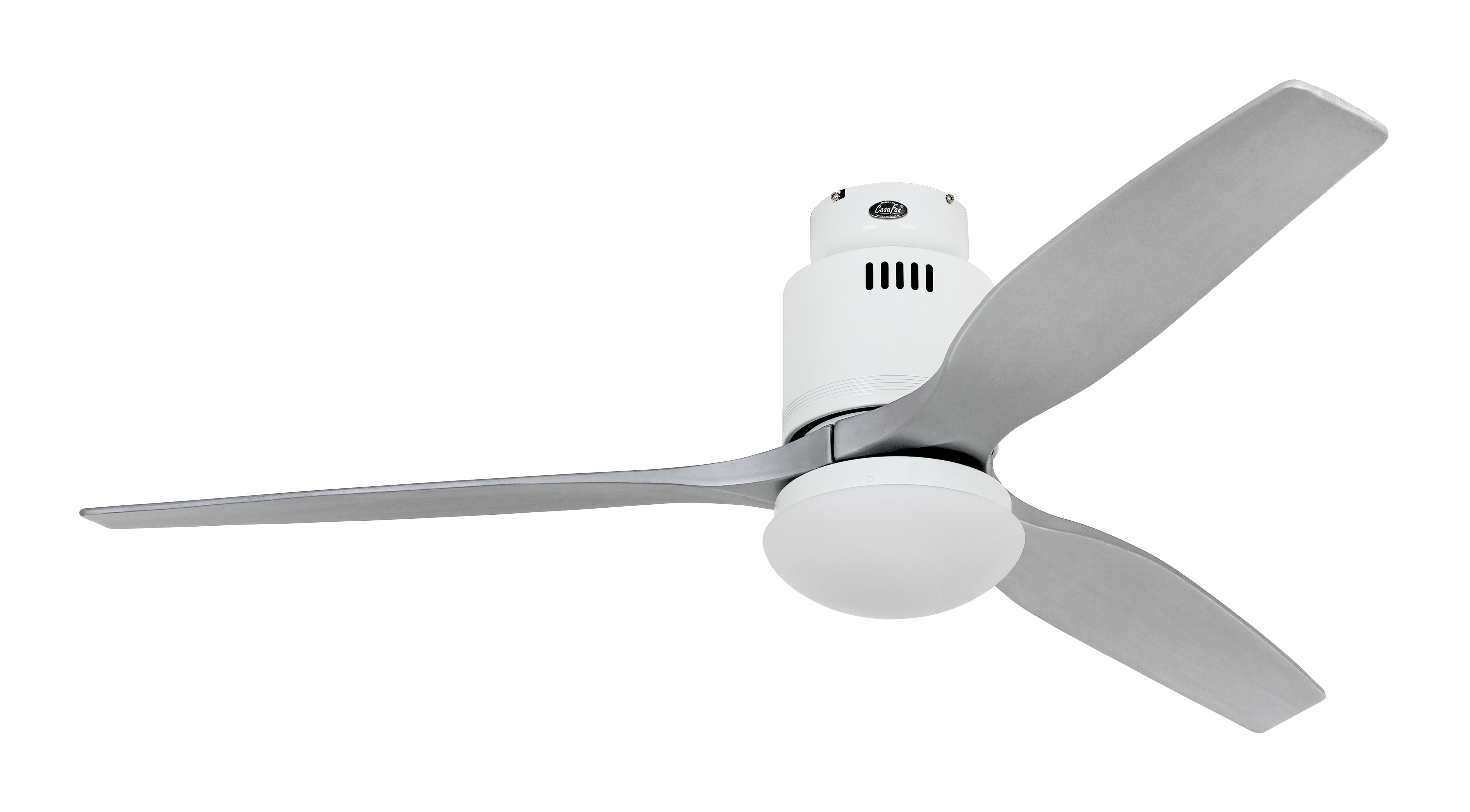 CasaFan AERODYNAMIX ECO 132 WE-SI, Energiespar Deckenventilator, Ø 132 cm, Gehäuse Lack weiß, 3 Flügel Lack silber, handgefertigt, Massivholz gefräst, 220-240 V 50 Hz, DC/EC Motor 3,8-20 W, inkl. Funk-Fernbedienung (Motor 6 Stufen, Vor-/Rückwärtslauf - Sommer/Winter -, Licht ein/aus) und Wandhalter, inkl. Milchglasleuchte 2 x 40 W E14 , auch für Energiesparleuchtmittel geeignet, Montage auch ohne Leuchte und mit Blindabdeckung (im Lieferumfang) möglich, Drehzahl max. 72-188 U/min, Abstand Decke - Flügel 250 mm, Montage nur an geraden Decken (mit optionaler Deckenstange an Schrägen bis 28°), gewuchteter Motor und Flügel, für Raumgrößen bis 25 m², Zubehör wie Flügel und längere Deckenstangen erhältlich