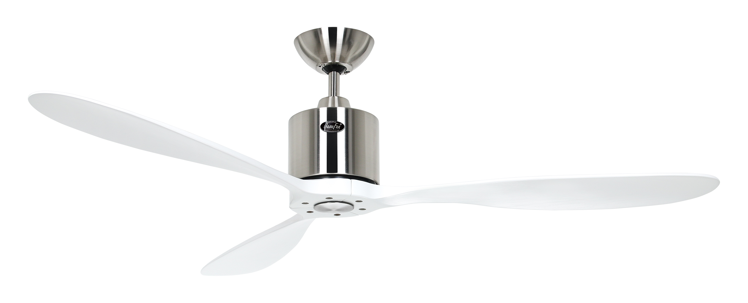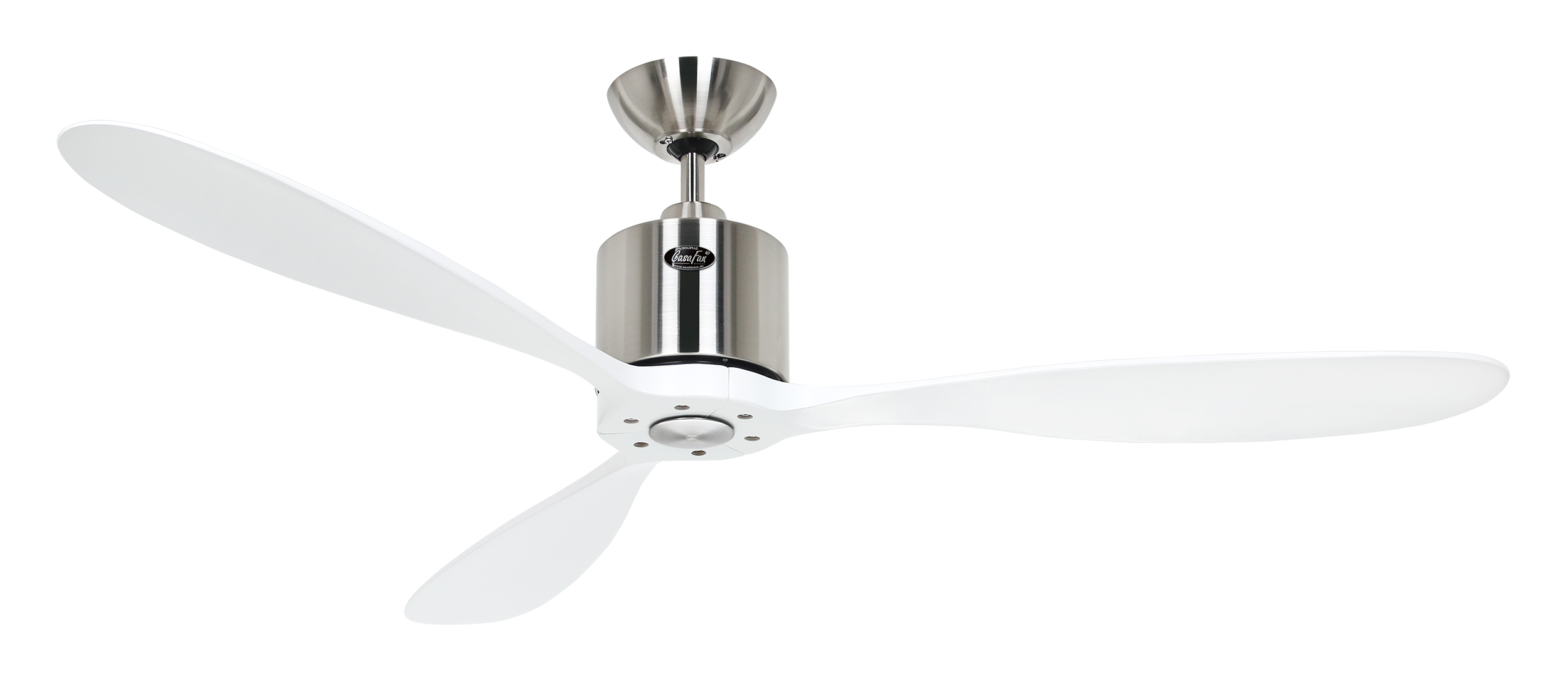CasaFan AEROPLAN ECO BN-WE, Energiespar Deckenventilator, Ø 132 cm, Gehäuse Chrom gebürstet, 3 Flügel Lack weiß, Massivholz gefräst, 100-240 V 50-60 Hz, DC/EC Motor 2,7-27 W, inkl. Funk-Fernbedienung (Motor 6 Stufen, Vor-/Rückwärtslauf - Sommer/Winter -, Schlaftimer) und Wandhalter, Zeitlupenstufe, Drehzahl max. 30-226 U/min, inkl. 2 Deckenstangen (100 und 60 mm), Abstand Decke - Flügel 310 mm (270 mm mit kurzer Deckenstange), Montage an Schrägen bis 30°, gewuchteter Motor und Flügel, für Raumgrößen bis 25 m², Zubehör wie längere Deckenstangen erhältlich