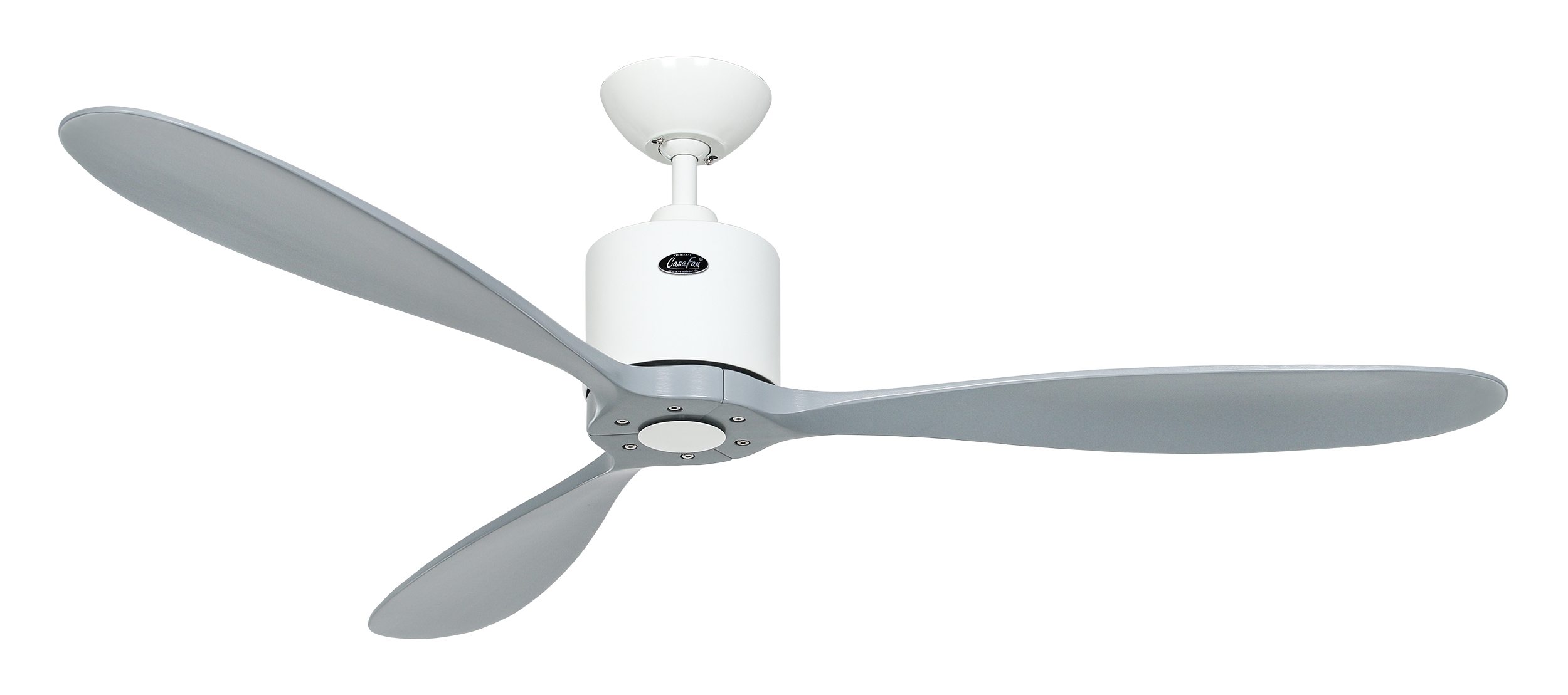 CasaFan AEROPLAN ECO WE-LG, Energiespar Deckenventilator, Ø 132 cm, Gehäuse Lack weiß, 3 Flügel Lack lichtgrau, Massivholz gefräst, 100-240 V 50-60 Hz, DC/EC Motor 2,7-27 W, inkl. Funk-Fernbedienung (Motor 6 Stufen, Vor-/Rückwärtslauf - Sommer/Winter -, Schlaftimer) und Wandhalter, Zeitlupenstufe, Drehzahl max. 30-226 U/min, inkl. 2 Deckenstangen (100 und 60 mm), Abstand Decke - Flügel 310 mm (270 mm mit kurzer Deckenstange), Montage an Schrägen bis 30°, gewuchteter Motor und Flügel, für Raumgrößen bis 25 m², Zubehör wie längere Deckenstangen erhältlich