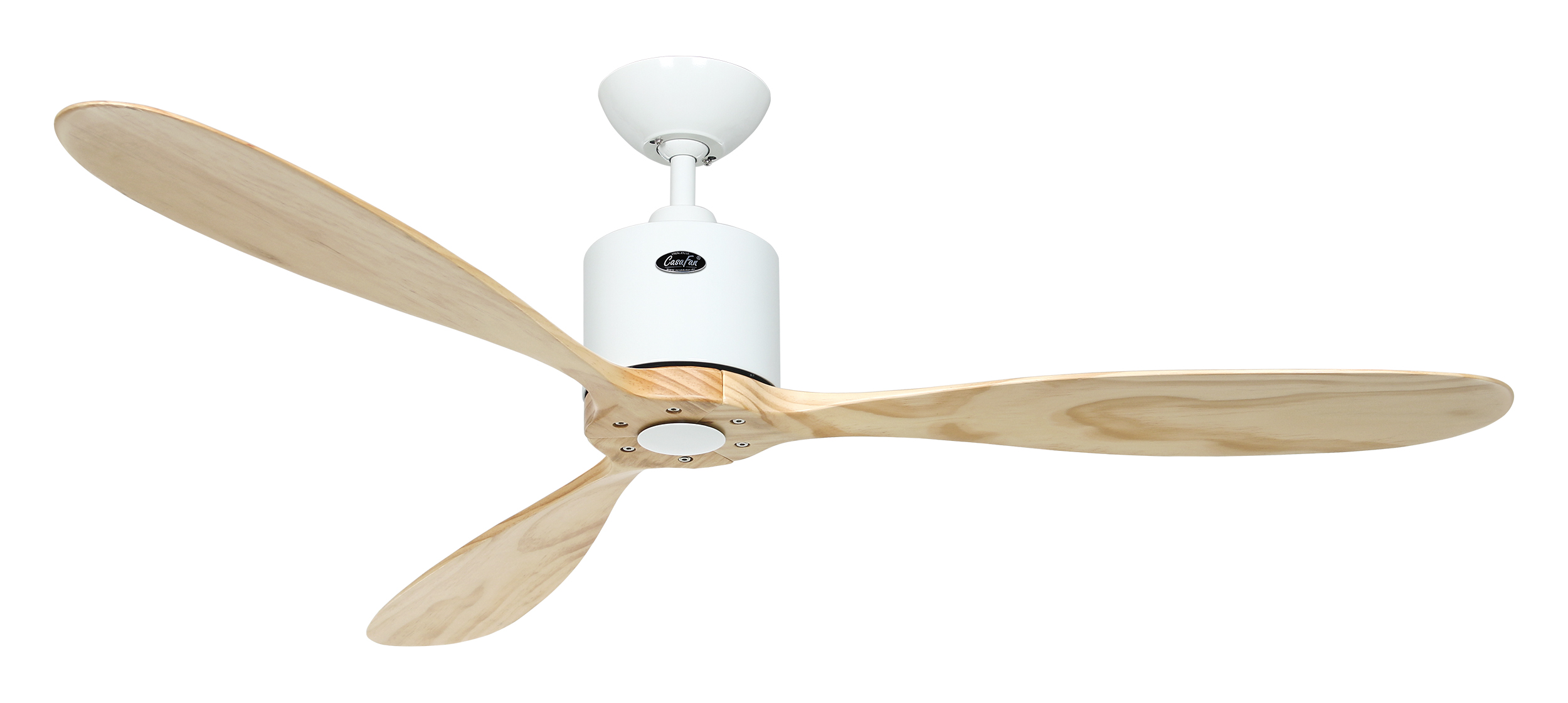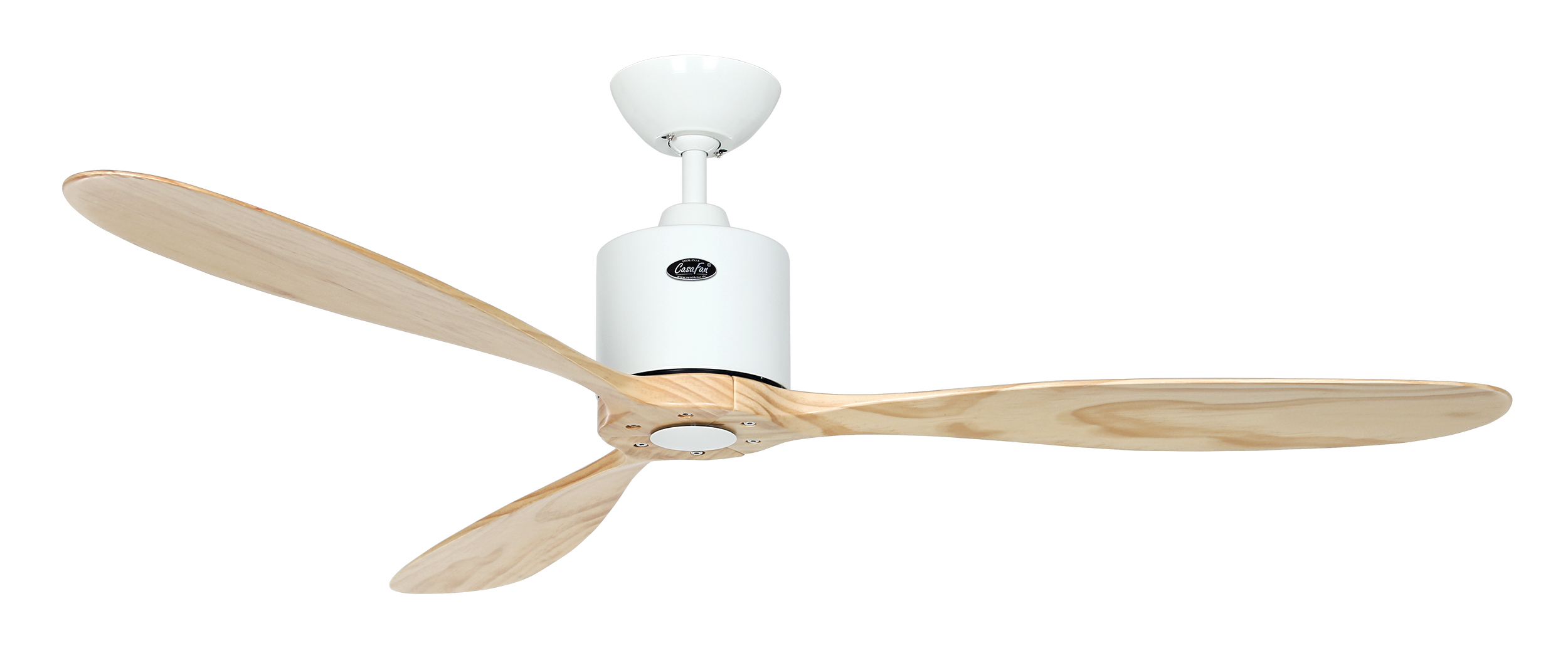 CasaFan AEROPLAN ECO WE-NT, Energiespar Deckenventilator, Ø 132 cm, Gehäuse Lack weiß, 3 Flügel Holz natur, Massivholz gefräst, 100-240 V 50-60 Hz, DC/EC Motor 2,7-27 W, inkl. Funk-Fernbedienung (Motor 6 Stufen, Vor-/Rückwärtslauf - Sommer/Winter -, Schlaftimer) und Wandhalter, Zeitlupenstufe, Drehzahl max. 30-226 U/min, inkl. 2 Deckenstangen (100 und 60 mm), Abstand Decke - Flügel 310 mm (270 mm mit kurzer Deckenstange), Montage an Schrägen bis 30°, gewuchteter Motor und Flügel, für Raumgrößen bis 25 m², Zubehör wie längere Deckenstangen erhältlich