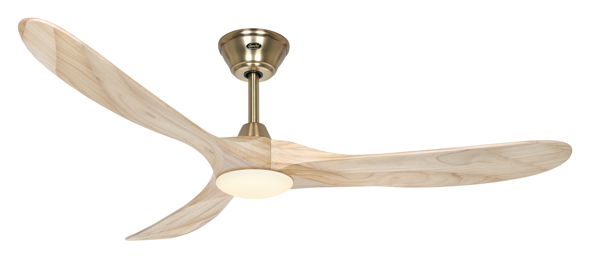 CasaFan ECO GENUINO-L 152 MG-NT, Energiespar Deckenventilator, Ø 152 cm, Gehäuse Messing gebürstet, 3 Flügel Holz natur, gefräst aus schichtverleimtem Massivholz, 220-240 V 50 Hz, DC/EC Motor 3,3-16,5 W, inkl. Funk-Fernbedienung (Motor 6 Stufen, Vor-/Rückwärtslauf - Sommer/Winter -, Licht ein/aus/dimmen) und Wandhalter, Zeitlupenstufe, inkl. LED-Leuchte 17 W LED-Modul , Lichtfarbe warmweiß, 3.000 K, 1.800 lm, Abstrahlwinkel 120°, Lebensdauer 20.000 h, CRI 80, dimmbar, Drehzahl max. 50-144 U/min, inkl. 1 Deckenstange (200 mm), Abstand Decke - Flügel 390 mm (290 mm mit kurzer Deckenstange), Montage an Schrägen bis 18°, gewuchteter Motor und Flügel, für Raumgrößen bis 35 m², Zubehör wie längere Deckenstangen erhältlich. Die Leuchte enthält eingebaute LED-Lampen. Einzelne LEDs können in der Leuchte nicht ausgetauscht werden. Ersatz-LED-Module für Reparaturen sind verfügbar.