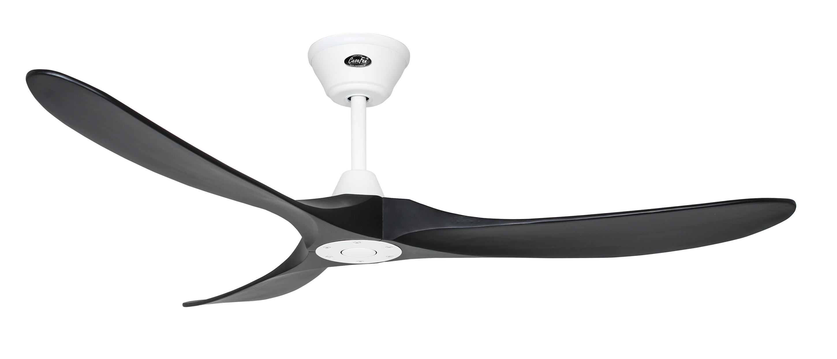 CasaFan ECO GENUINO 152 MW-MS, Energiespar Deckenventilator, Ø 152 cm, Gehäuse Lack matt weiß, 3 Flügel Lack matt schwarz, gefräst aus schichtverleimtem Massivholz, 220-240 V 50 Hz, DC/EC Motor 3,3-16,6 W, inkl. Funk-Fernbedienung (Motor 6 Stufen, Vor-/Rückwärtslauf - Sommer/Winter -) und Wandhalter, Zeitlupenstufe, Drehzahl max. 50-143 U/min, inkl. 1 Deckenstange (200 mm), Abstand Decke - Flügel 360 mm (280 mm mit gekürzter Deckenstange), Montage an Schrägen bis 12°, gewuchteter Motor und Flügel, für Raumgrößen bis 35 m², Zubehör wie längere Deckenstangen erhältlich