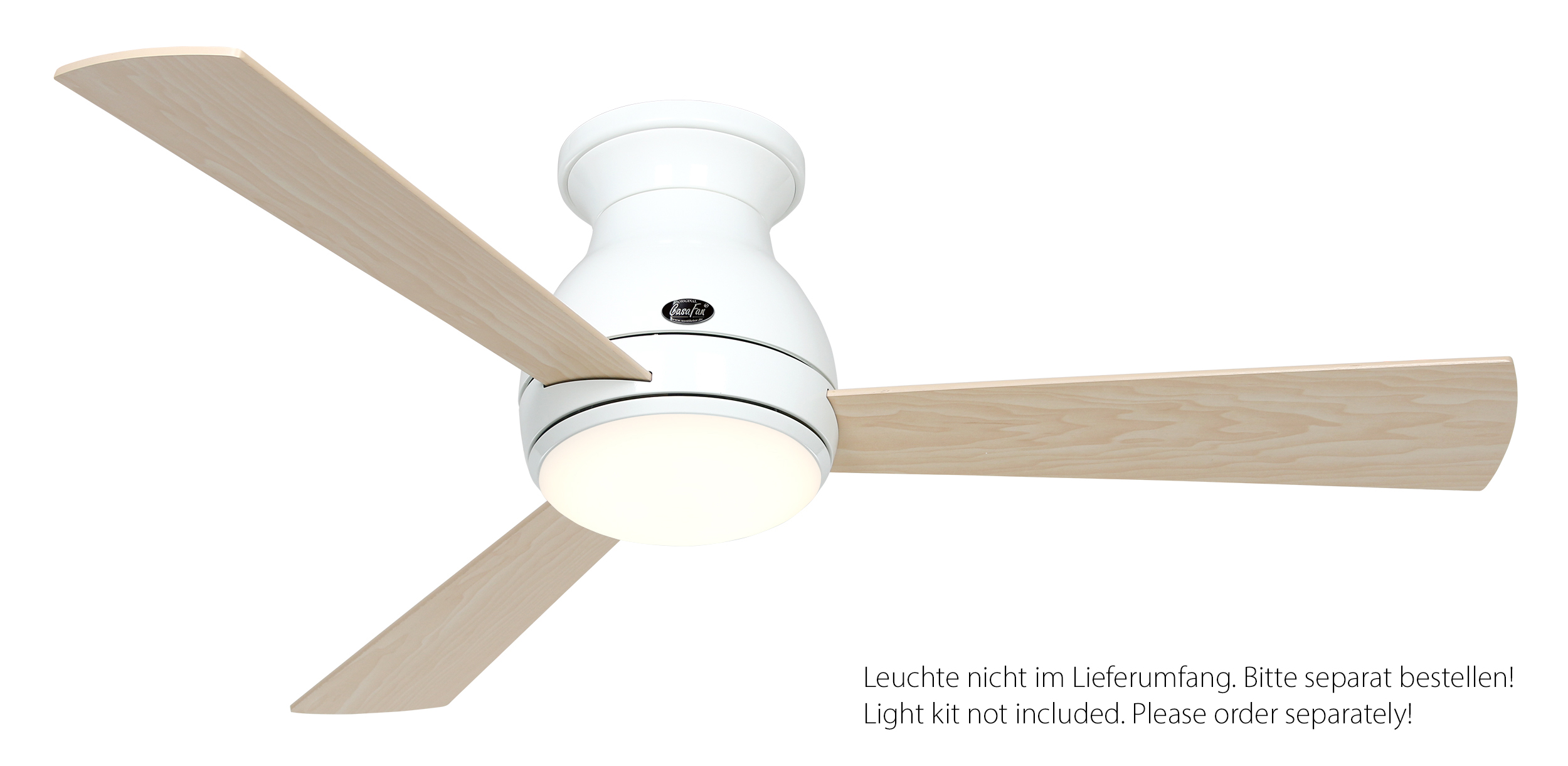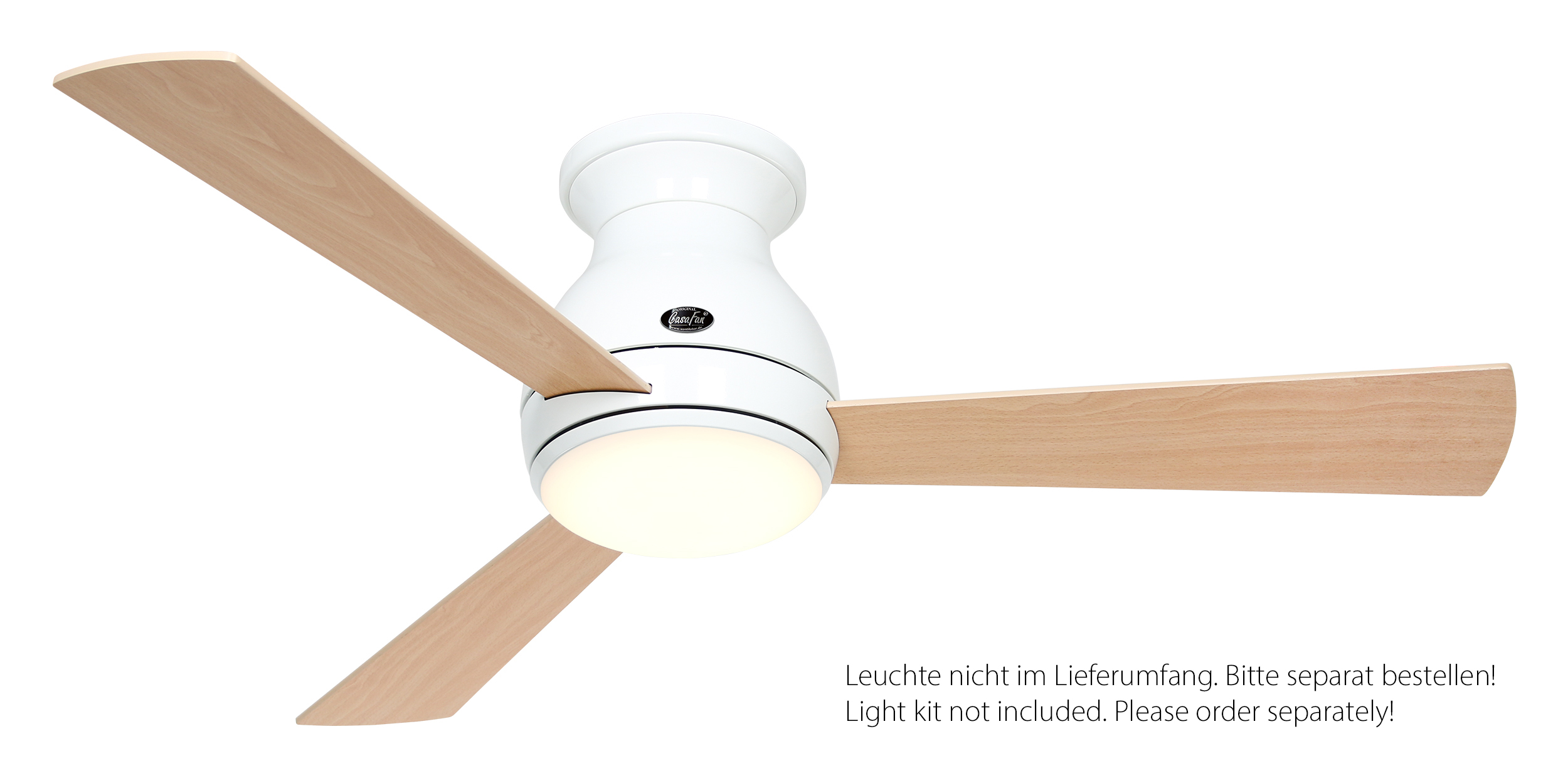 CasaFan Eco PALLAS 116 WE-AH/BU 0 - 10 V, Energiespar Deckenventilator, Ø 116 cm, Gehäuse Lack weiß, 3 Wendeflügel Ahorn/Buche, 100-240 V 50-60 Hz, DC/EC Motor 1-20 W, inkl. Funk-Fernbedienung (Motor 6 Stufen, Lichtdimmung, Vor-/Rückwärtslauf - Sommer/Winter -, Schlaftimer) und Wandhalter, Zeitlupenstufe, Drehzahl max 31-210 U/min, Abstand Decke - Flügel 245 mm, extraflach, Montage nur an geraden Decken, gewuchteter Motor und Flügel, für Raumgrößen bis 14 m², Zubehör wie passende Leuchten erhältlich