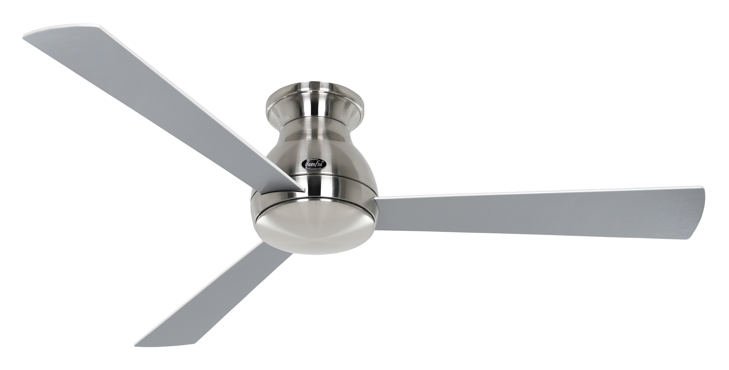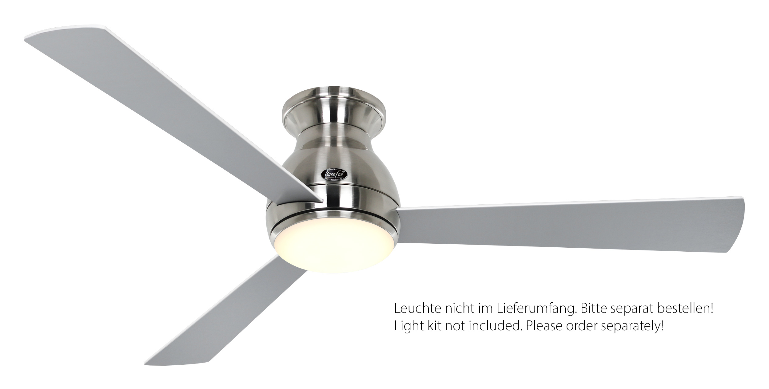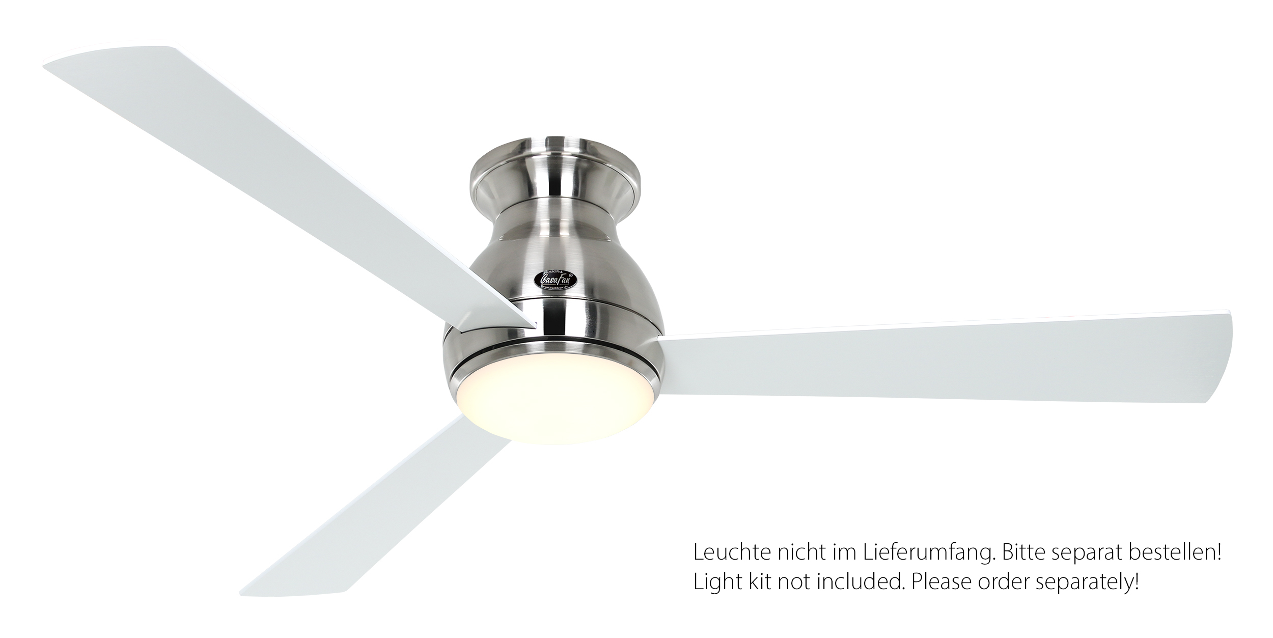 CasaFan ECO PALLAS 142 BN-WE/LG, Energiespar Deckenventilator, Ø 142 cm, Gehäuse Chrom gebürstet, 3 Wendeflügel Lack weiß/Lack lichtgrau, 100-240 V 50-60 Hz, DC/EC Motor 1,1-27 W, inkl. Funk-Fernbedienung (Motor 6 Stufen, Lichtdimmung, Vor-/Rückwärtslauf - Sommer/Winter -, Schlaftimer) und Wandhalter, Zeitlupenstufe, Drehzahl max 30-180 U/min, Abstand Decke - Flügel 245 mm, extraflach, Montage nur an geraden Decken, gewuchteter Motor und Flügel, für Raumgrößen bis 20 m², Zubehör wie passende Leuchten erhältlich