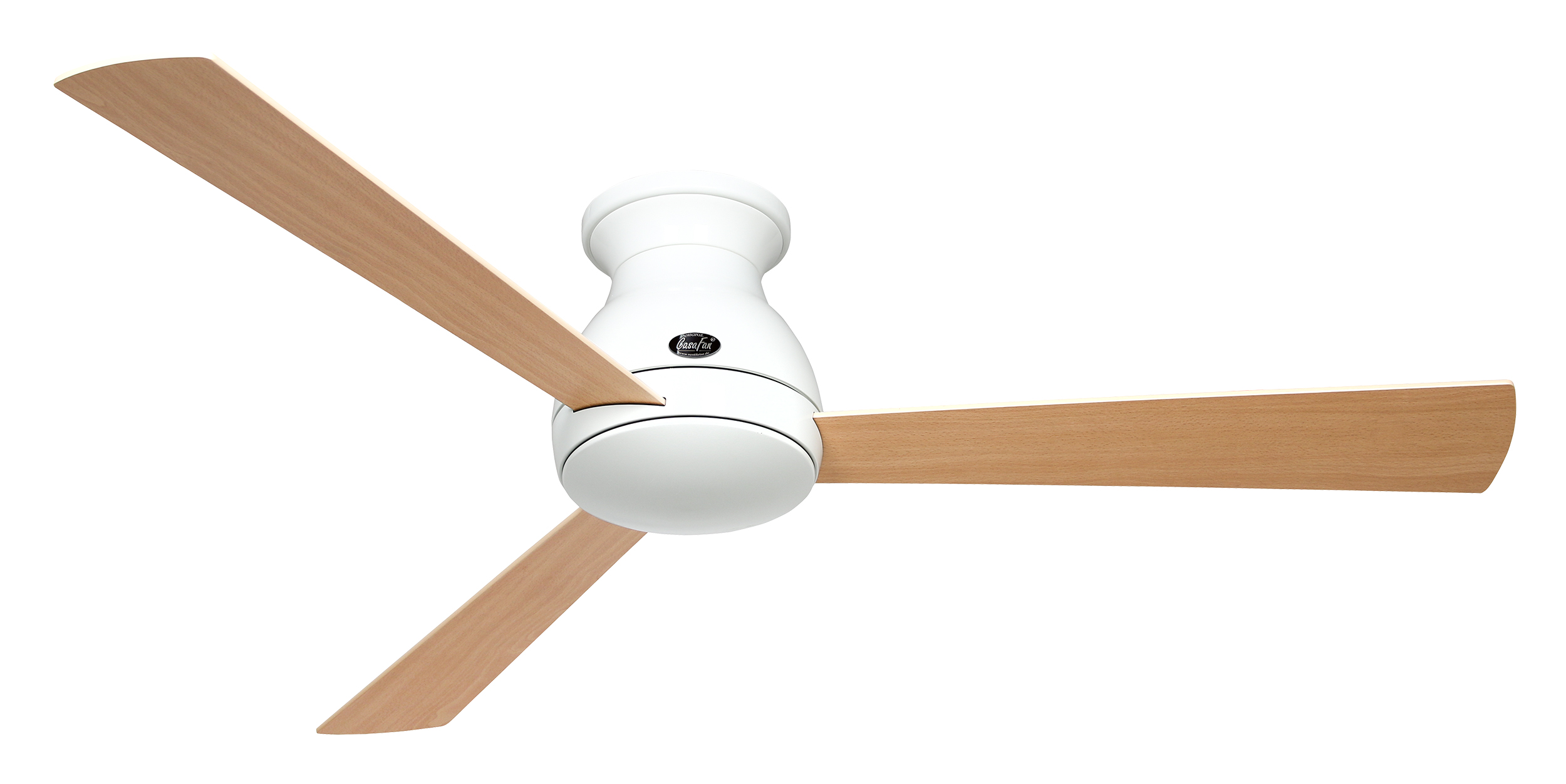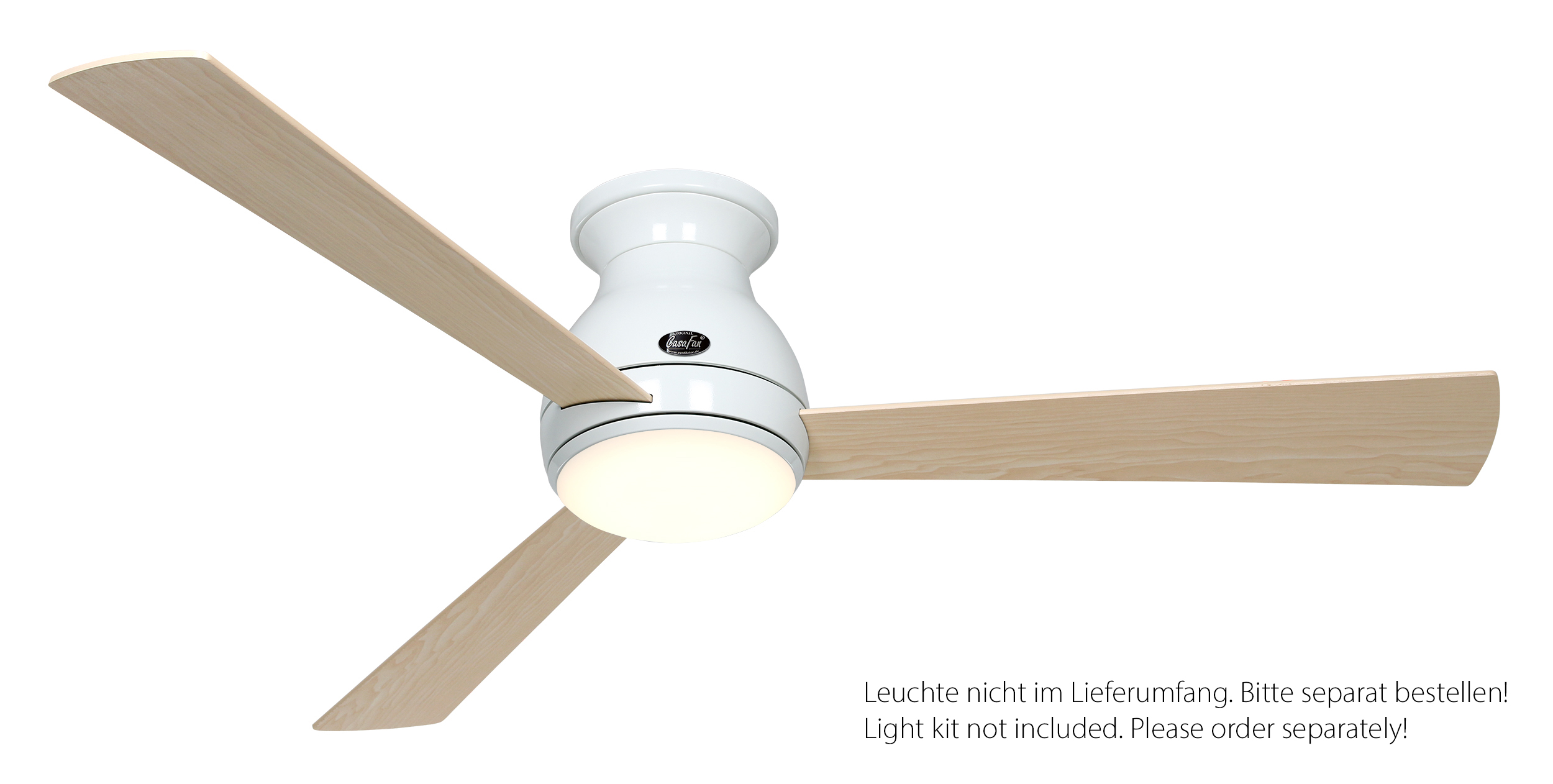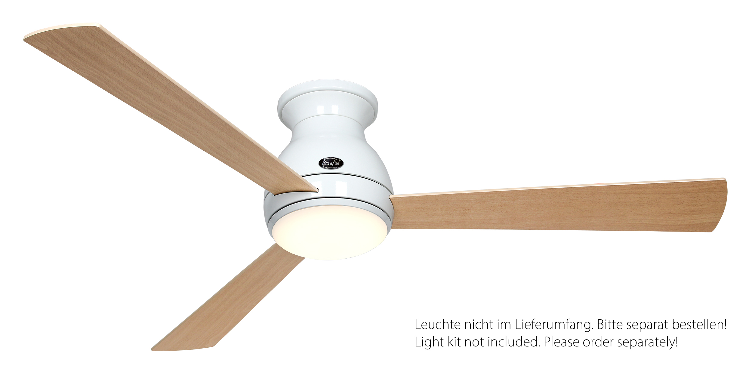 CasaFan ECO PALLAS 142 WE-AH/BU, Energiespar Deckenventilator, Ø 142 cm, Gehäuse Lack weiß, 3 Wendeflügel Ahorn/Buche, 100-240 V 50-60 Hz, DC/EC Motor 1,1-27 W, inkl. Funk-Fernbedienung (Motor 6 Stufen, Lichtdimmung, Vor-/Rückwärtslauf - Sommer/Winter -, Schlaftimer) und Wandhalter, Zeitlupenstufe, Drehzahl max 30-180 U/min, Abstand Decke - Flügel 245 mm, extraflach, Montage nur an geraden Decken, gewuchteter Motor und Flügel, für Raumgrößen bis 20 m², Zubehör wie passende Leuchten erhältlich