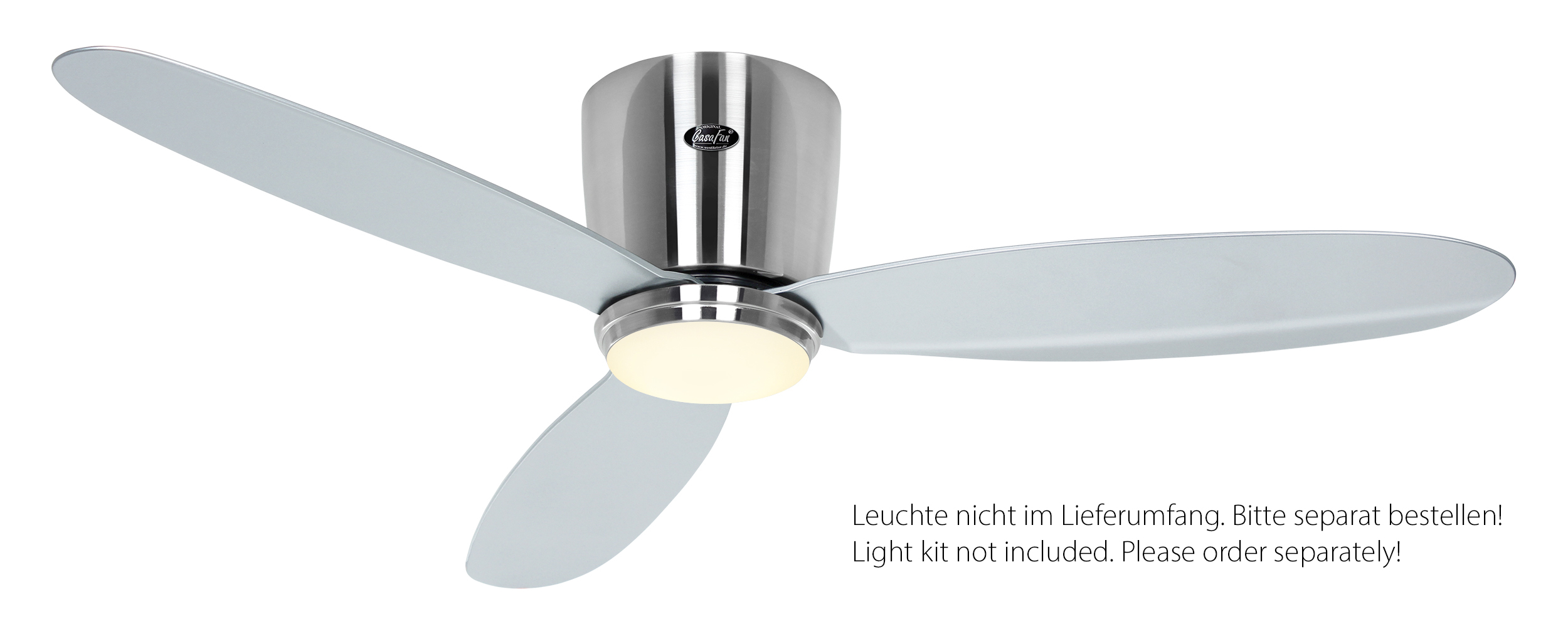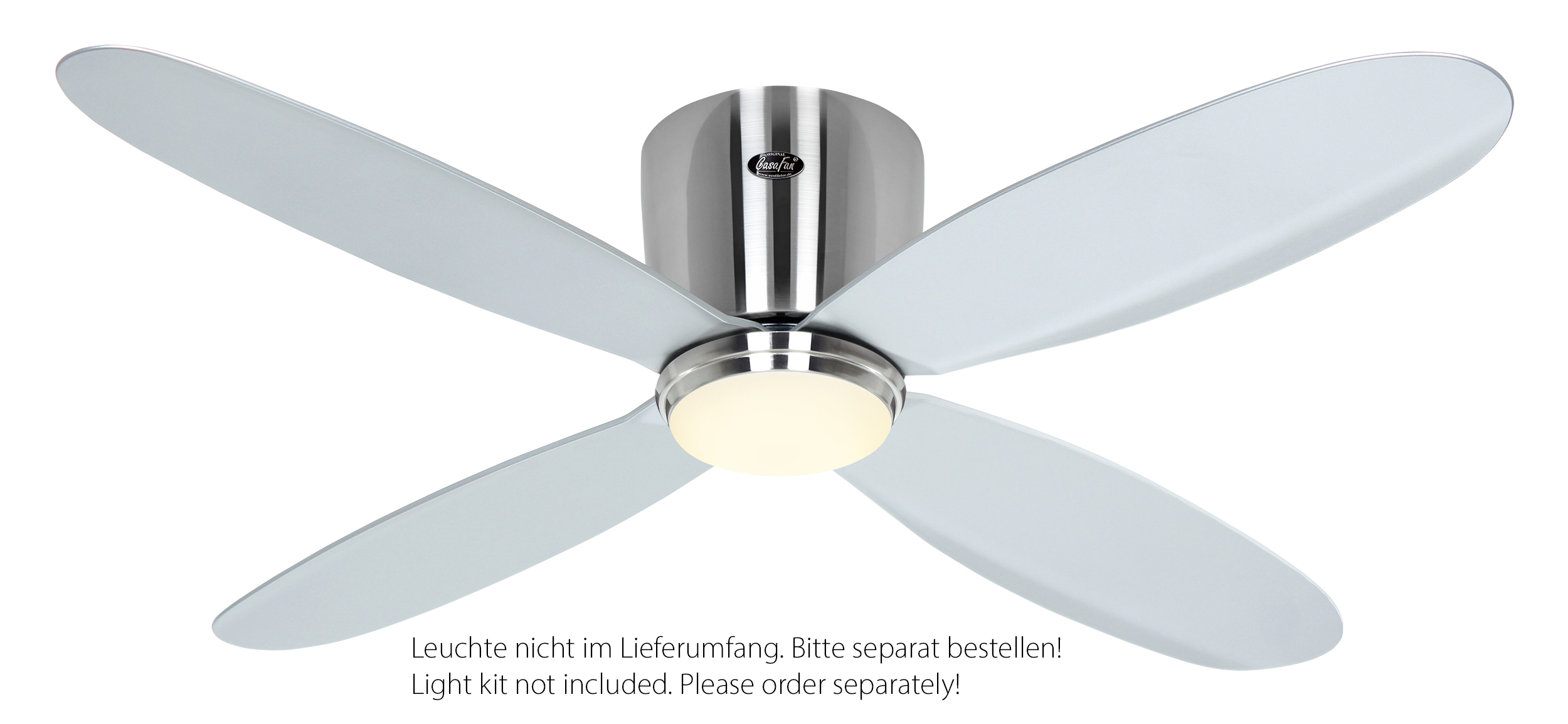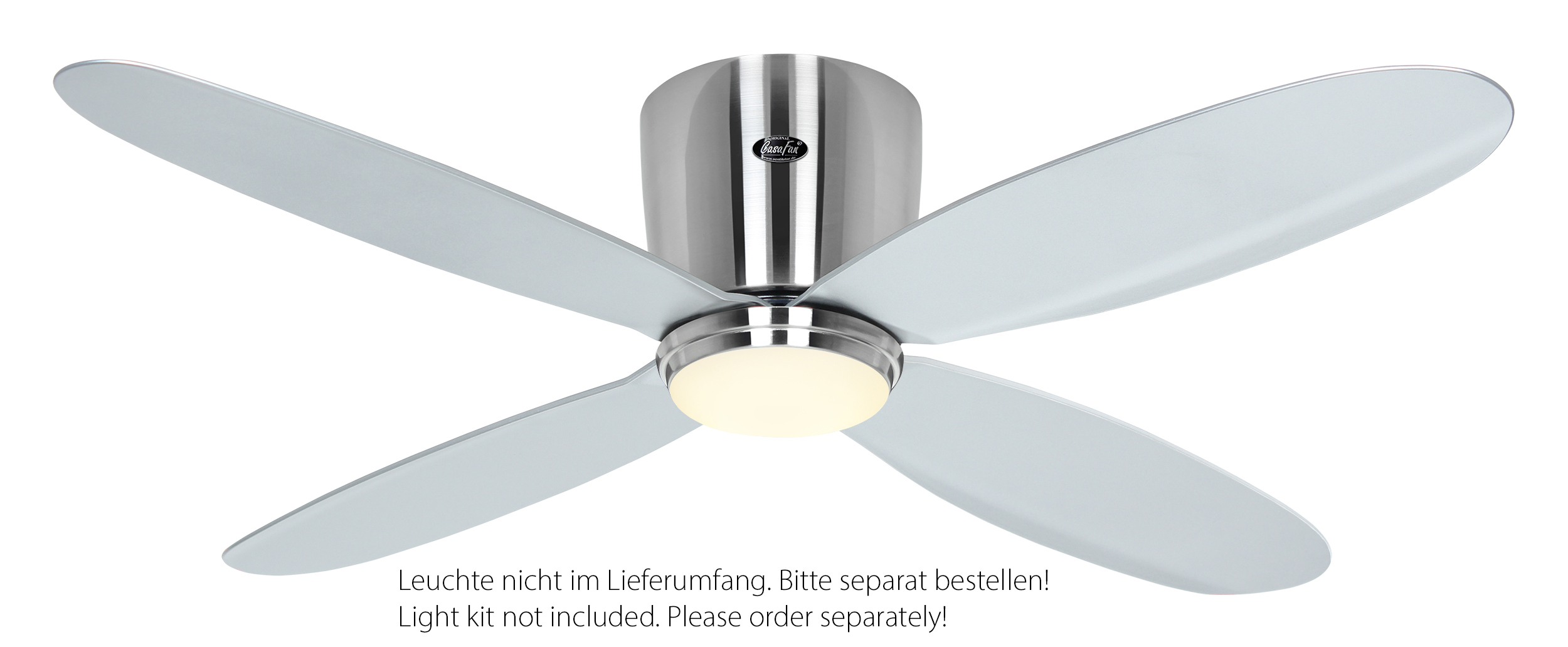 CasaFan ECO PLANO II 112 BN-SI 0 - 10 V, Energiespar Deckenventilator, Ø 112 cm, Gehäuse Chrom gebürstet, 4 Flügel Lack silber (wahlweise 2,3,4 montierbar), 100-240 V 50-60 Hz, DC/EC Motor 1-13 W, inkl. Funk-Fernbedienung (Motor 6 Stufen, Vor-/Rückwärtslauf - Sommer/Winter -, Schlaftimer) und Wandhalter, Zeitlupenstufe, Drehzahl max. 30-208 U/min, Abstand Decke - Flügel 200 mm, extraflach, Montage nur an geraden Decken, gewuchteter Motor und Flügel, für Raumgrößen bis 15 m², Zubehör wie passende Leuchten erhältlich