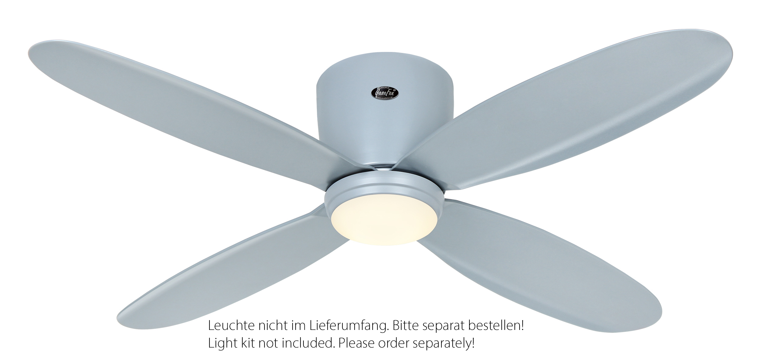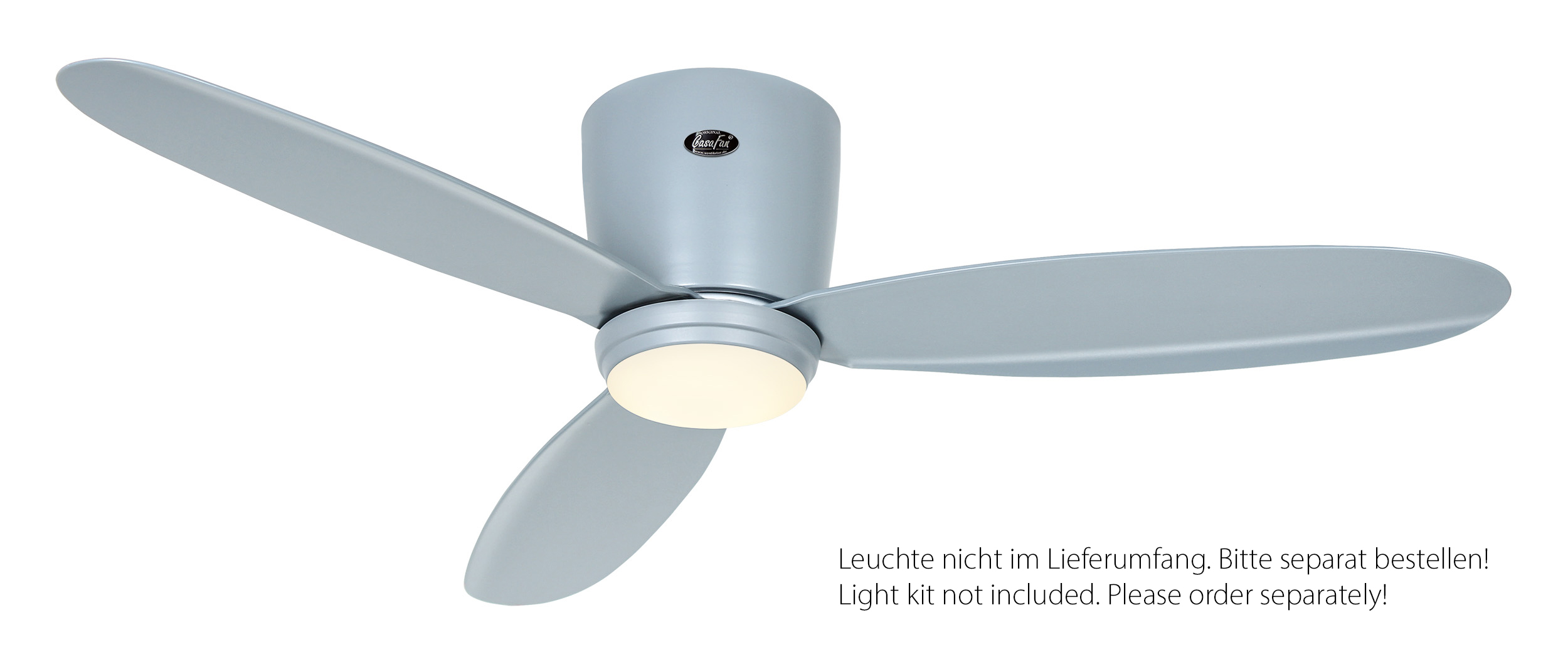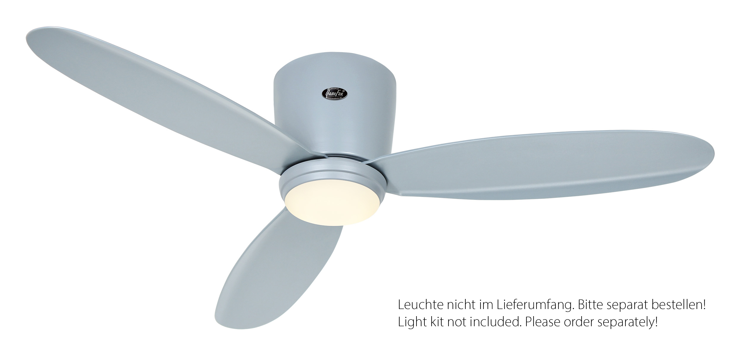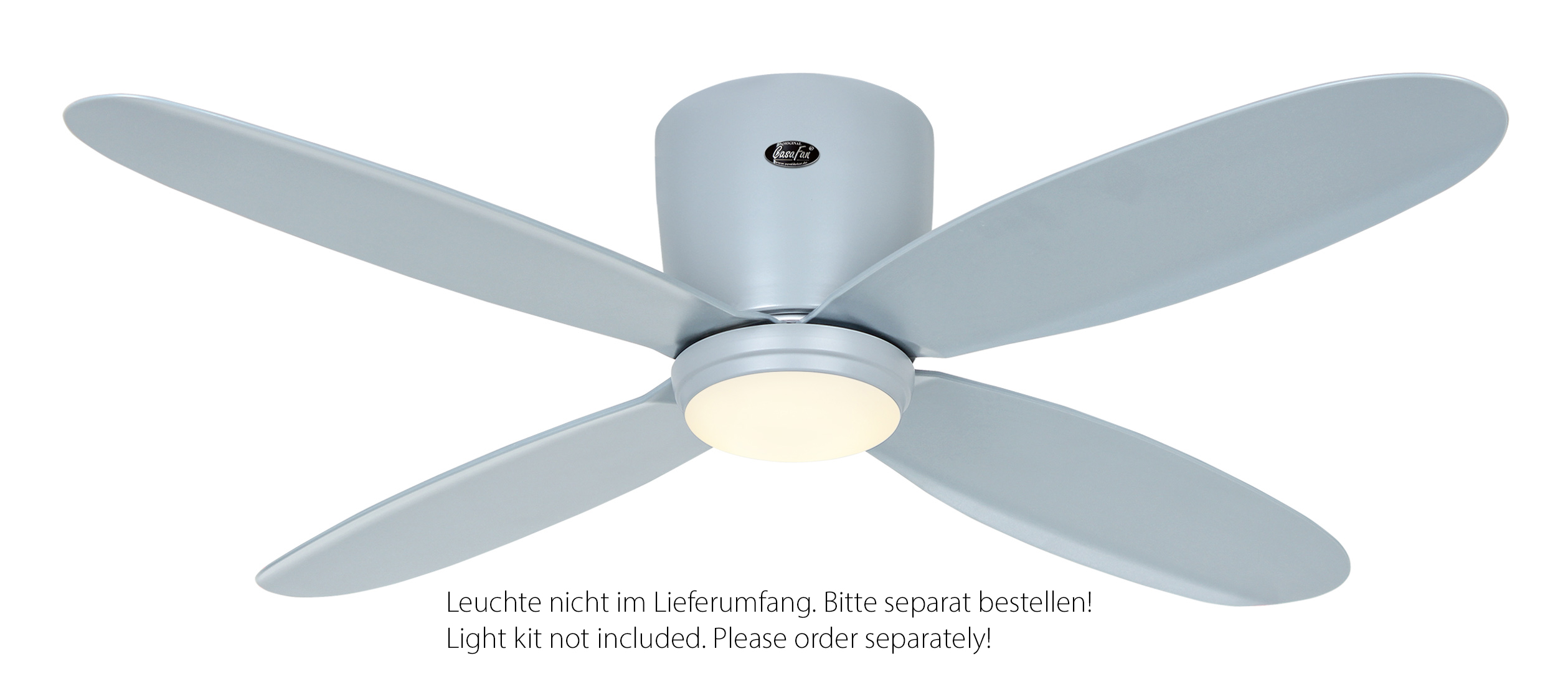 CasaFan ECO PLANO II 112 LG-LG 0 - 10 V, Energiespar Deckenventilator, Ø 112 cm, Gehäuse Lack lichtgrau, 4 Flügel Lack lichtgrau (wahlweise 2,3,4 montierbar), 100-240 V 50-60 Hz, DC/EC Motor 1-13 W, inkl. Funk-Fernbedienung (Motor 6 Stufen, Vor-/Rückwärtslauf - Sommer/Winter -, Schlaftimer) und Wandhalter, Zeitlupenstufe, Drehzahl max. 30-208 U/min, Abstand Decke - Flügel 200 mm, extraflach, Montage nur an geraden Decken, gewuchteter Motor und Flügel, für Raumgrößen bis 15 m², Zubehör wie passende Leuchten erhältlich