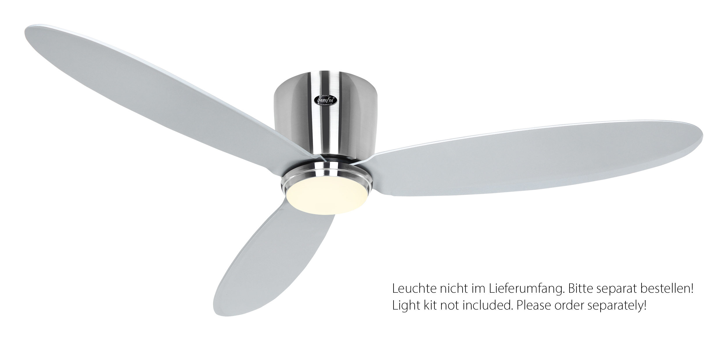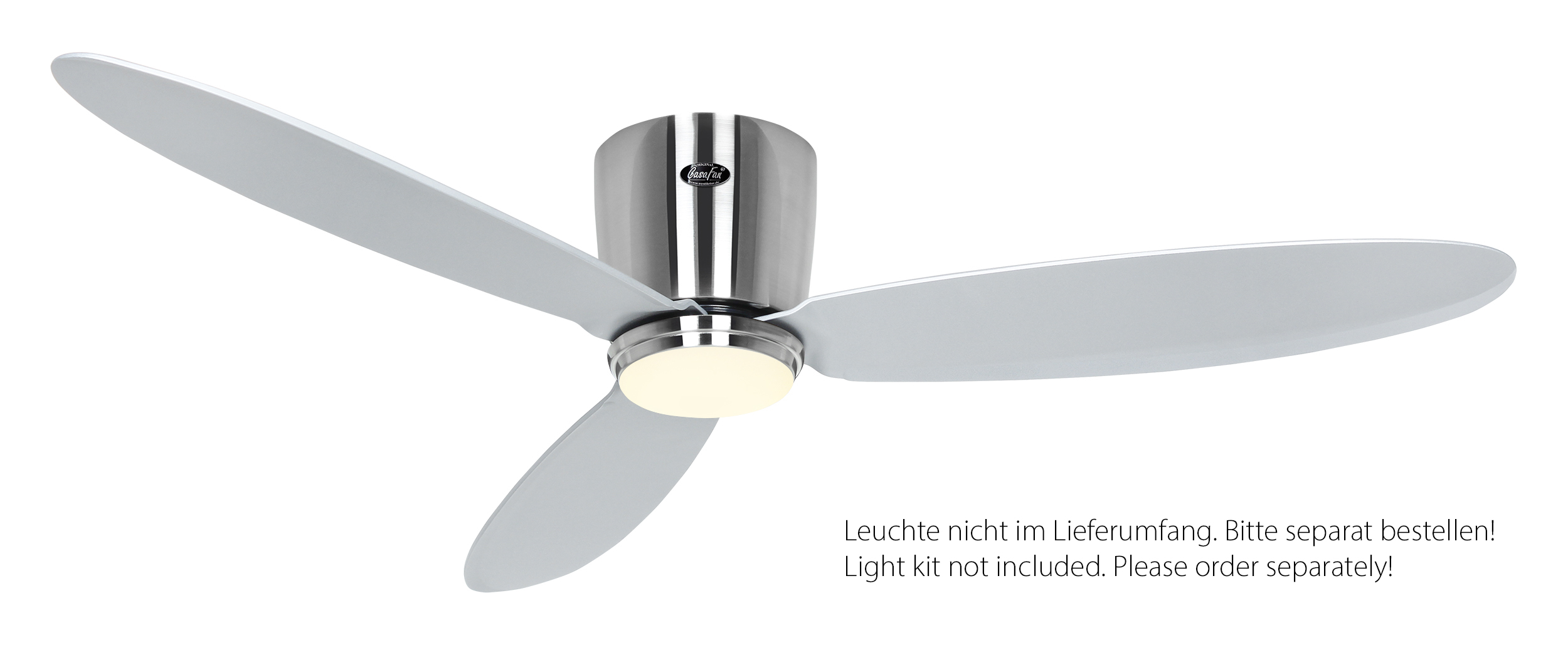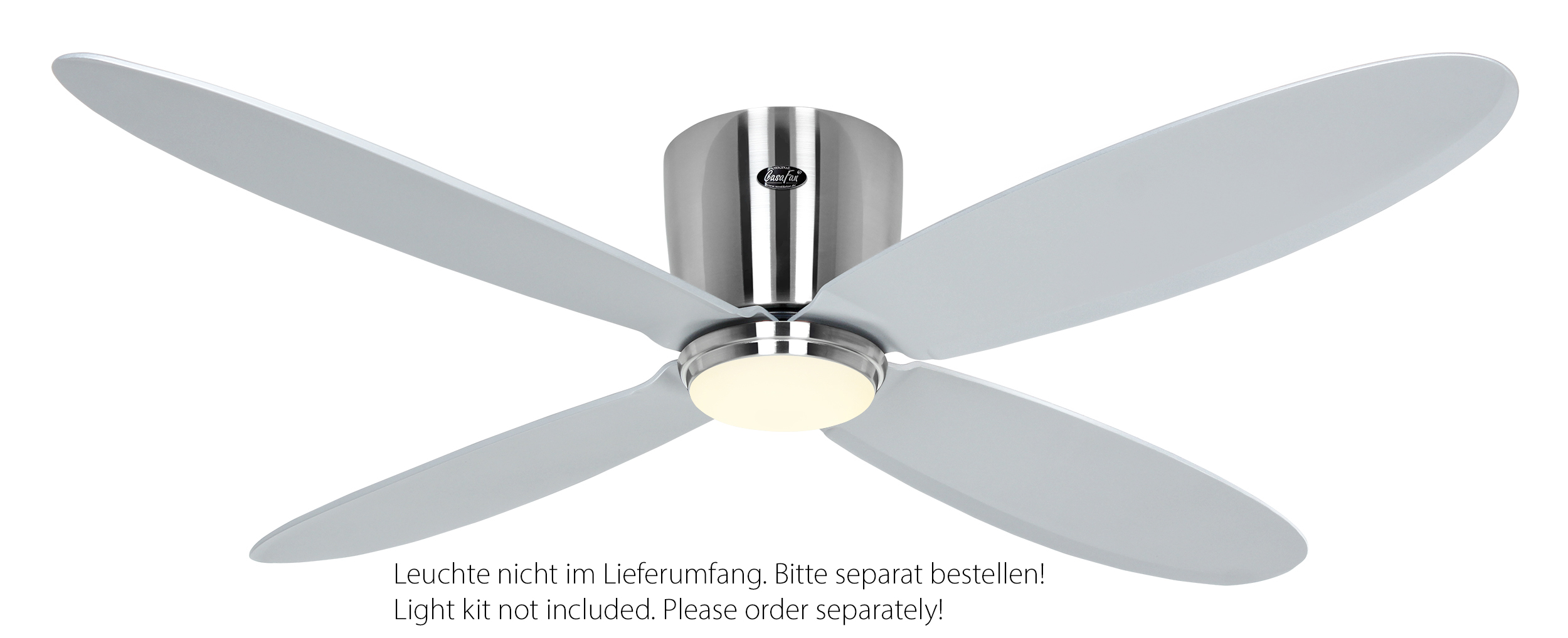 CasaFan Eco PLANO II 132 BN-SI 0 - 10 V, Energiespar Deckenventilator, Ø 132 cm, Gehäuse Chrom gebürstet, 4 Flügel Lack silber (wahlweise 2,3,4 montierbar), 100-240 V 50-60 Hz, DC/EC Motor 1,1-28 W, inkl. Funk-Fernbedienung (Motor 6 Stufen, Vor-/Rückwärtslauf - Sommer/Winter -, Schlaftimer) und Wandhalter, Zeitlupenstufe, Drehzahl max. 30-207 U/min, Abstand Decke - Flügel 200 mm, extraflach, Montage nur an geraden Decken, gewuchteter Motor und Flügel, für Raumgrößen bis 22 m², Zubehör wie passende Leuchten erhältlich