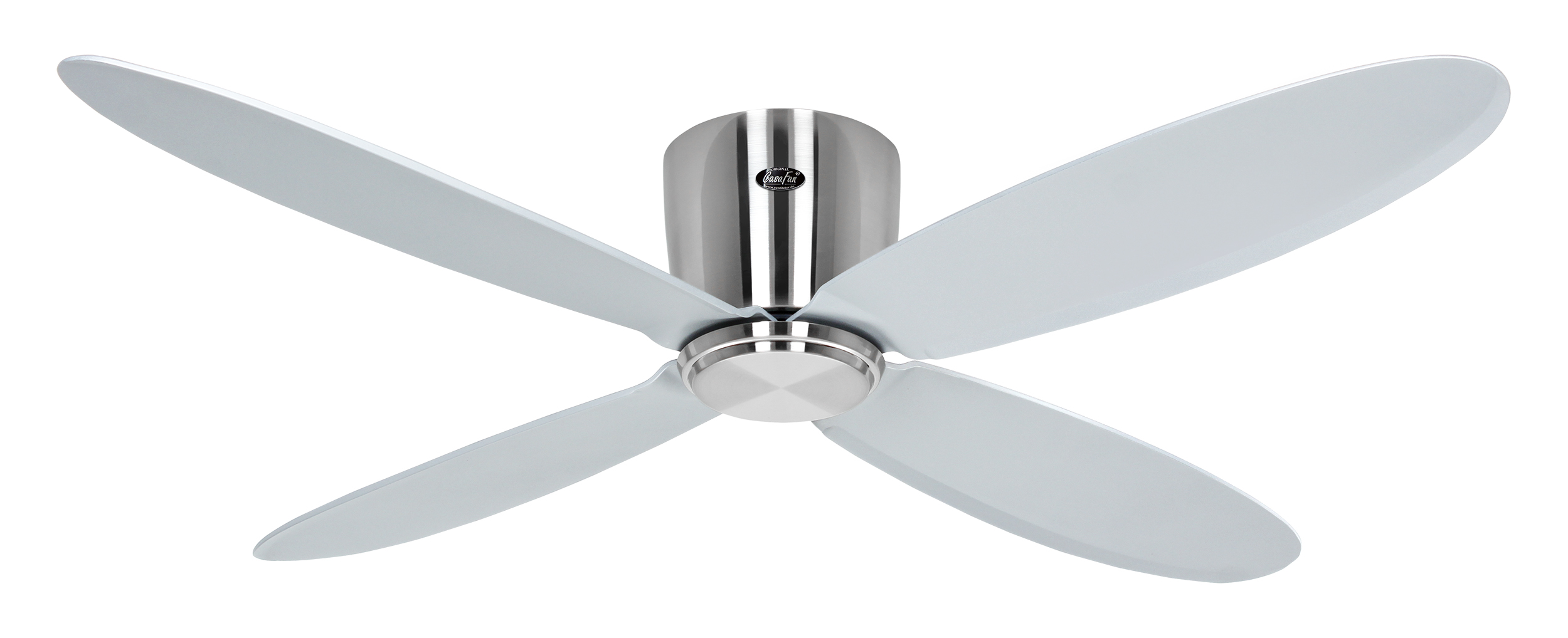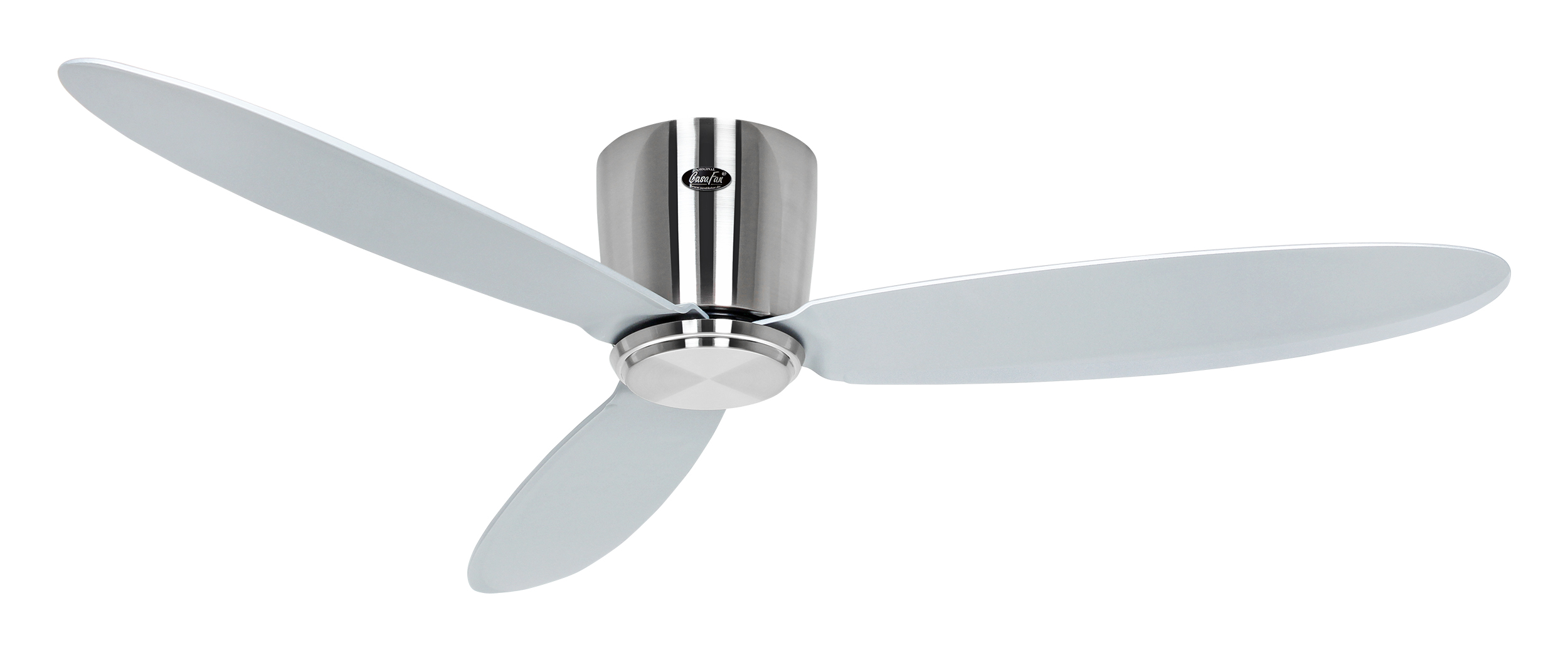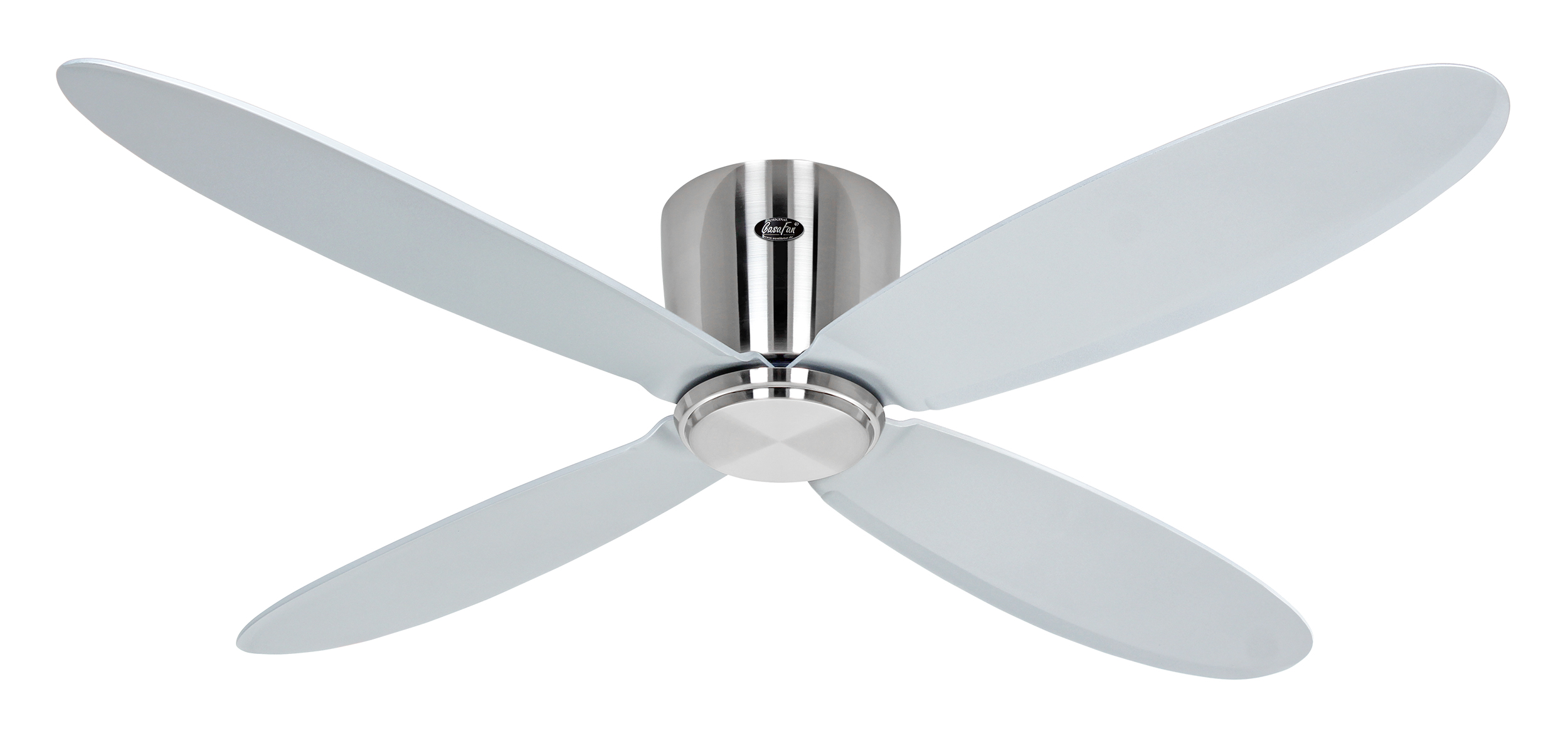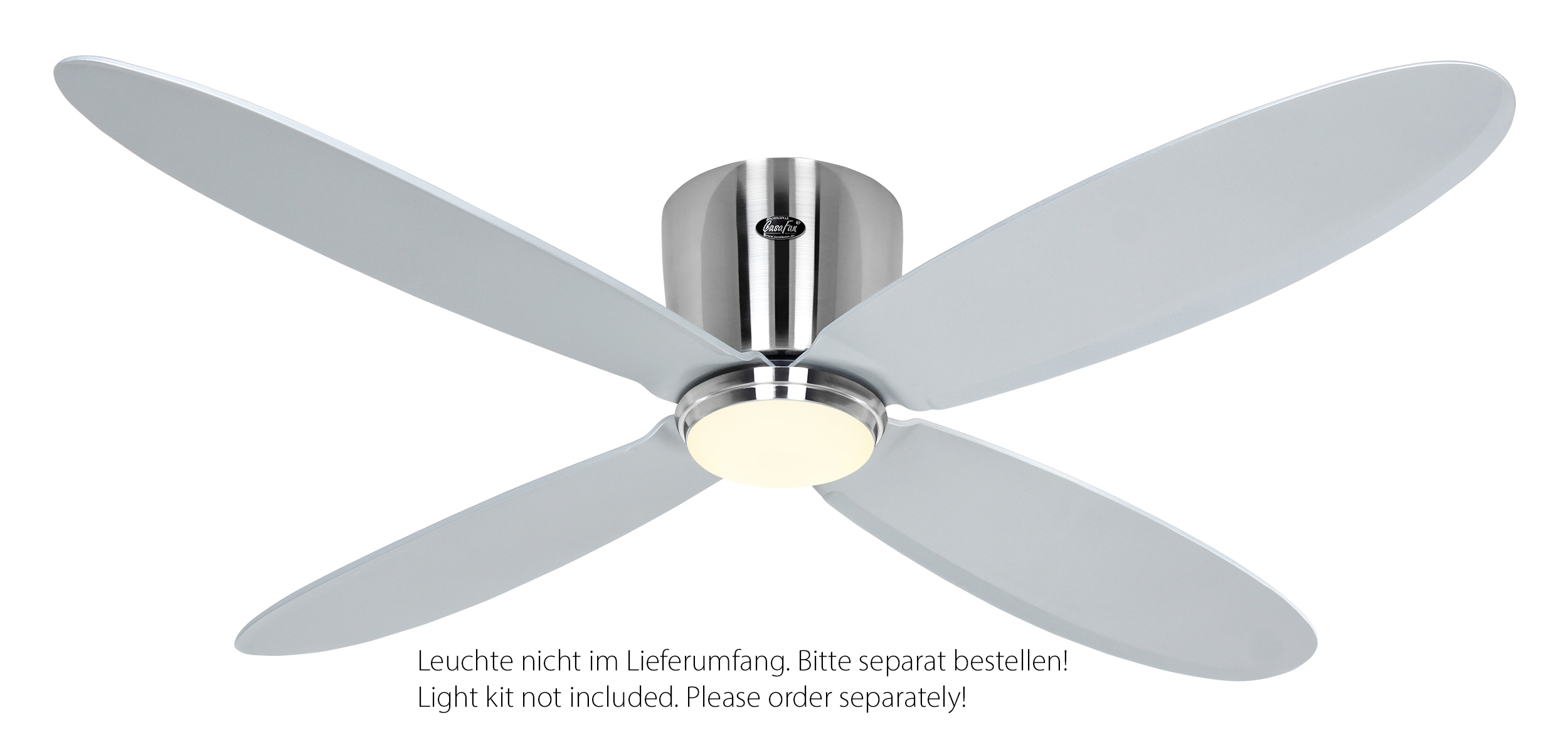 CasaFan Eco PLANO II 132 BN-SI 0 - 10 V, Energiespar Deckenventilator, Ø 132 cm, Gehäuse Chrom gebürstet, 4 Flügel Lack silber (wahlweise 2,3,4 montierbar), 100-240 V 50-60 Hz, DC/EC Motor 1,1-28 W, inkl. Funk-Fernbedienung (Motor 6 Stufen, Vor-/Rückwärtslauf - Sommer/Winter -, Schlaftimer) und Wandhalter, Zeitlupenstufe, Drehzahl max. 30-207 U/min, Abstand Decke - Flügel 200 mm, extraflach, Montage nur an geraden Decken, gewuchteter Motor und Flügel, für Raumgrößen bis 22 m², Zubehör wie passende Leuchten erhältlich