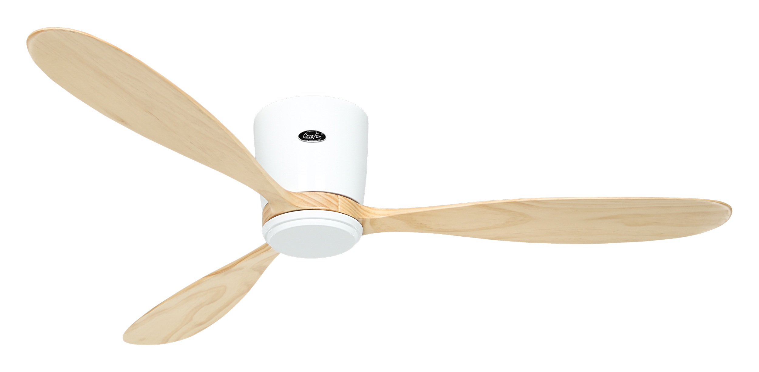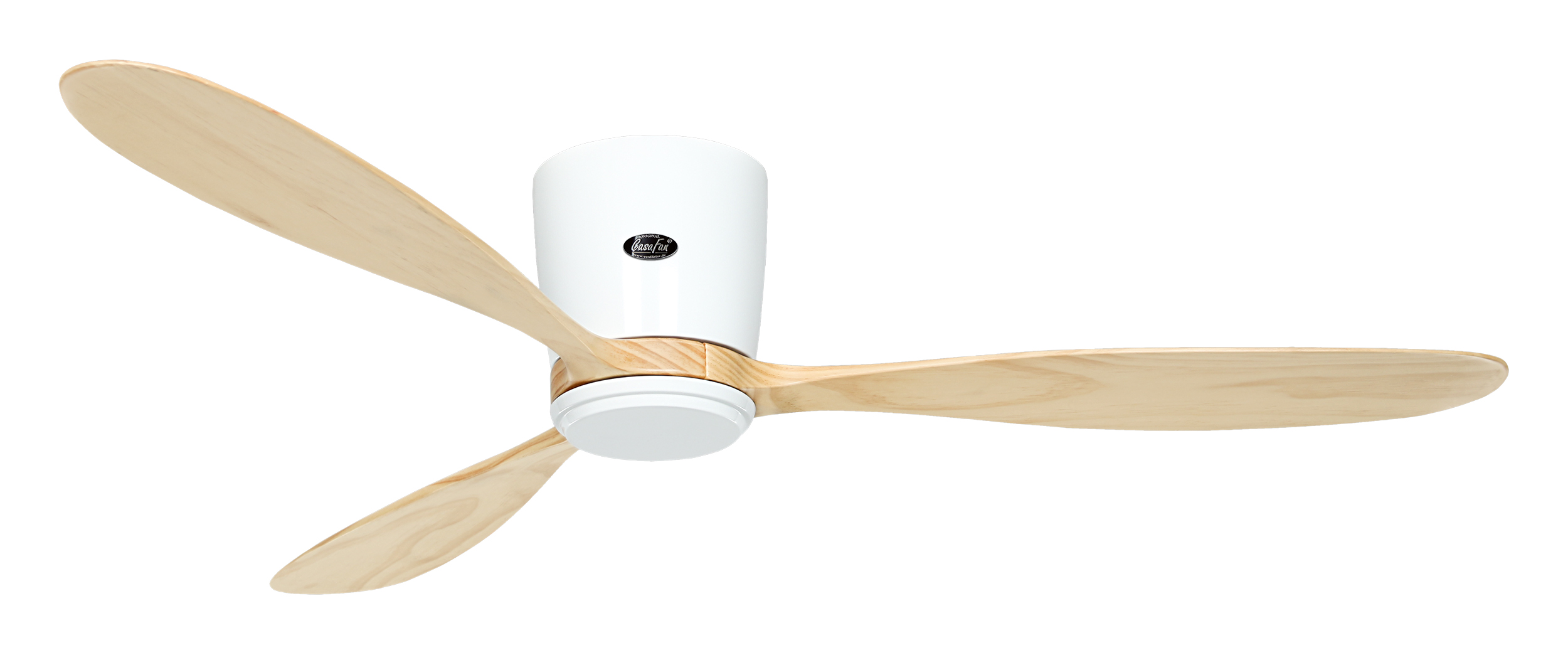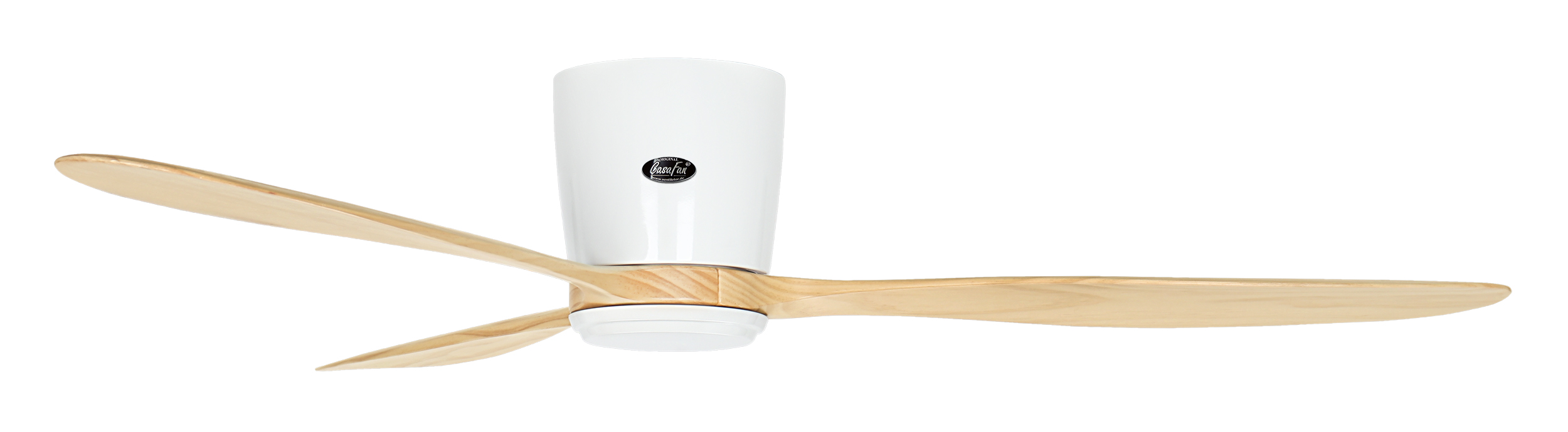 CasaFan ECO PLANO WOOD WE-NT 0 - 10 V, Energiespar Deckenventilator, Ø 132 cm, Gehäuse Lack weiß, 3 Flügel Massivholz Holz natur, 100-240 V 50-60 Hz, DC/EC Motor 1,0-21 W, inkl. Funk-Fernbedienung (Motor 6 Stufen, Vor-/Rückwärtslauf - Sommer/Winter -, Schlaftimer) und Wandhalter, Zeitlupenstufe, Drehzahl max. 30-210 U/min, Abstand Decke - Flügel 198 mm, extraflach, Montage nur an geraden Decken, gewuchteter Motor und Flügel, für Raumgrößen bis 23 m², nicht für Leuchtenanbau geeignet, Zubehör Hotel Wandsteuerung FB-FNK EC #86200 erhältlich