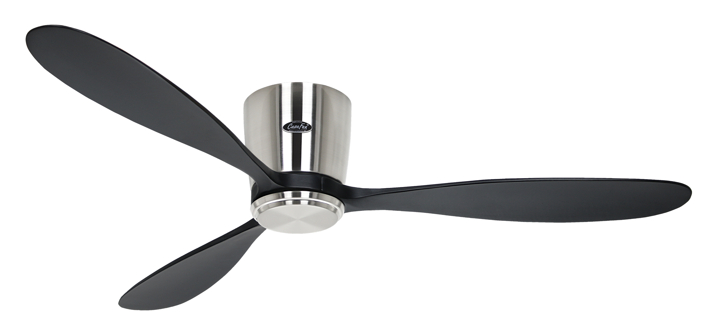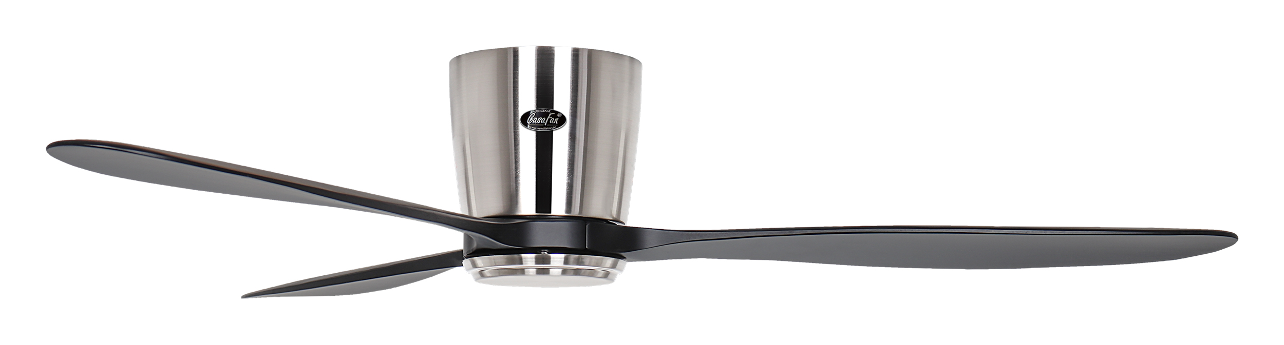 CasaFan ECO PLANO WOOD BN-SW WiFi, Energiespar Deckenventilator mit WiFi, Ø 132 cm, Gehäuse Chrom gebürstet, 3 Flügel Massivholz Lack schwarz, 100-240 V 50-60 Hz, DC/EC Motor 1,0-21 W, inkl. Funk-Fernbedienung (Motor 6 Stufen, Vor-/Rückwärtslauf - Sommer/Winter -, Schlaftimer) und Wandhalter, Zeitlupenstufe, Drehzahl max. 30-210 U/min, Abstand Decke - Flügel 198 mm, extraflach, Montage nur an geraden Decken, gewuchteter Motor und Flügel, für Raumgrößen bis 23 m², nicht für Leuchtenanbau geeignet, mit WiFi (alle Funktionen bedienbar mit WiFi Smart Life App), Zubehör Hotel Wandsteuerung FB-FNK EC #86200 erhältlich