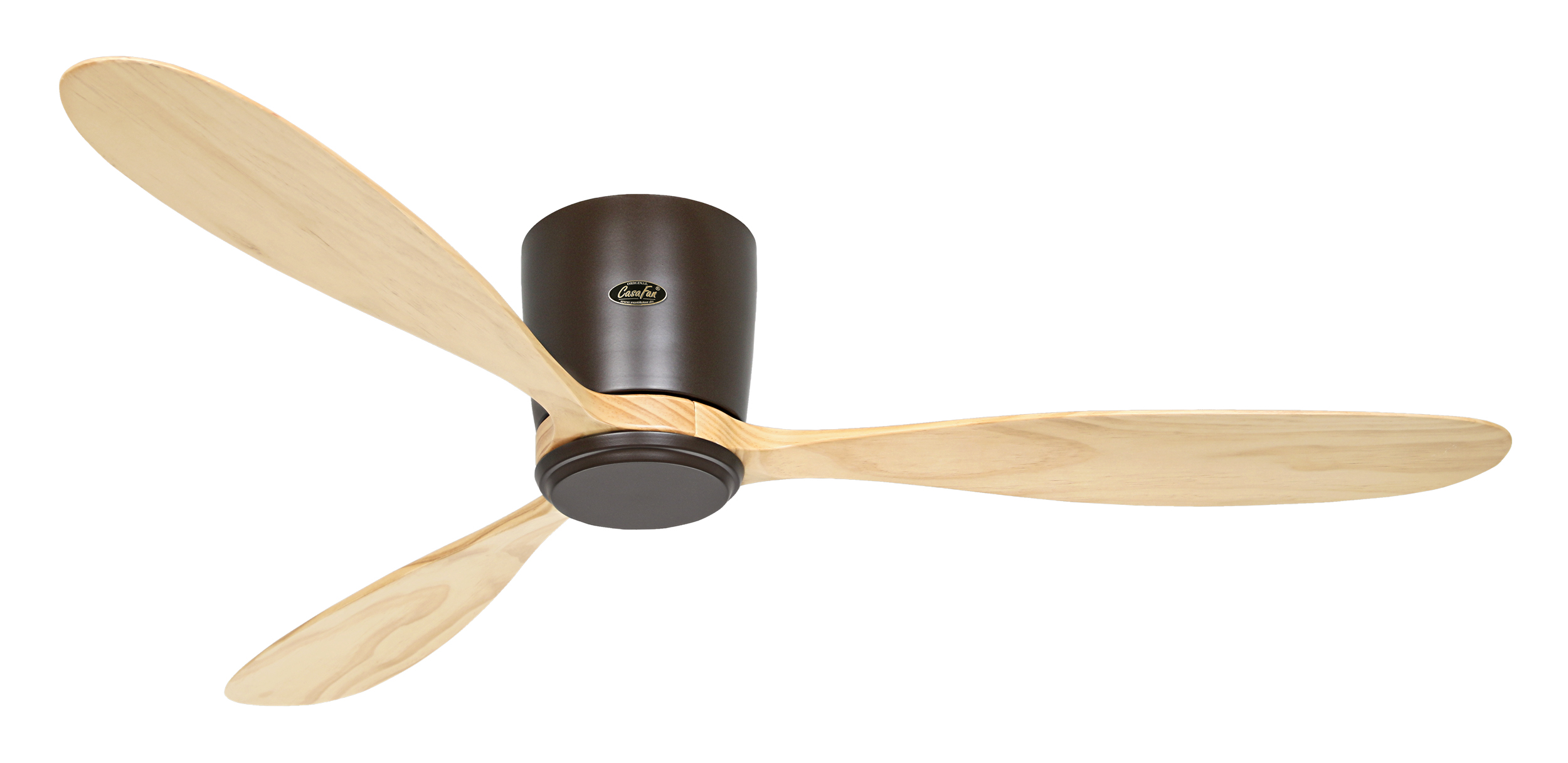 CasaFan ECO PLANO WOOD BZ-NT WiFi, Energiespar Deckenventilator mit WiFi, Ø 132 cm, Gehäuse Lack bronze, 3 Flügel Massivholz Holz natur, 100-240 V 50-60 Hz, DC/EC Motor 1,0-21 W, inkl. Funk-Fernbedienung (Motor 6 Stufen, Vor-/Rückwärtslauf - Sommer/Winter -, Schlaftimer) und Wandhalter, Zeitlupenstufe, Drehzahl max. 30-210 U/min, Abstand Decke - Flügel 198 mm, extraflach, Montage nur an geraden Decken, gewuchteter Motor und Flügel, für Raumgrößen bis 23 m², nicht für Leuchtenanbau geeignet, Zubehör Hotel Wandsteuerung FB-FNK EC #86200 erhältlich