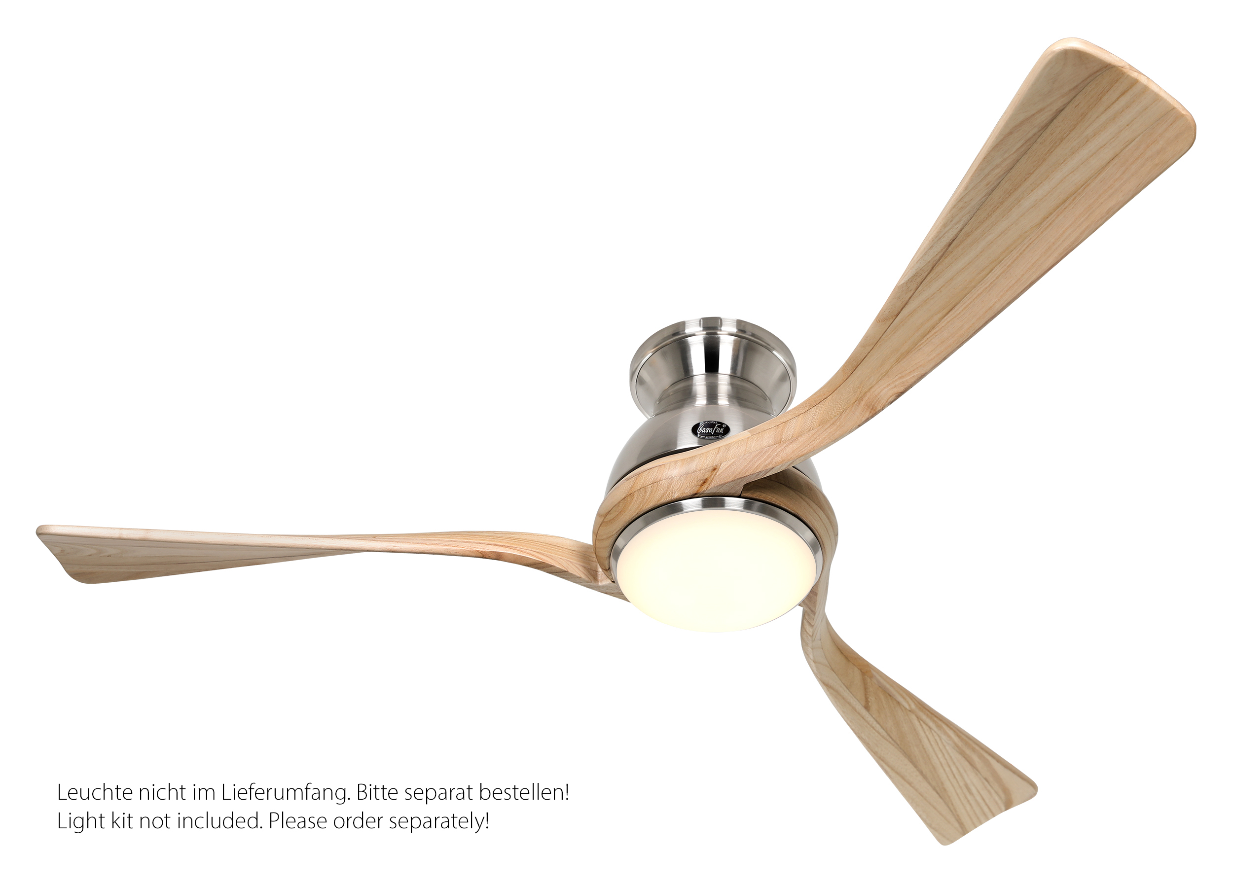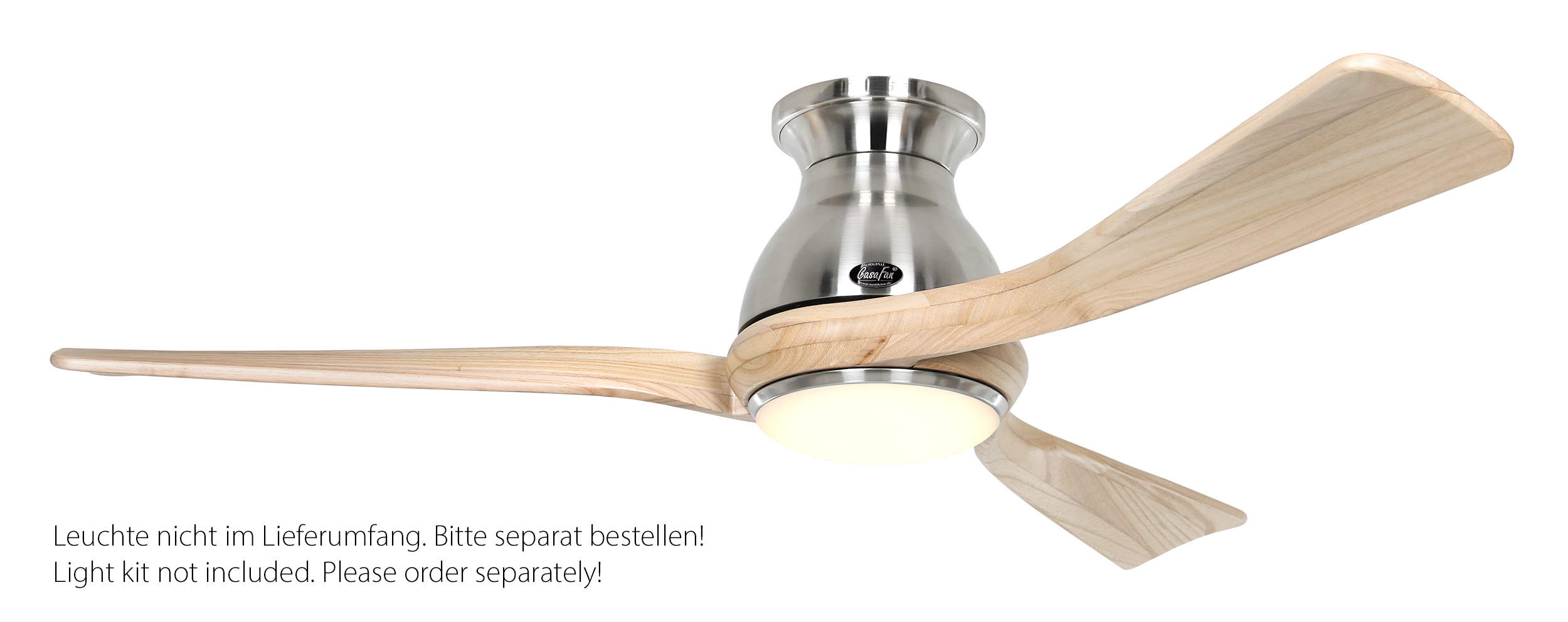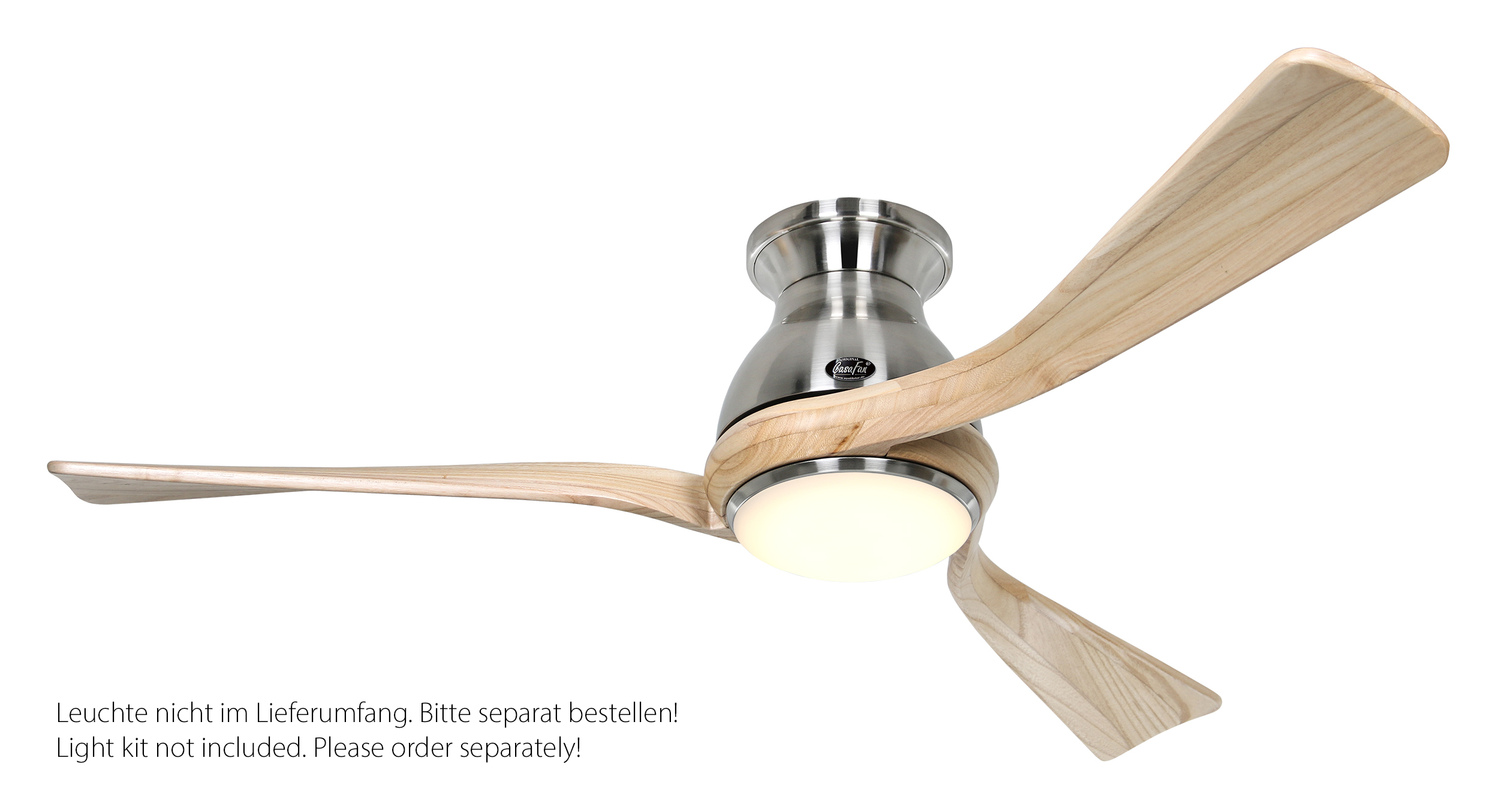 CasaFan ECO REGENTO 140 BN-NT 0 - 10 V, Energiespar Deckenventilator, Ø 140 cm, Gehäuse Chrom gebürstet 3 Flügel Holz natur, handgearbeitet aus schichtverleimtem Massivholz, 100-240 V 50-60 Hz, DC/EC Motor 1,2-27 W, inkl. Funk-Fernbedienung (Motor 6 Stufen, Lichtdimmung, Vor-/Rückwärtslauf - Sommer/Winter -, Schlaftimer) und Wandhalter, Zeitlupenstufe, Drehzahl max 30-132 U/min, Abstand Decke - Flügel 260 mm, extraflach, Montage nur an geraden Decken, gewuchteter Motor und Flügel, für Raumgrößen bis 25 m², Zubehör wie passende Leuchten erhältlich