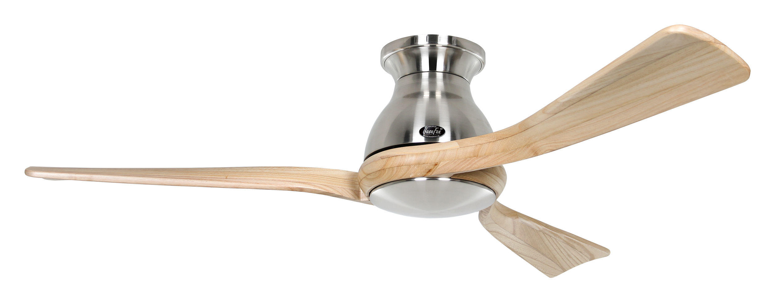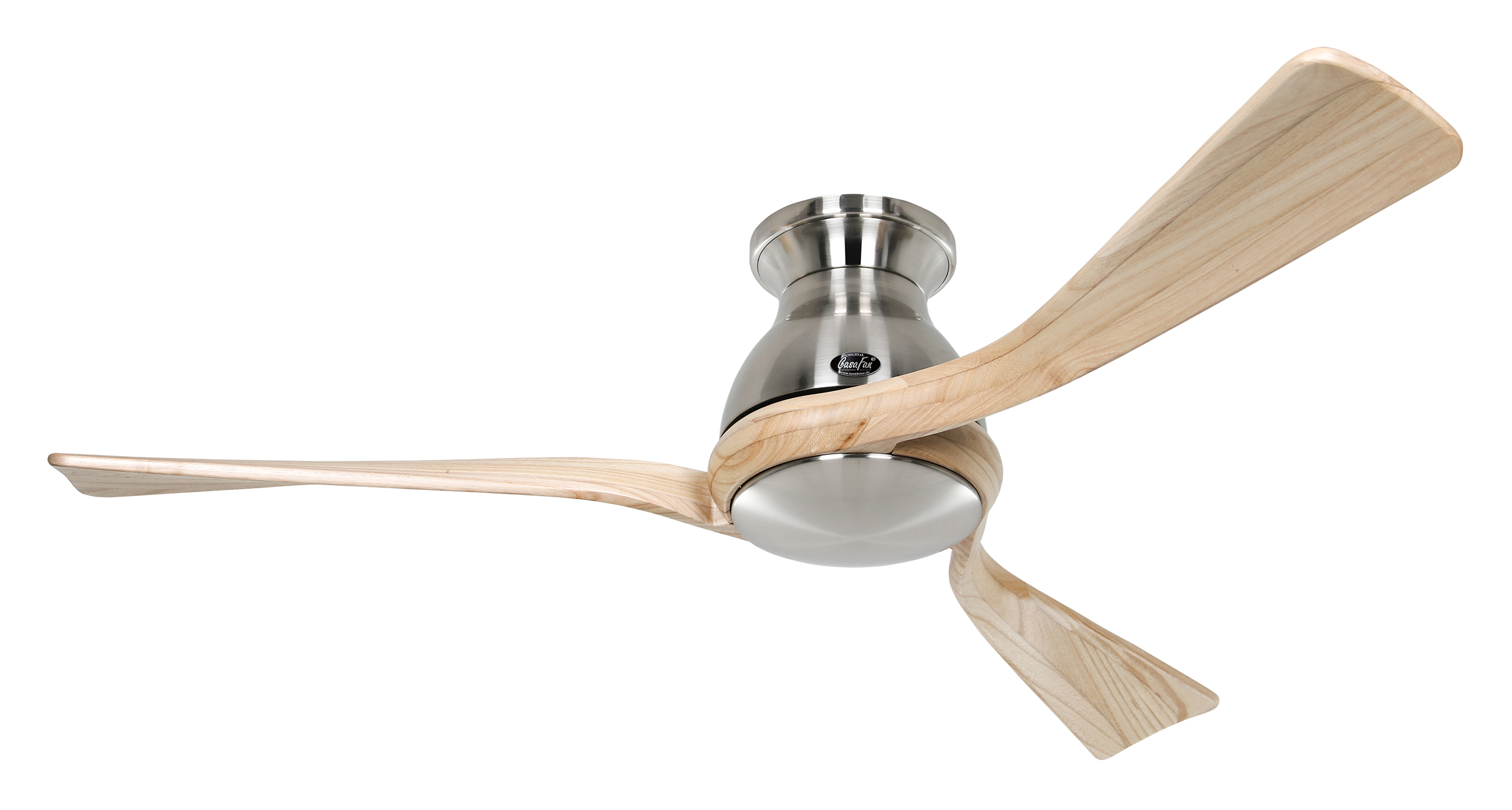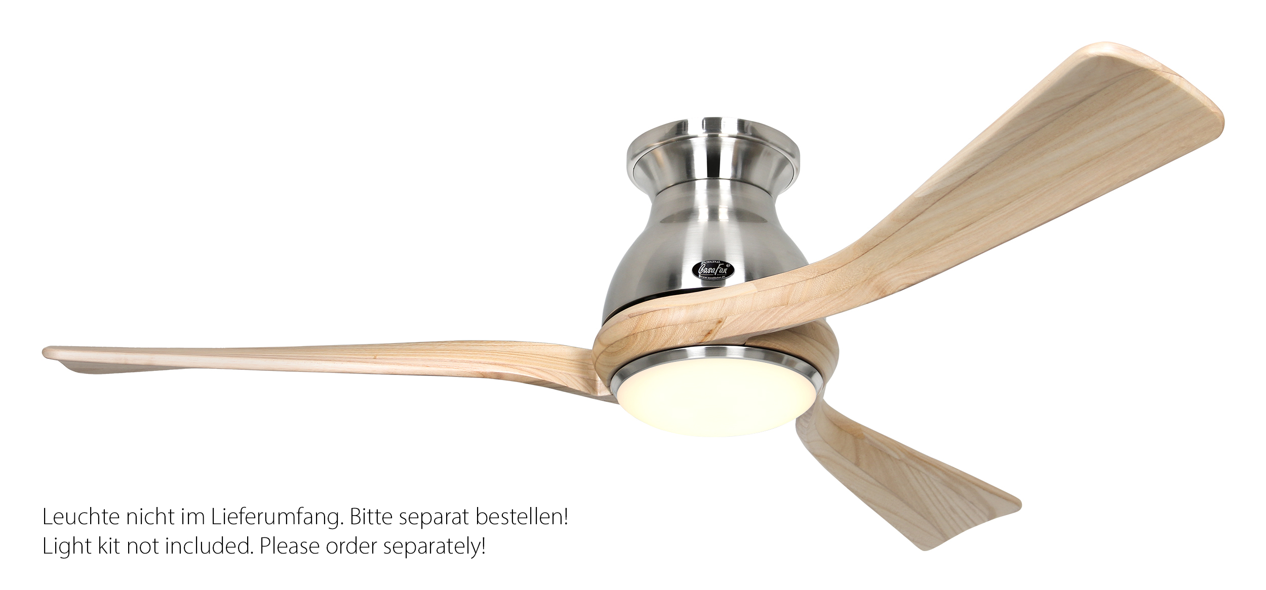 CasaFan ECO REGENTO 140 BN-NT 0 - 10 V, Energiespar Deckenventilator, Ø 140 cm, Gehäuse Chrom gebürstet 3 Flügel Holz natur, handgearbeitet aus schichtverleimtem Massivholz, 100-240 V 50-60 Hz, DC/EC Motor 1,2-27 W, inkl. Funk-Fernbedienung (Motor 6 Stufen, Lichtdimmung, Vor-/Rückwärtslauf - Sommer/Winter -, Schlaftimer) und Wandhalter, Zeitlupenstufe, Drehzahl max 30-132 U/min, Abstand Decke - Flügel 260 mm, extraflach, Montage nur an geraden Decken, gewuchteter Motor und Flügel, für Raumgrößen bis 25 m², Zubehör wie passende Leuchten erhältlich