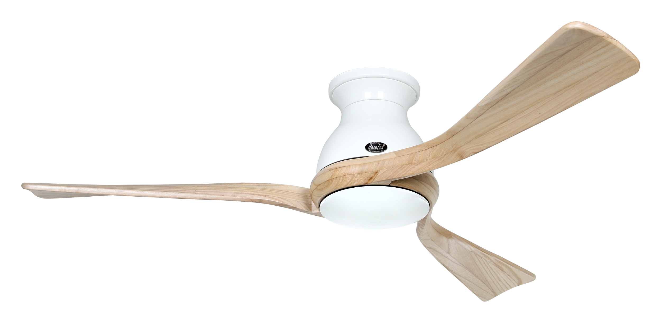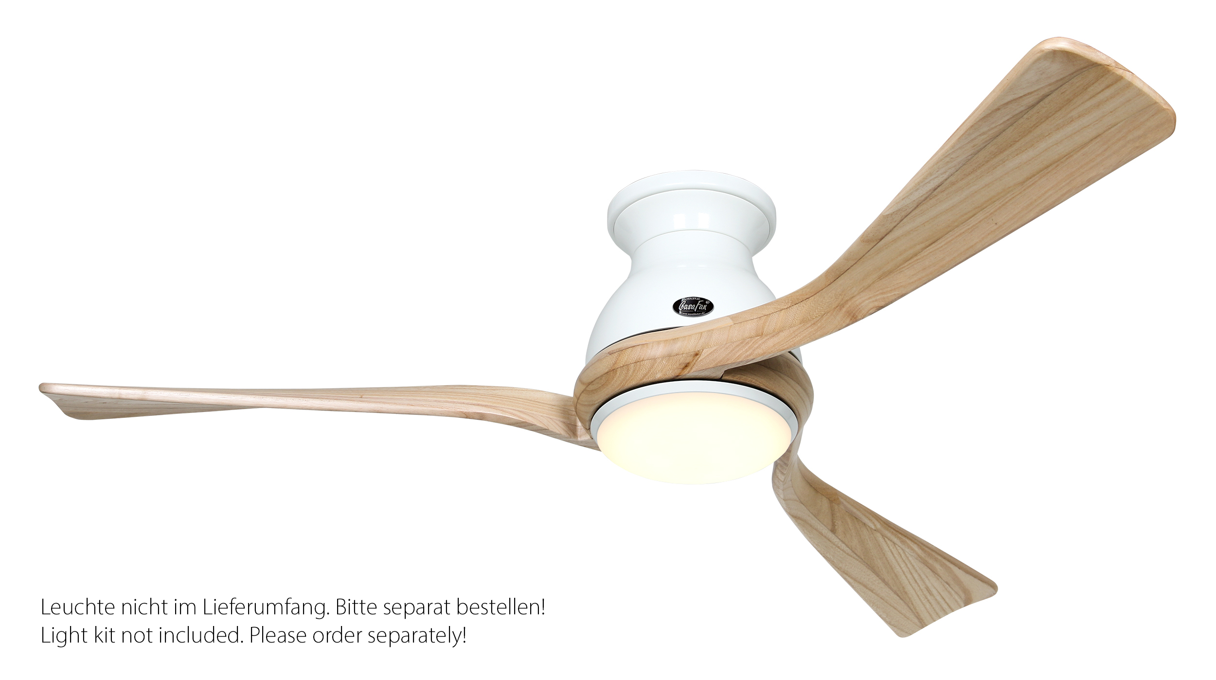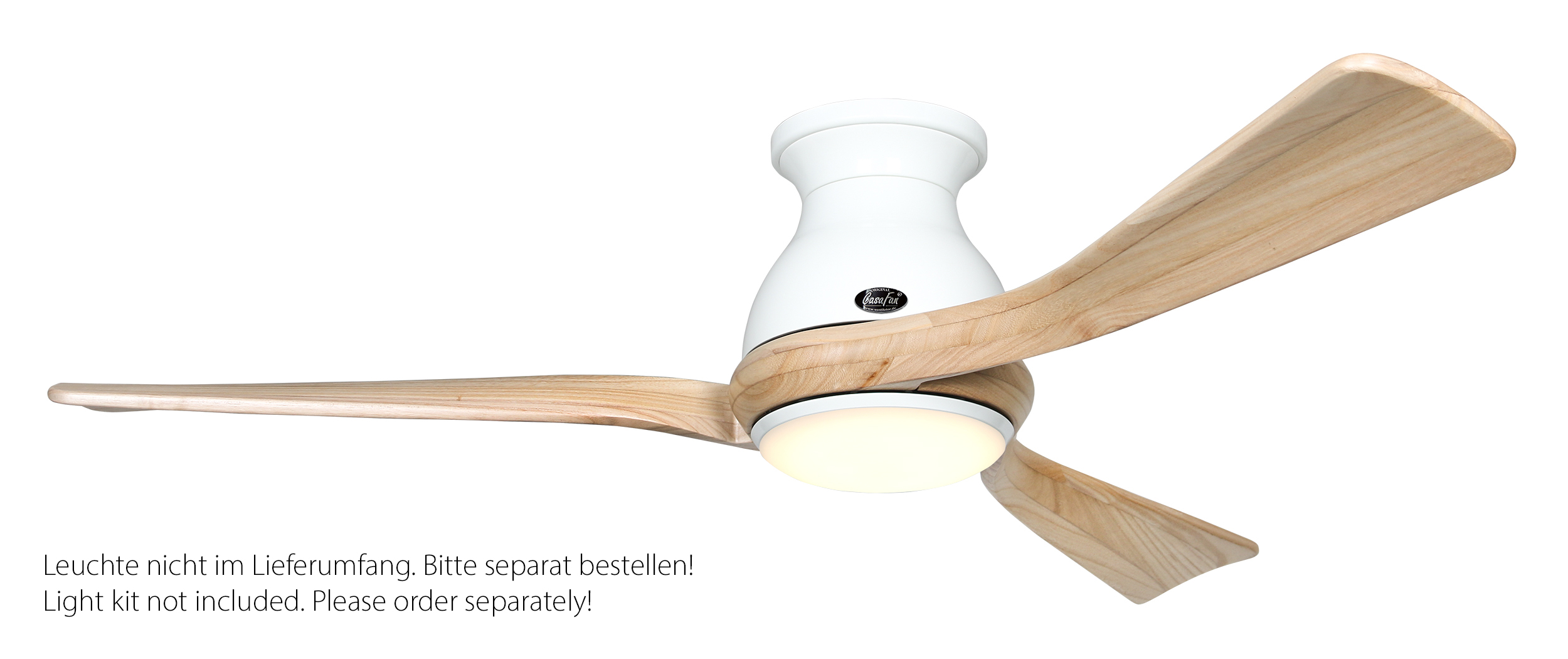 CasaFan ECO REGENTO 140 WE-NT 0 - 10 V, Energiespar Deckenventilator, Ø 140 cm, Gehäuse Lack weiß, 3 Flügel Holz natur, handgearbeitet aus schichtverleimtem Massivholz, 100-240 V 50-60 Hz, DC/EC Motor 1,2-27 W, inkl. Funk-Fernbedienung (Motor 6 Stufen, Lichtdimmung, Vor-/Rückwärtslauf - Sommer/Winter -, Schlaftimer) und Wandhalter, Zeitlupenstufe, Drehzahl max 30-132 U/min, Abstand Decke - Flügel 260 mm, extraflach, Montage nur an geraden Decken, gewuchteter Motor und Flügel, für Raumgrößen bis 25 m², Zubehör wie passende Leuchten erhältlich