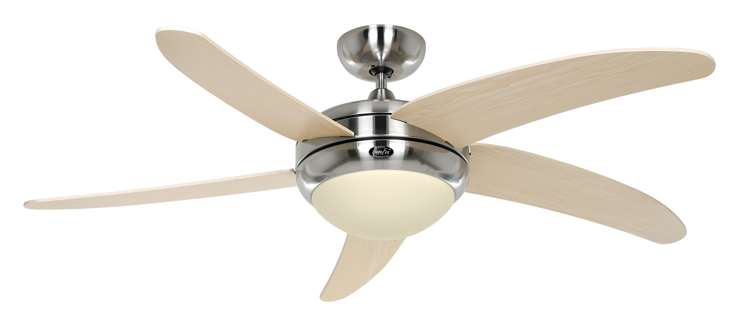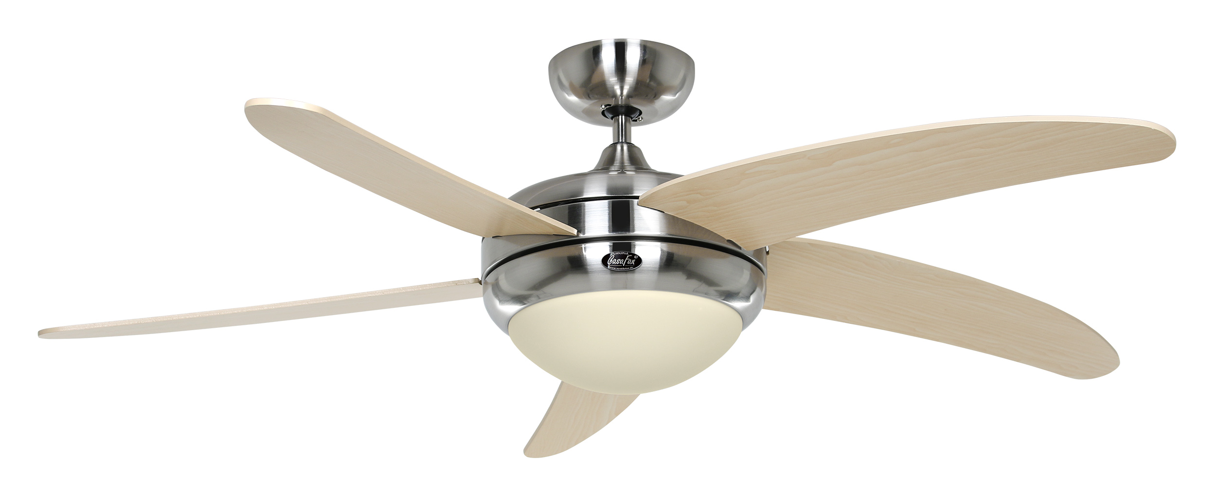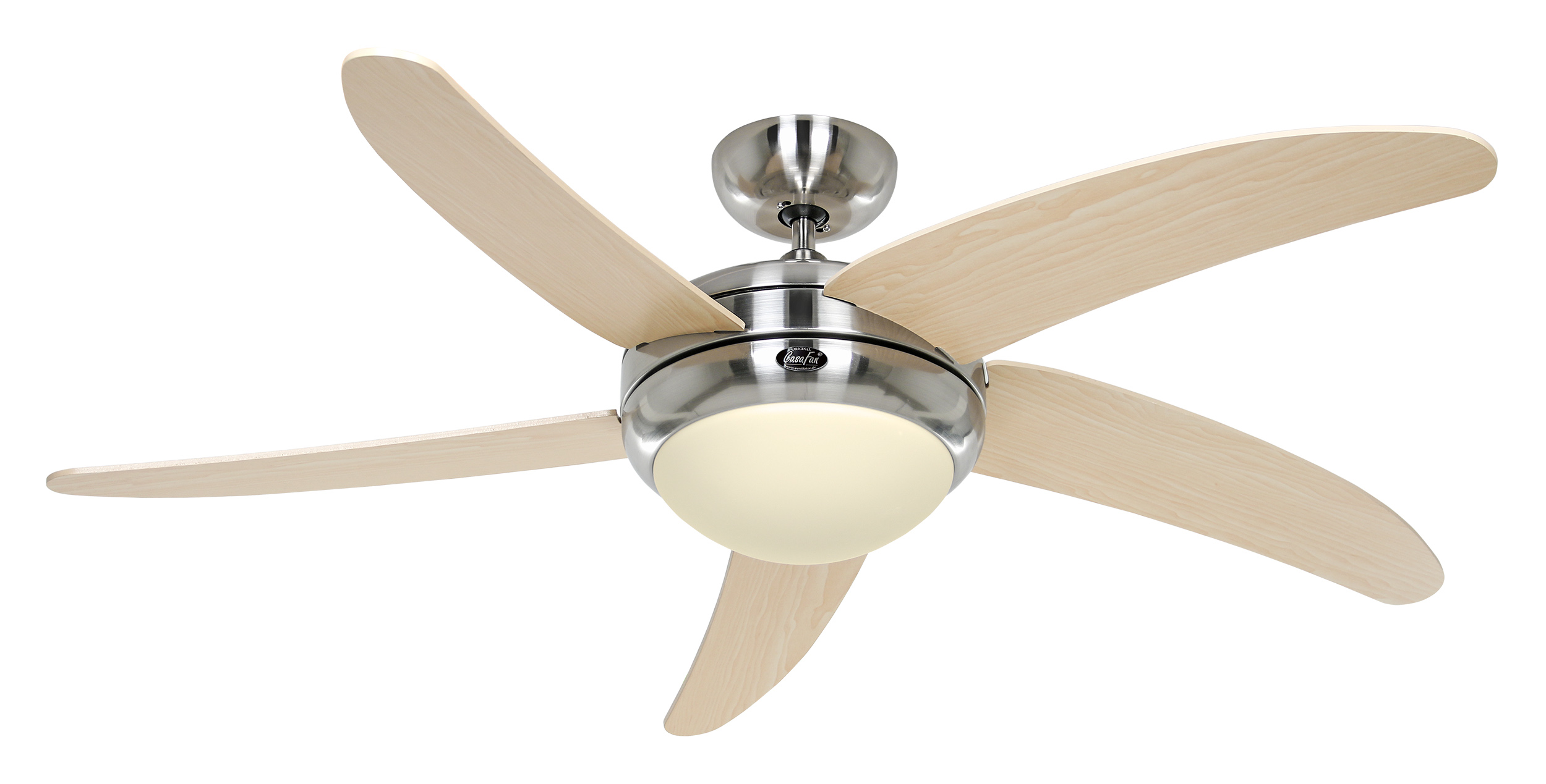 CasaFan ELICA BN-AH mit Fernbedienung, Deckenventilator, Ø 132 cm, Gehäuse Chrom gebürstet, 5 Flügel Ahorn, inkl. Fernbedienung (Motor 3 Stufen, Licht ein/aus/dimmen) mit Wandhalter, inkl. Milchglasleuchte 2 x 40 W E27, für Energiesparleuchtmittel geeignet, 220-240 V 50 Hz, Motor 15-72 W, Vor-/Rückwärtslauf - Sommer/Winter - über Schiebeschalter, Drehzahl max. 188 U/min, inkl. 2 Deckenstangen (100 und 70 mm), Abstand Decke - Flügel 260 mm (230 mm mit kurzer Deckenstange), Montage an Schrägen bis 17°, gewuchteter Motor und Flügel, für Raumgrößen bis 25 m², Zubehör wie längere Deckenstangen und Wandschalter erhältlich
