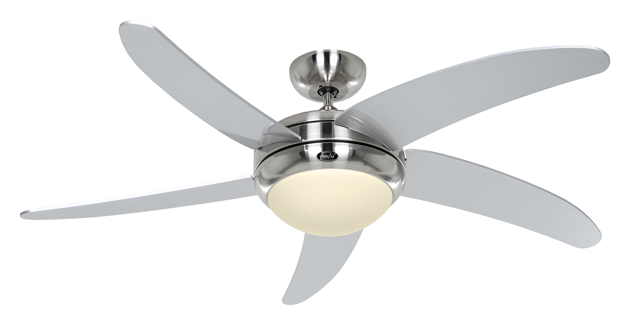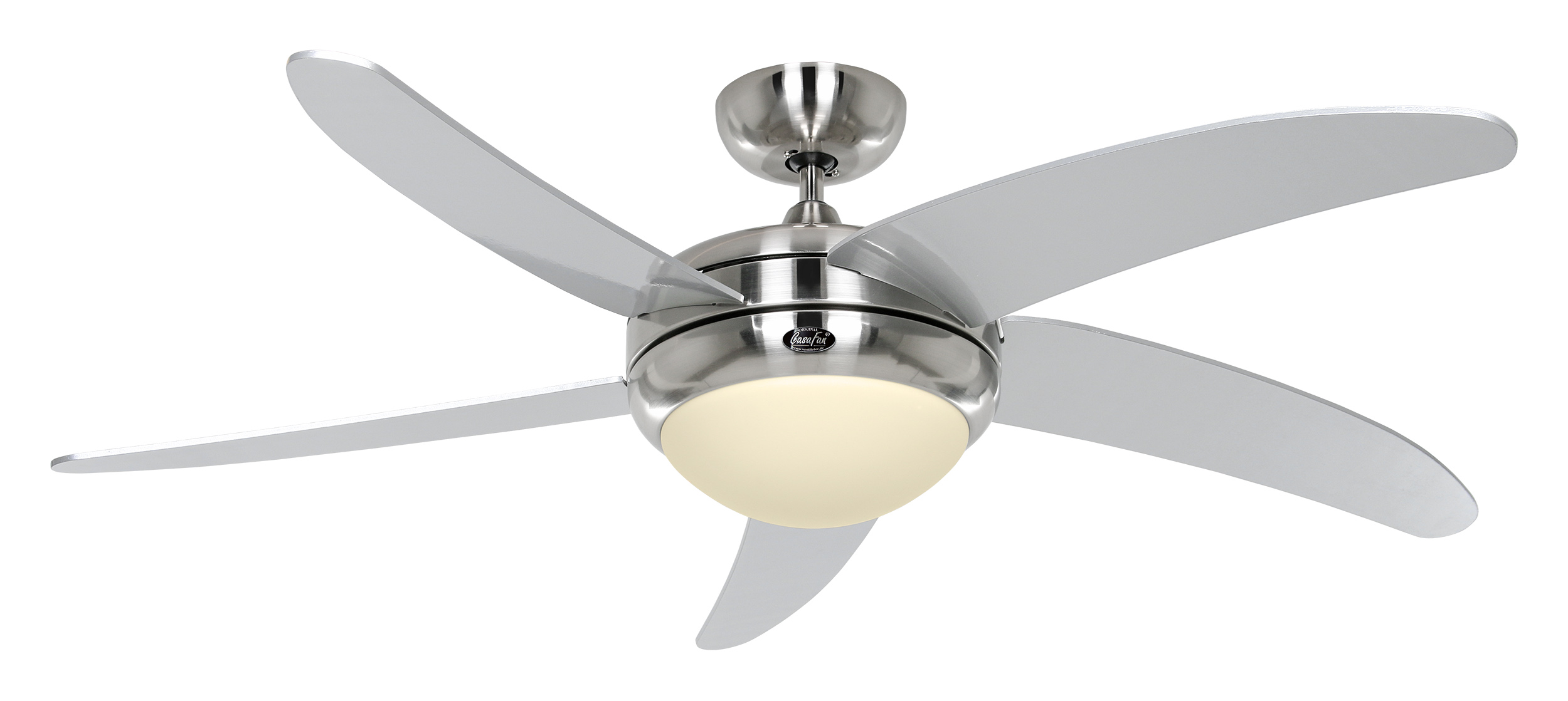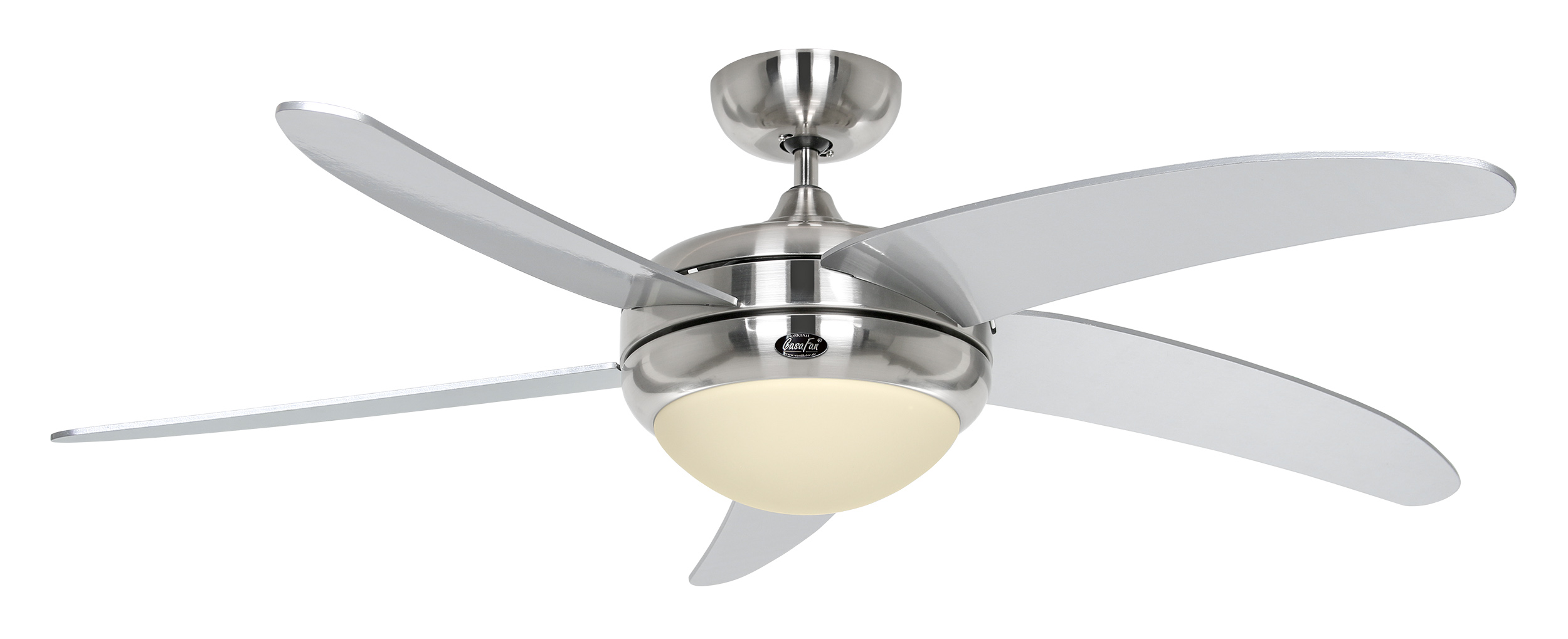 CasaFan ELICA BN-SL mit Fernbedienung, Deckenventilator, Ø 132 cm, Gehäuse Chrom gebürstet, 5 Flügel Lack silbergrau, inkl. Fernbedienung (Motor 3 Stufen, Licht ein/aus/dimmen) mit Wandhalter, inkl. Milchglasleuchte 2 x 40 W E27, für Energiesparleuchtmittel geeignet, 220-240 V 50 Hz, Motor 15-72 W, Vor-/Rückwärtslauf - Sommer/Winter - über Schiebeschalter, Drehzahl max. 188 U/min, inkl. 2 Deckenstangen (100 und 70 mm), Abstand Decke - Flügel 260 mm (230 mm mit kurzer Deckenstange), Montage an Schrägen bis 17°, gewuchteter Motor und Flügel, für Raumgrößen bis 25 m², Zubehör wie längere Deckenstangen und Wandschalter erhältlich