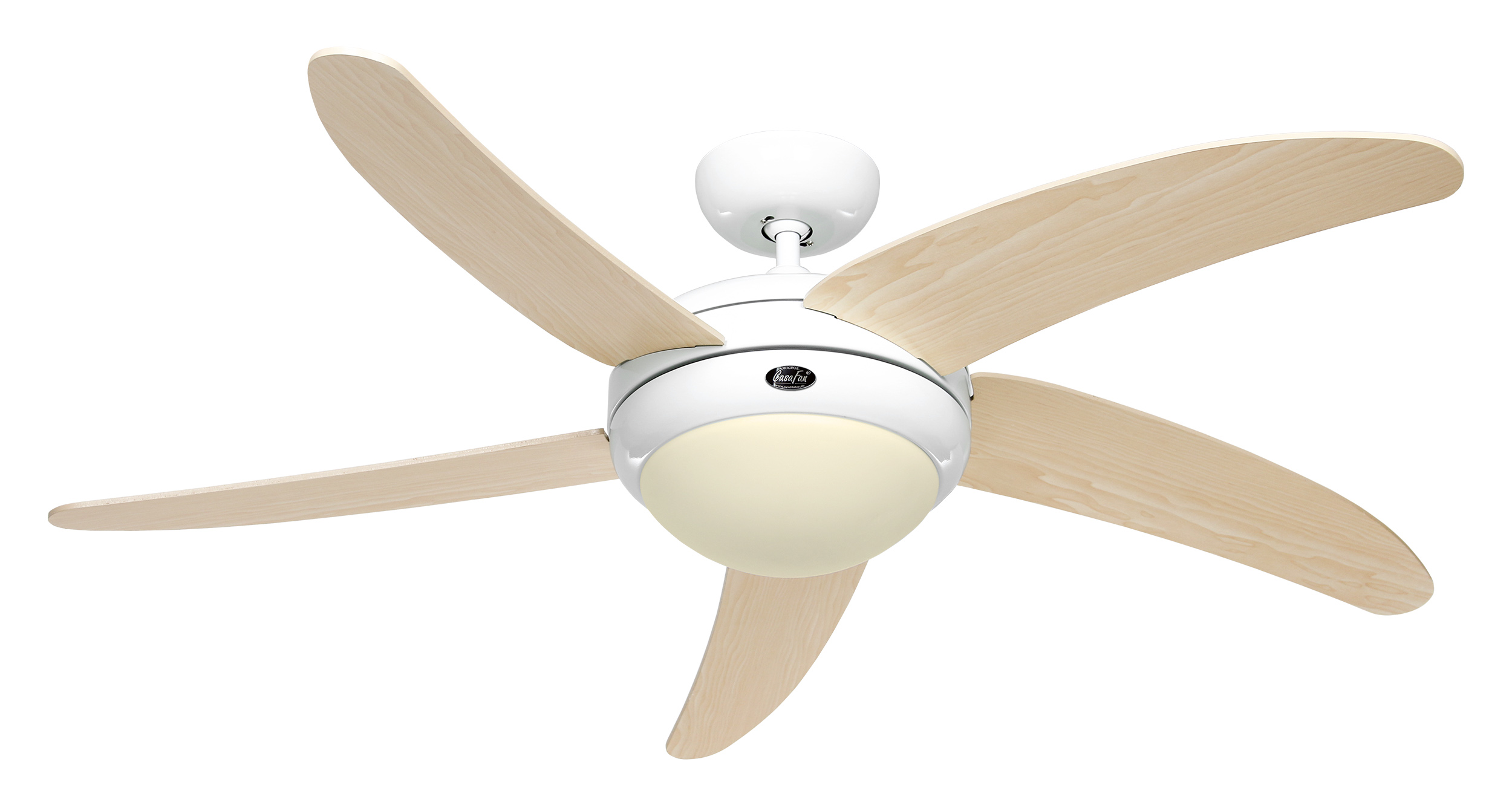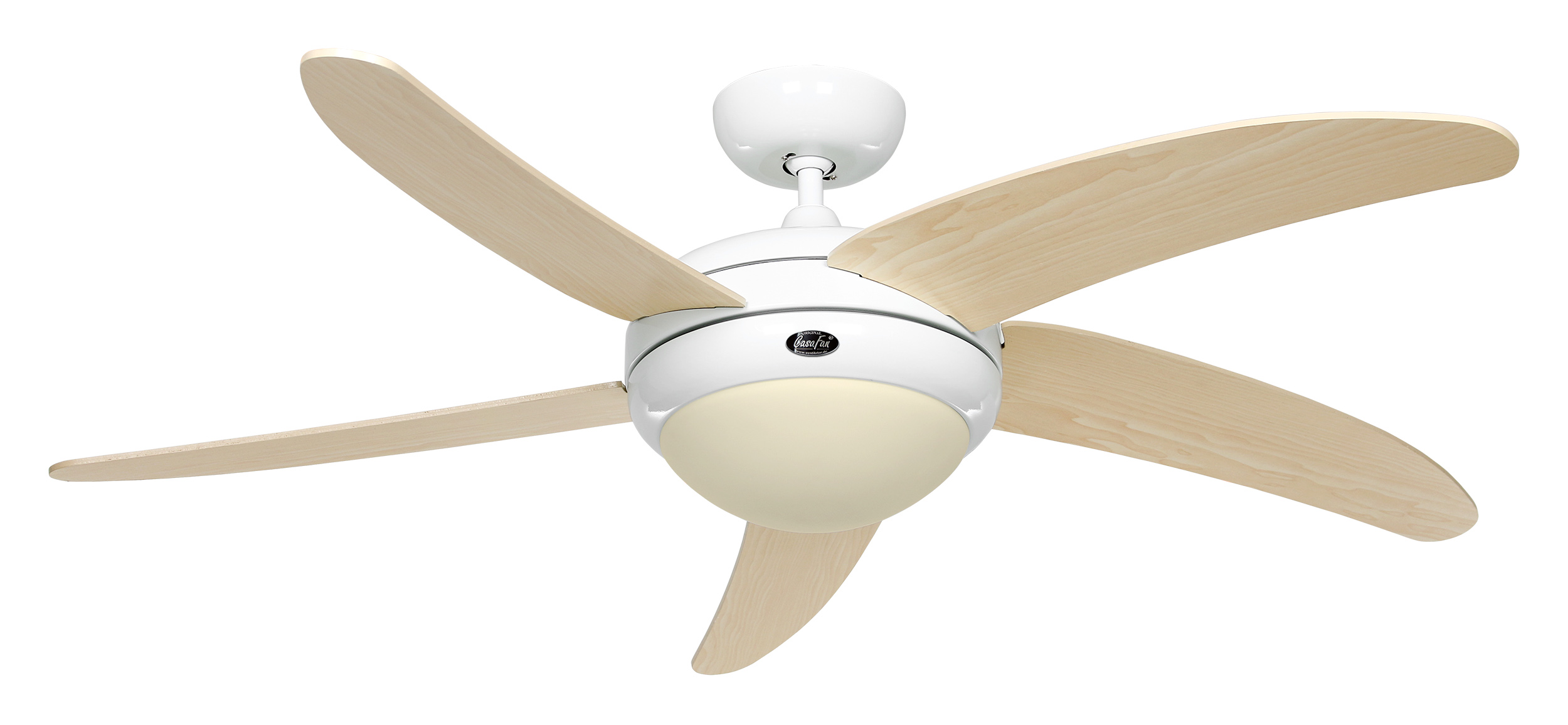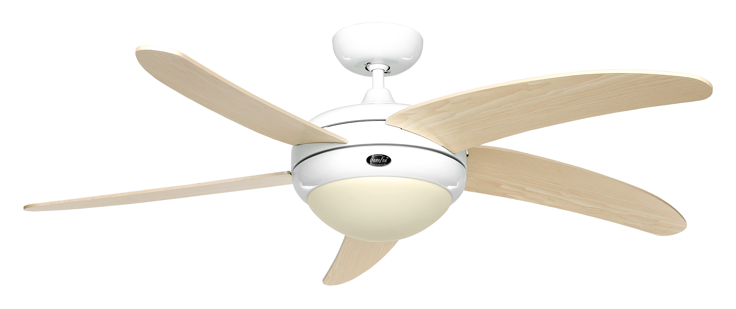 CasaFan ELICA WE-AH mit Fernbedienung, Deckenventilator, Ø 132 cm, Gehäuse Lack weiß, 5 Flügel Ahorn, inkl. Fernbedienung (Motor 3 Stufen, Licht ein/aus/dimmen) mit Wandhalter, inkl. Milchglasleuchte 2 x 40 W E27, für Energiesparleuchtmittel geeignet, 220-240 V 50 Hz, Motor 15-72 W, Vor-/Rückwärtslauf - Sommer/Winter - über Schiebeschalter, Drehzahl max. 188 U/min, inkl. 2 Deckenstangen (100 und 70 mm), Abstand Decke - Flügel 260 mm (230 mm mit kurzer Deckenstange), Montage an Schrägen bis 17°, gewuchteter Motor und Flügel, für Raumgrößen bis 25 m², Zubehör wie längere Deckenstangen und Wandschalter erhältlich