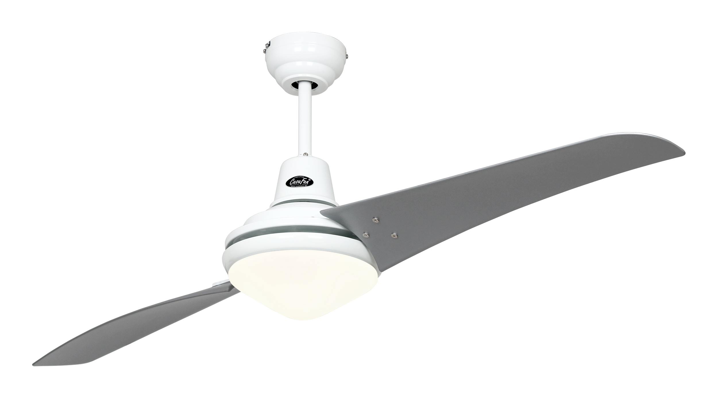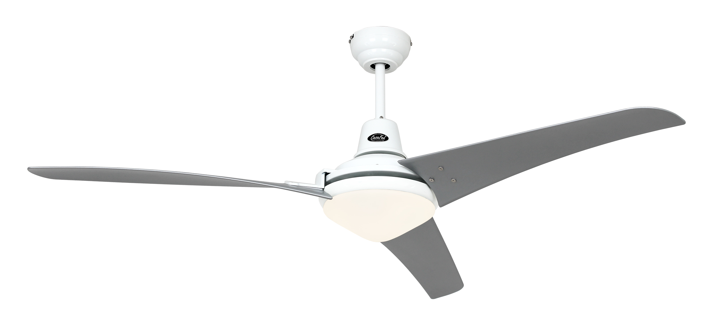 CasaFan MIRAGE WE-SI mit Fernbedienung, Deckenventilator, Ø 132 cm, Gehäuse Lack weiß, 5 Flügel Kunststoff Lack silber (wahlweise 2,3,4 möglich), inkl. Fernbedienung (Motor 3 Stufen, Licht ein/aus/dimmen) mit Wandhalter, inkl. Milchglasleuchte 2 x 40 W E27, für Energiesparleuchtmittel geeignet, 220-240 V 50 Hz, Motor 18-62 W, Vor-/Rückwärtslauf - Sommer/Winter - über Schiebeschalter, Drehzahl max. 231 U/min, inkl. 2 Deckenstangen (200 und 100 mm), Abstand Decke - Flügel 400 mm (300 mm mit kurzer Deckenstange), Montage an Schrägen bis 14°, gewuchteter Motor und Flügel, für Raumgrößen bis 32 m², Zubehör wie Austauschflügel, längere Deckenstangen und Wandschalter erhältlich