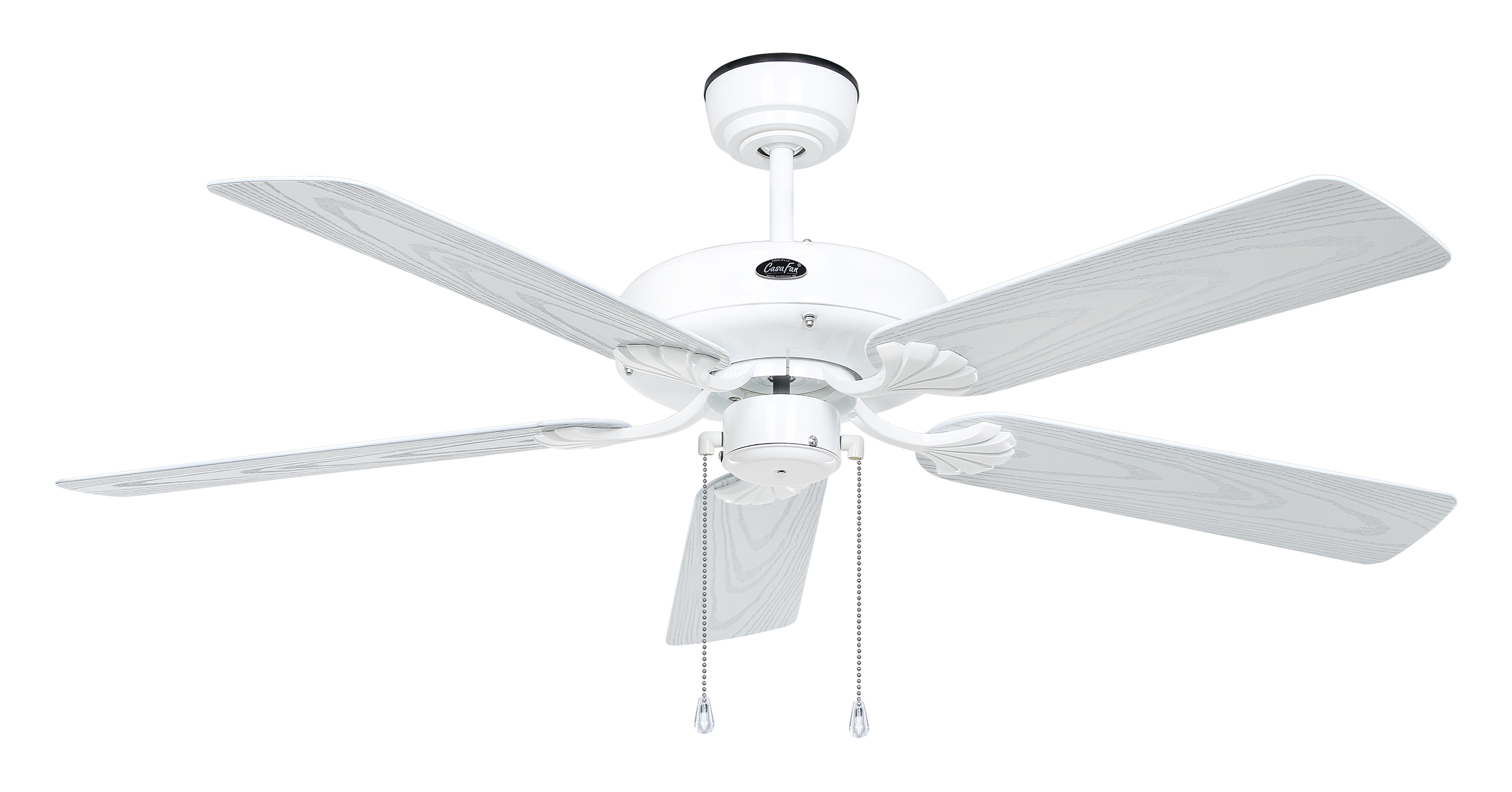 CasaFan OUTDOOR CLASSIC WE-EB, Deckenventilator, Ø 132 cm, Gehäuse Lack weiß, 5 Flügel Kunststoff weiß Eiche Dekor, 220-240 V 50 Hz, Motor 27-60 W, IP44, 3-Stufen-Zugschalter, Vor-/Rückwärtslauf - Sommer/Winter - über Zugschalter, Drehzahl max. 190 U/min, inkl. 1 Deckenstange 150 mm), Abstand Decke - Flügel 345 mm (295 mm mit gekürzter Deckenstange), Montage an Schrägen mit Hilfskonstruktion, gewuchteter Motor und Flügel, für Raumgrößen bis 25 m², Zubehör wie längere Deckenstangen, Fernbedienungen und Wandschalter erhältlich