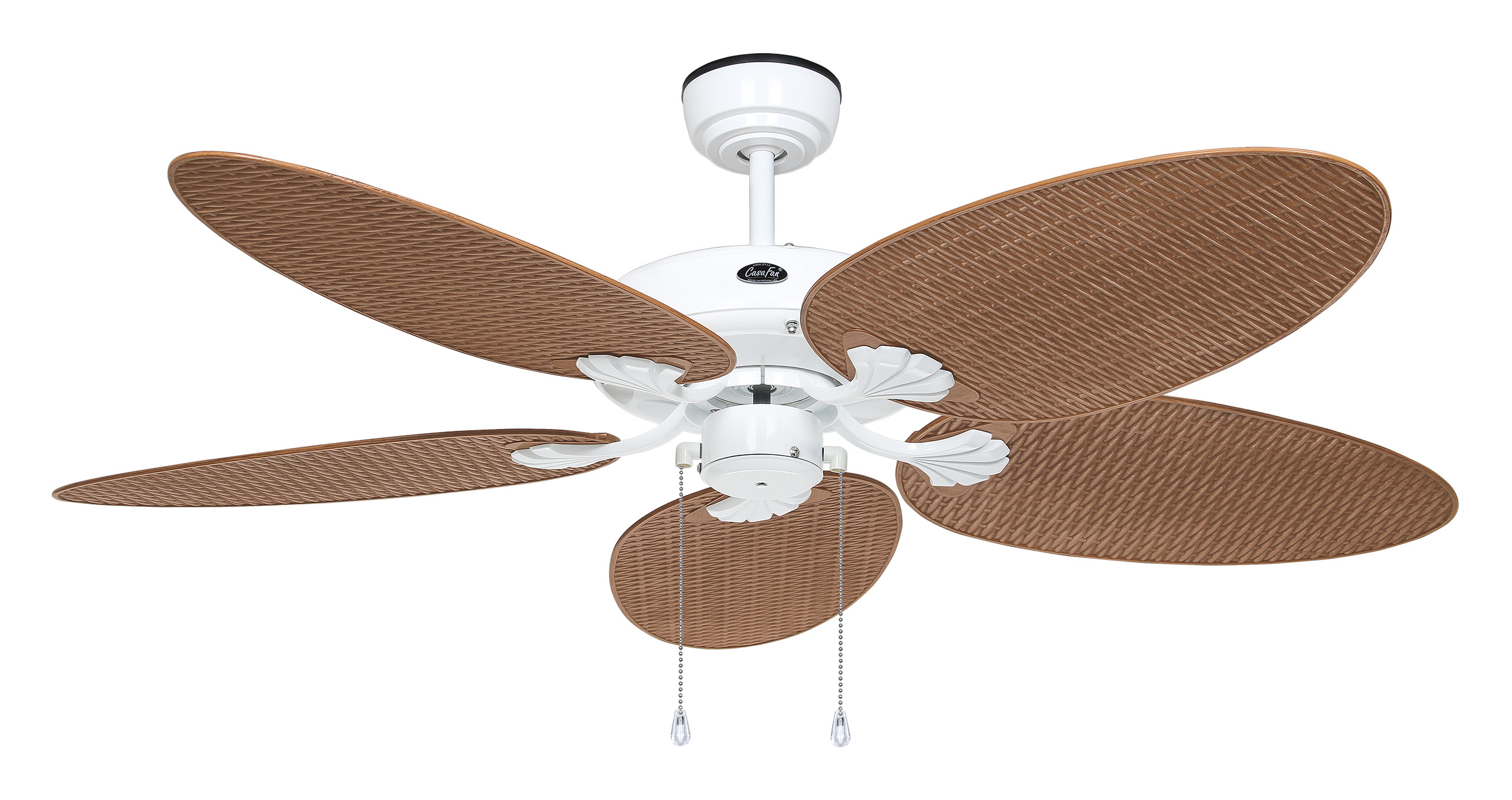 CasaFan OUTDOOR CLASSIC WE-PR, Deckenventilator, Ø 132 cm, Gehäuse Lack weiß, 5 Flügel Kunststoff Palme/Rattan, 220-240 V 50 Hz, Motor 27-61 W, IP44, 3-Stufen-Zugschalter, Vor-/Rückwärtslauf - Sommer/Winter - über Zugschalter, Drehzahl max. 176 U/min, inkl. 1 Deckenstange 150 mm), Abstand Decke - Flügel 345 mm (295 mm mit gekürzter Deckenstange), Montage an Schrägen mit Hilfskonstruktion, gewuchteter Motor und Flügel, für Raumgrößen bis 25 m², Zubehör wie längere Deckenstangen, Fernbedienungen und Wandschalter erhältlich
