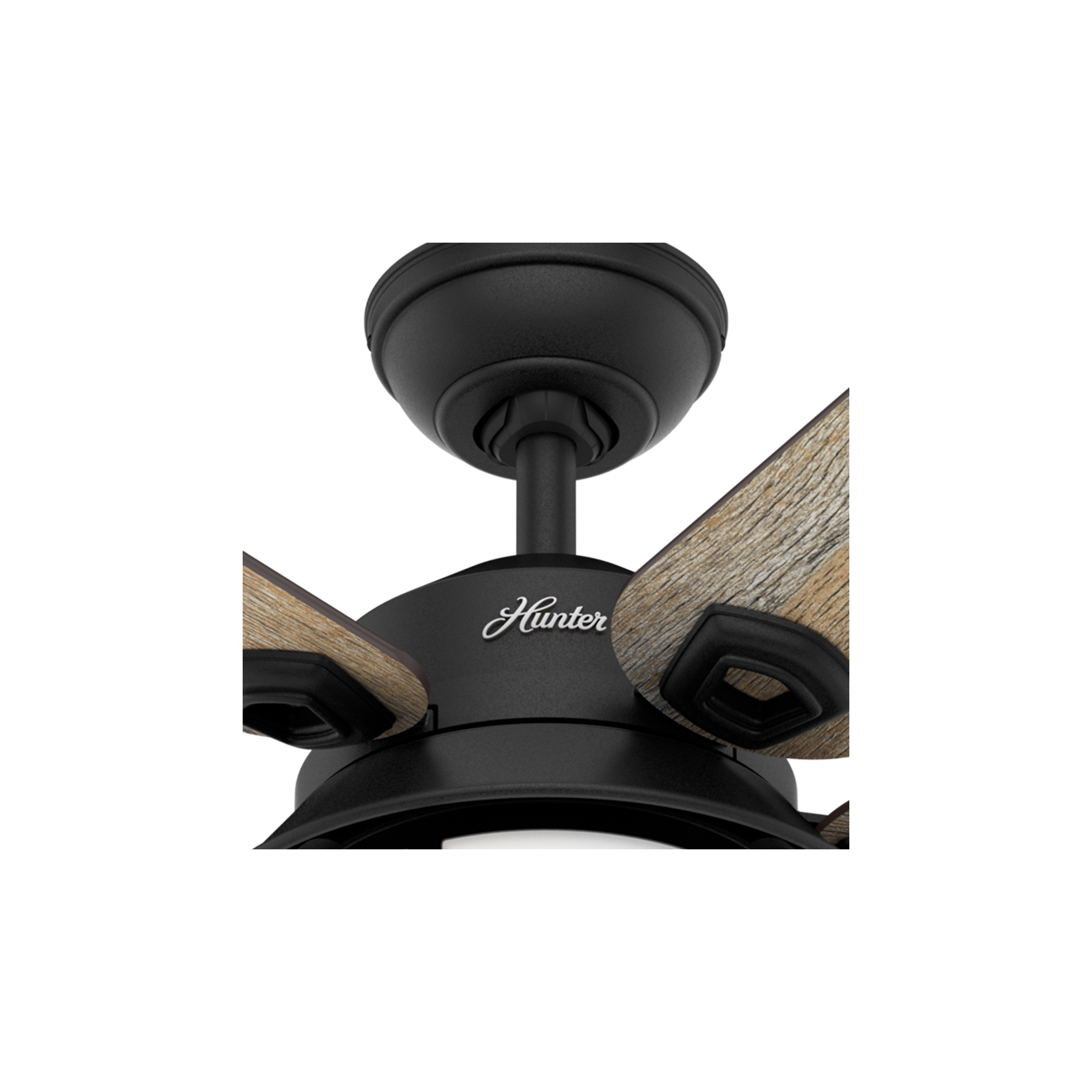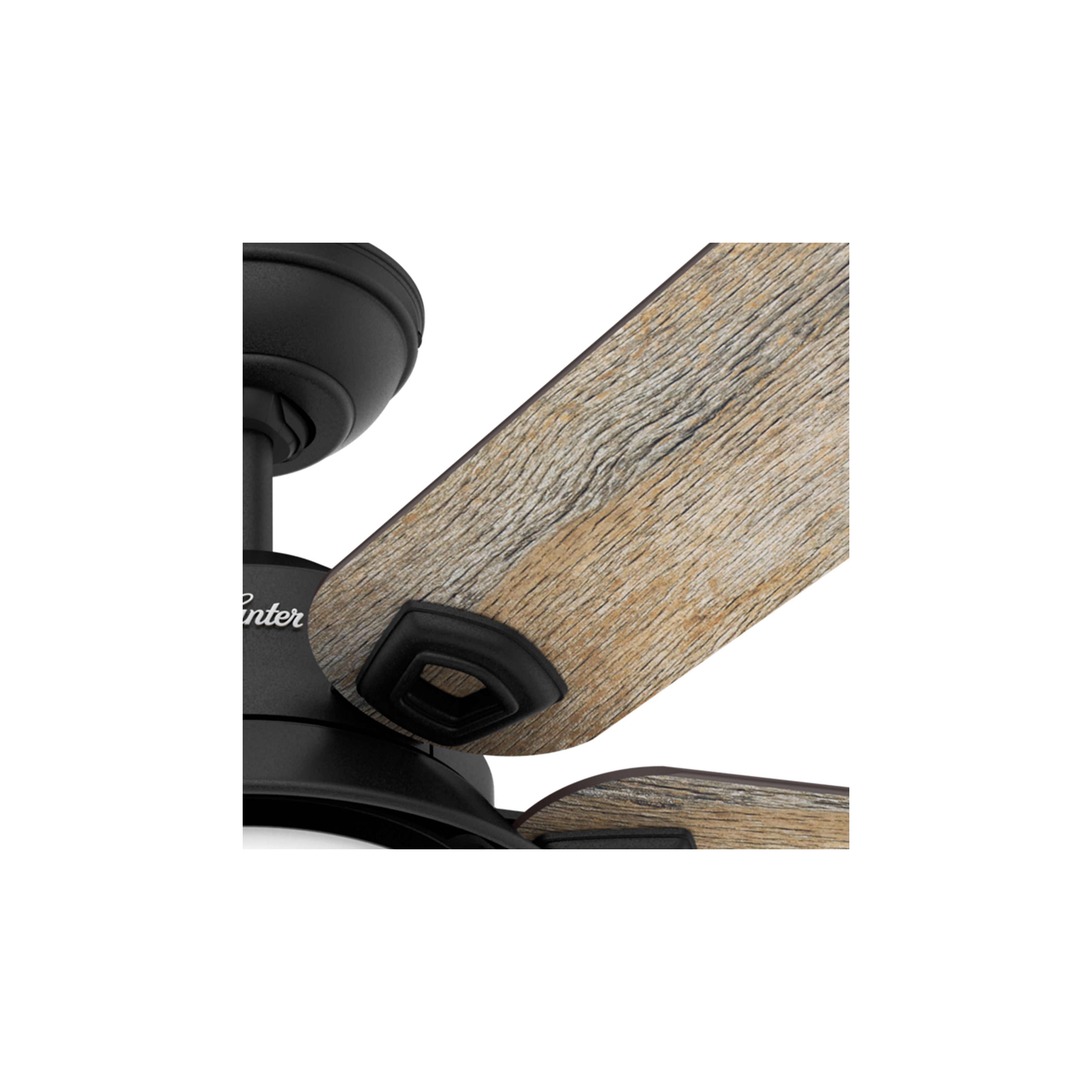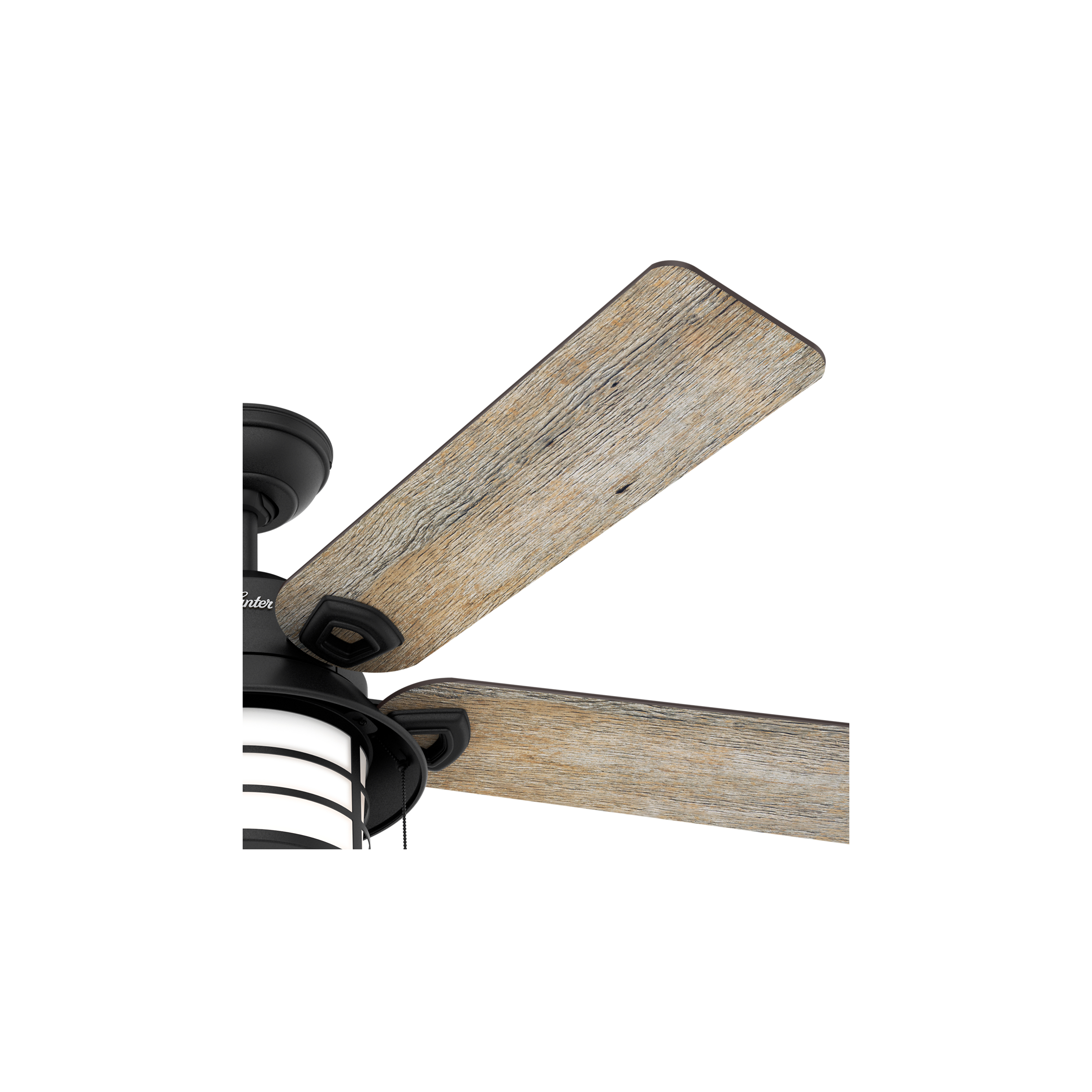Hunter SANTORINI 137 EN, Deckenventilator, Ø 137 cm, Gehäuse Eisen natur/schwarz, 5 Wendeflügel Dekor Altholz/Schwarze Weide, integrierte Milchglasleuchte max. 2 x 14 W E27 ESL, 3-Stufen-Zugschalter, Vor-/Rückwärtslauf über Schiebeschalter, Motor max. 69 Watt, 220-240 ~50 V/Hz, Abstand Decke - Flügel 286 mm, mit kurzer Deckenstange, Montage auch an Schrägen bis 16°, längere Deckenstangen und Fernbedienungen erhältlich.