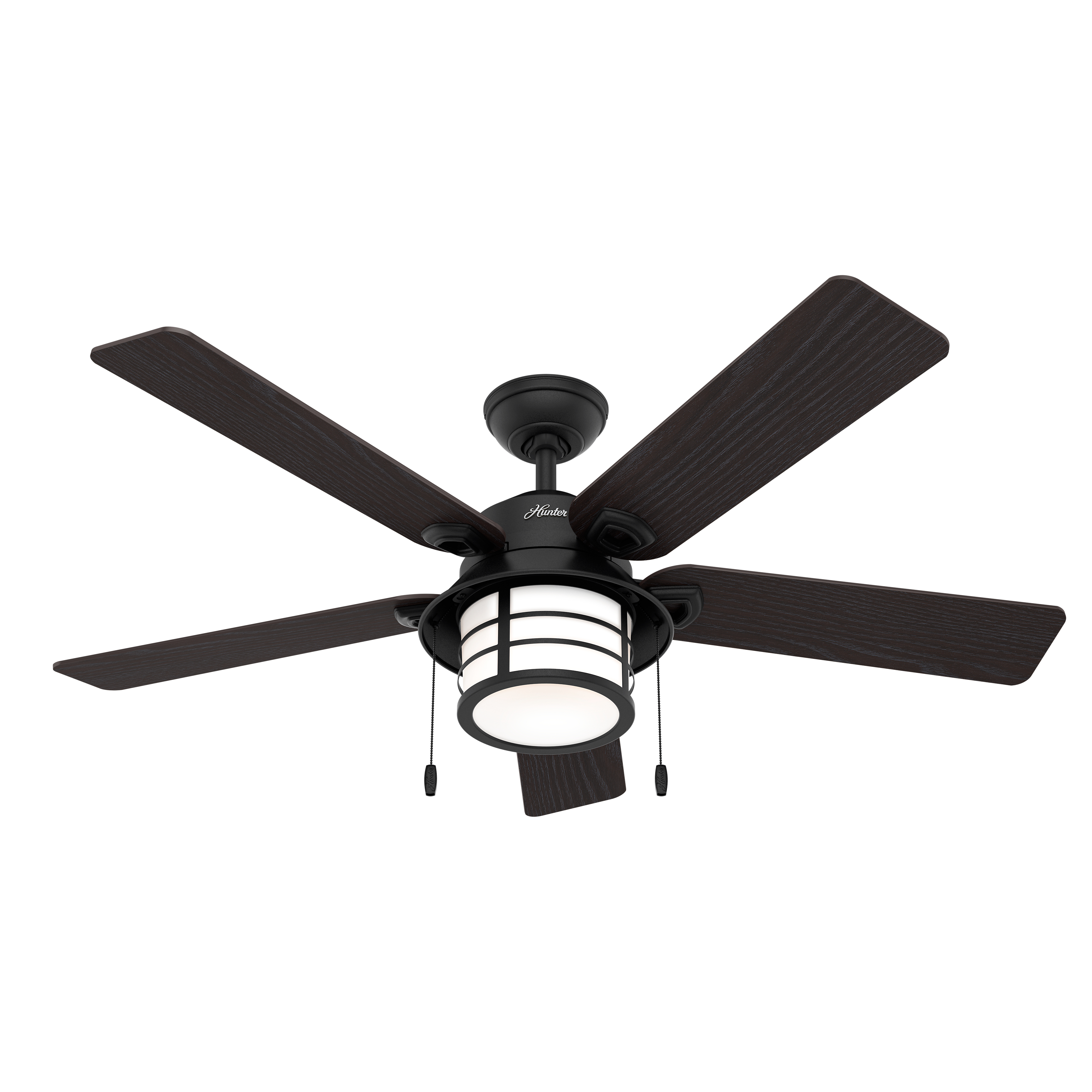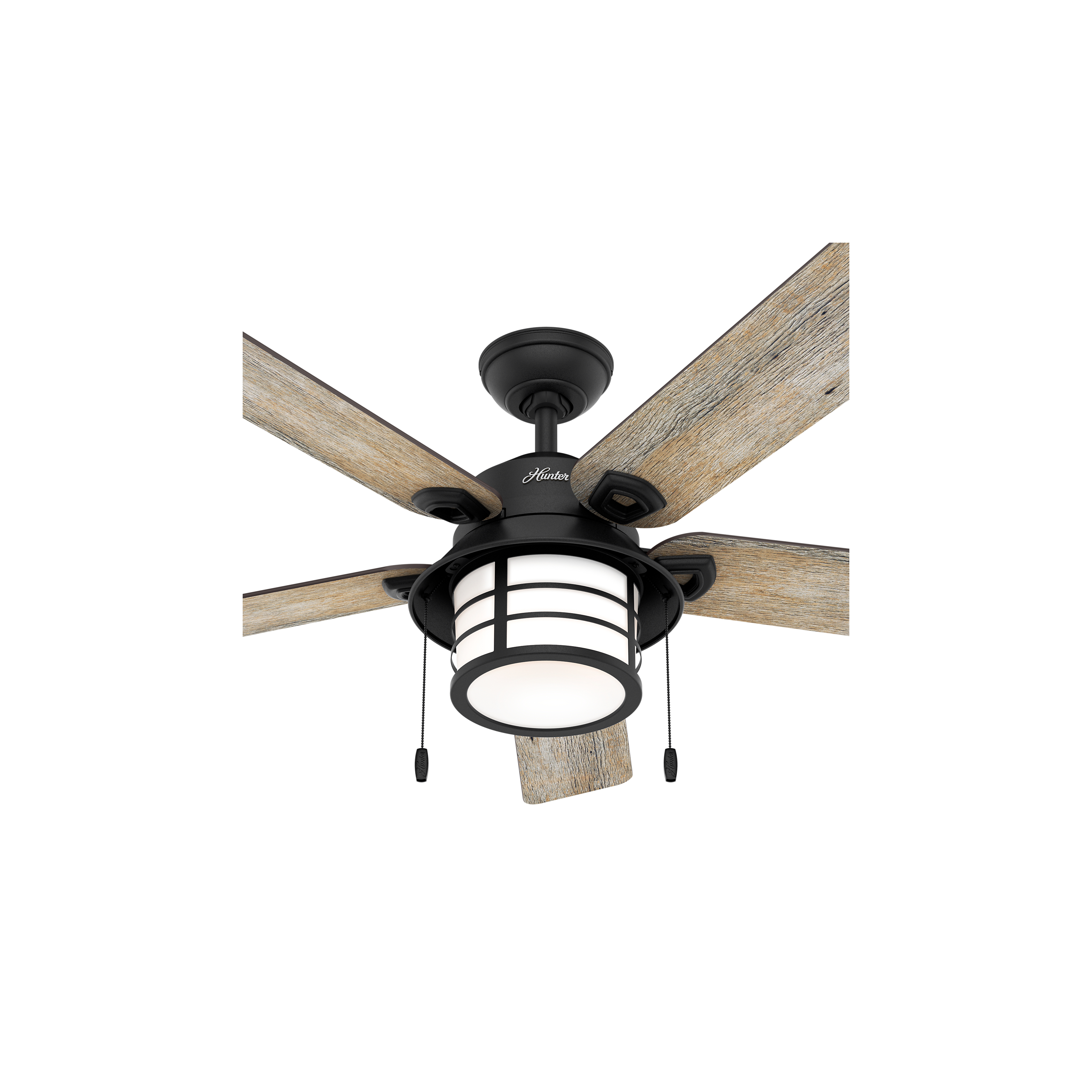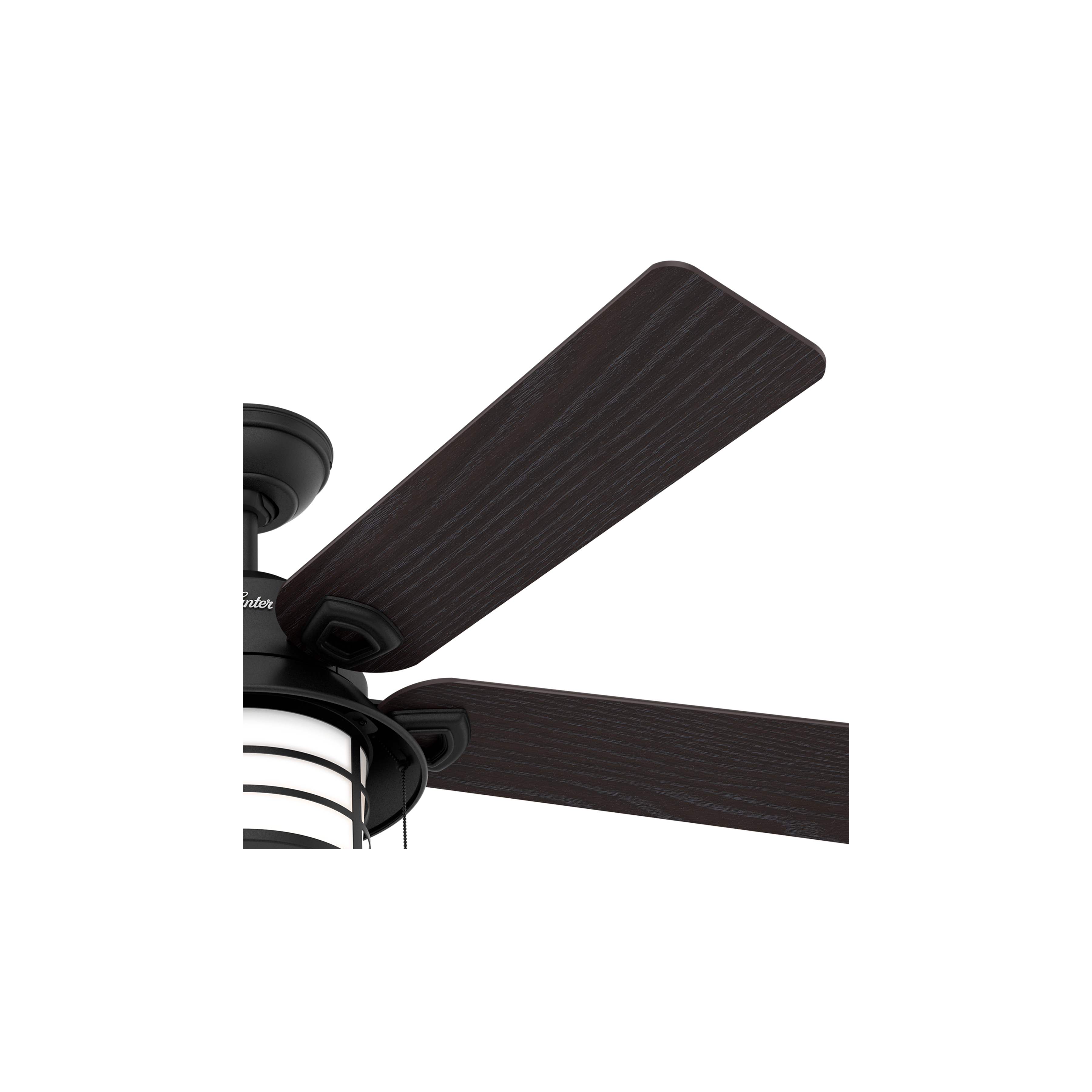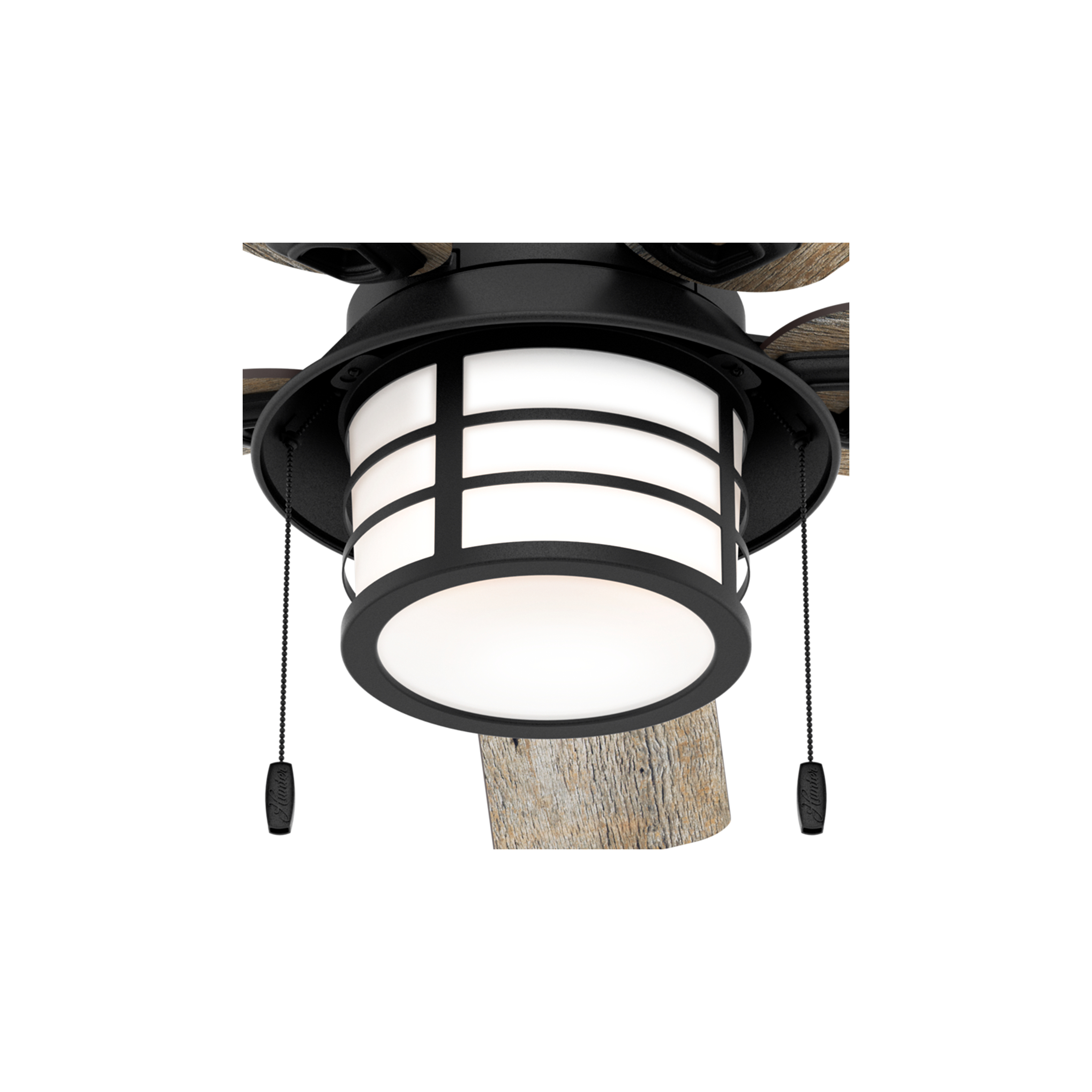 Hunter SANTORINI 137 EN, Deckenventilator, Ø 137 cm, Gehäuse Eisen natur/schwarz, 5 Wendeflügel Dekor Altholz/Schwarze Weide, integrierte Milchglasleuchte max. 2 x 14 W E27 ESL, 3-Stufen-Zugschalter, Vor-/Rückwärtslauf über Schiebeschalter, Motor max. 69 Watt, 220-240 ~50 V/Hz, Abstand Decke - Flügel 286 mm, mit kurzer Deckenstange, Montage auch an Schrägen bis 16°, längere Deckenstangen und Fernbedienungen erhältlich.