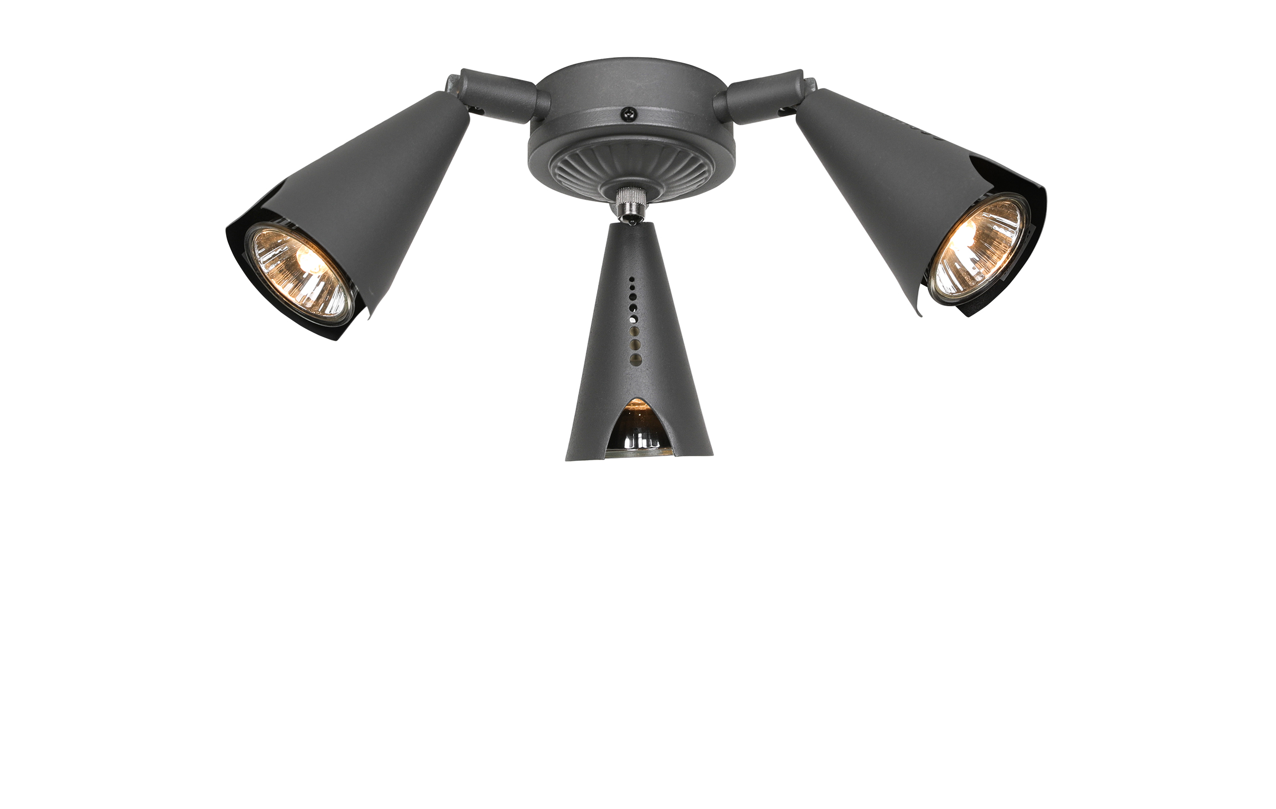 Leuchte 5-II, drei einstellbare Halogenstrahler, Fassung GU 10, max. 3 x 50 Watt, Lack graphit, Anbauleuchte für Casafan-Deckenventilatoren.