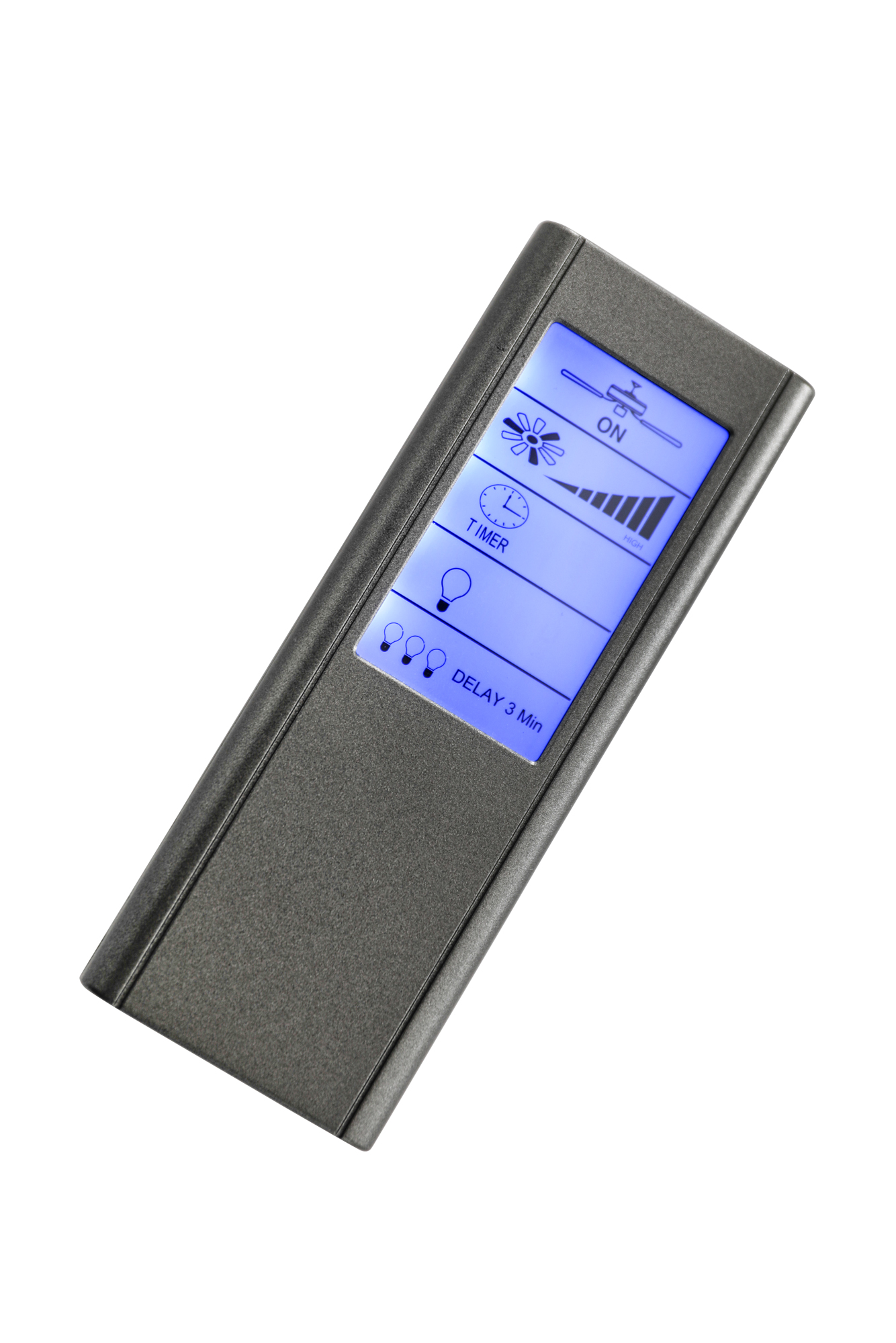 CasaFan FB-FNK-D LCD Touch, Universal-Fernbedienung für 1 Deckenventilator, mit LCD-Handsender. Motor: max. 100 W, Leuchte max. 300 W/LED max. 24 W. Funktion: Motor 4 Stufen + Aus, Leuchte An/Aus/Dimmen. Motor: max. 100 W, Leuchte max. 300 W/LED 24 W. Funk-System im 434 MHz-Bereich, 16-fach codierbar. Der Empfänger wird im Baldachin oder an der Deckenplatte (bei extraflachen Modellen) des Deckenventilators platziert. Der Handsender inklusive Wandhalter hat beleuchtetes LCD-Display und wird mit 4 Batterien vom Typ AAA, 1,5 V betrieben (nicht im Lieferumfang). Bei Einsatz von Deckenventilatoren für Dachschrägen vermindert sich die max. Neigung des Ventilators auf 16°.