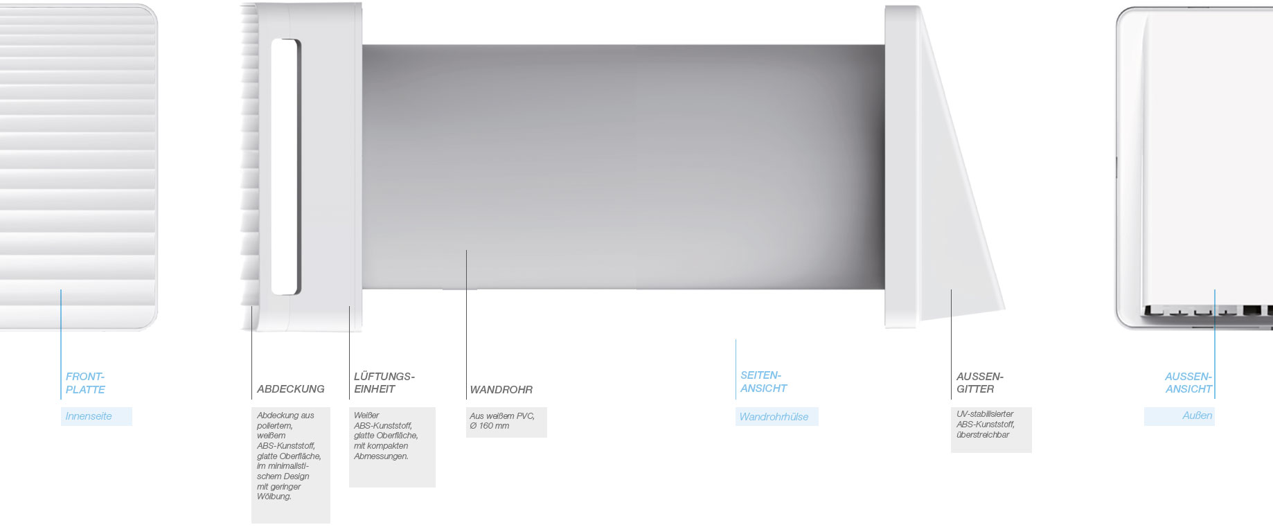 Geräteeinheit, dezentrales Lüftungsgerät mit Wärmerückgewinnung, int. An/Aus Schalter, inkl. Fernbedienung mit 3 Lüftungsstufen, keramischer Wärmespeicher, NW 150 mm, Gehäuse u. autom. elektrische Verschlussklappe aus selbstverlöschendem ABS-Kunststoff, bürstenloser EC-Motor, kugelgelagert, energiesparend, 220-240V/50Hz, 8,9 W, max. 60 m³/h, max. 31 Pa, LP max. 24,0 dB(A) -3m, Schutzart IPX4, Temp. max. für Dauerbetrieb -20 bis +50 °C, thermischer Überlastschutz, Wärmebereitstellungsgrad bis 93%, bedienbar über Fernbedienung o. Wandschalter (optional), inkl. G3 / ISO Coarse 45% Filter (Innen u. Außen), inkl. Wandrohrhülse (250-400mm) u. Wetterschutzgitter, Allgem. bauaufsichtl. Zulassung Z-51.3-430