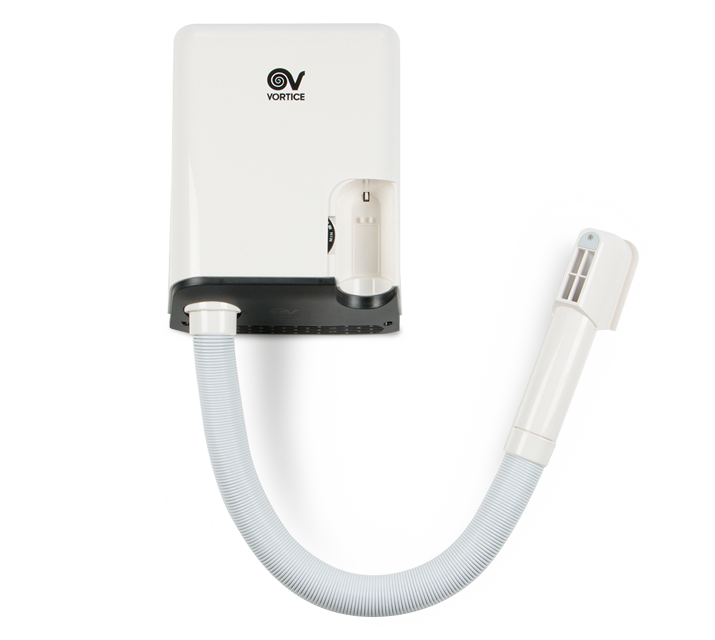 Wandhaartrockner VortDry mit flexiblem Schlauch, Farbe weiß (RAL 9010), 220-240 V 50/60 Hz, Motor max. 33 W, max. 3 A, geeignet für den Einsatz in Hotelzimmern, Pensionen, Schiffskabinen, Privathaushalten usw.