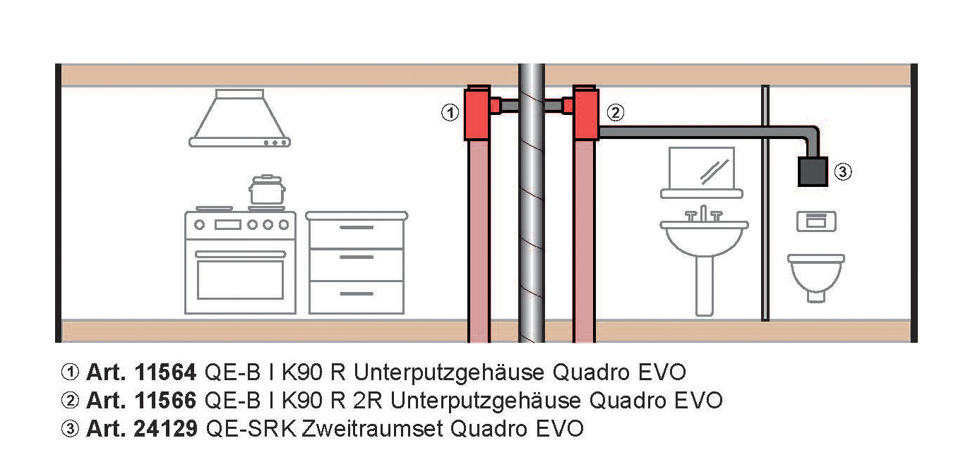 QE-B I K90 S 2R, Unterputz-Gehäuse mit Brandschutz-Ummantelung K90 und Edelstahl-Zweitraumanschluss rechts für Einbau in Wand, Decke oder in F90 Lüftungsschächte, Edelstahl-Ausblasstutzen seitlich mit Brandschutz-Absperrelement K90 (TUM zertifiziert), NW 75/80, Gehäuse aus ABS-Kunststoff, mit luftdichter Rückschlagklappe nach DIN 18017-3, inkl. Putzschutzdeckel, Allgem. Bauaufsichtl. Zulassung Z-51.1-469