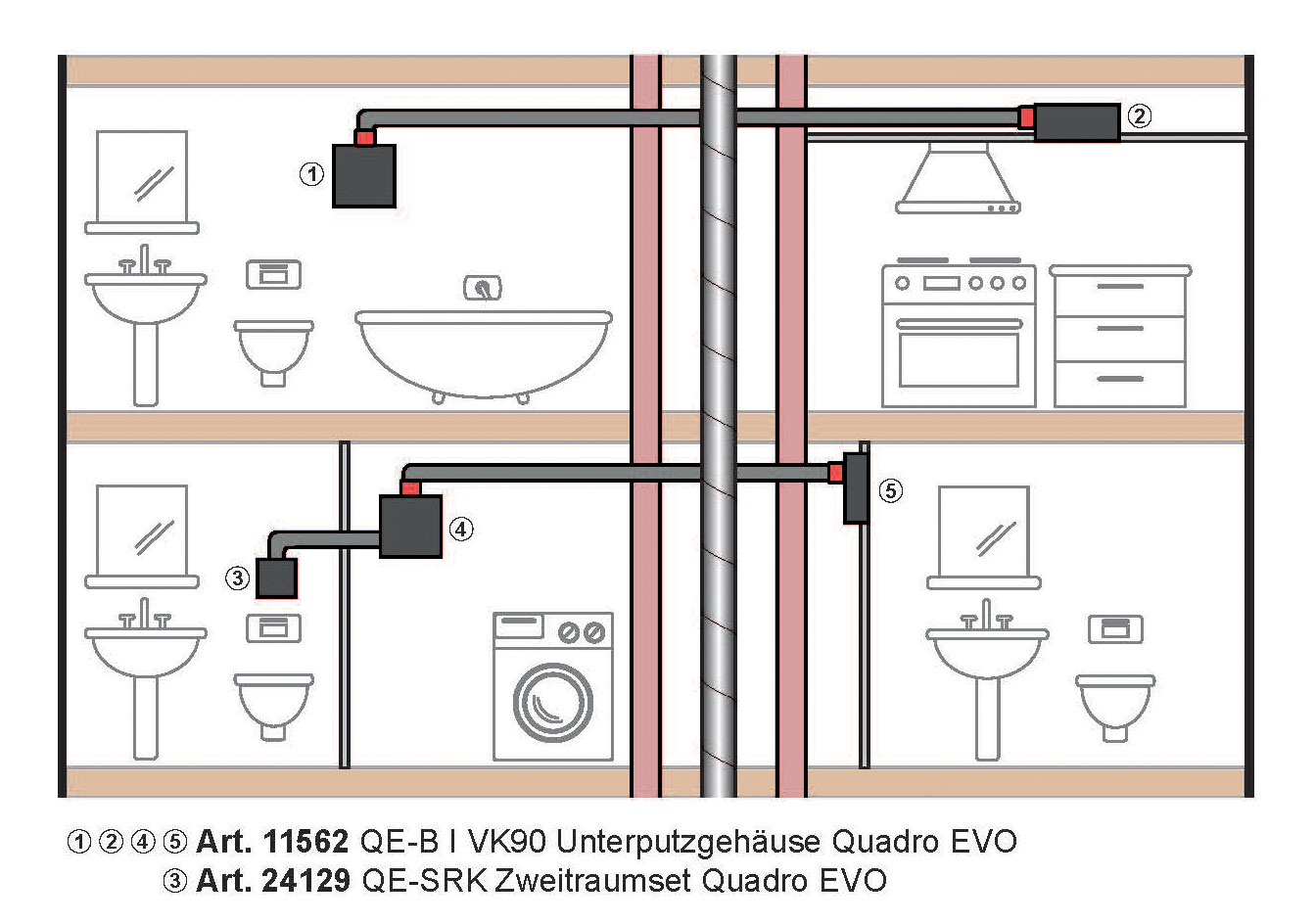 Unterputzgehäuse QE-B I VK90 für Einbau in Wand oder Decke außerhalb von F90 Schächten, Edelstahl-Ausblasstutzen seitlich/rückseitig mit Brandschutz-Absperrelement K90 (TUM zertifiziert), NW 75/80, Gehäuse aus ABS-Kunststoff, mit luftdichter Rückschlagklappe nach DIN 18017-3, inkl. Putzschutzdeckel, Zweitraumanschluss möglich (Anschlussstutzen QE-AD, Art. 21118 oder Zweitraumset QE-SRK, Art. 24129), Allgem. Bauaufsichtl. Zulassung Z-51.1-469