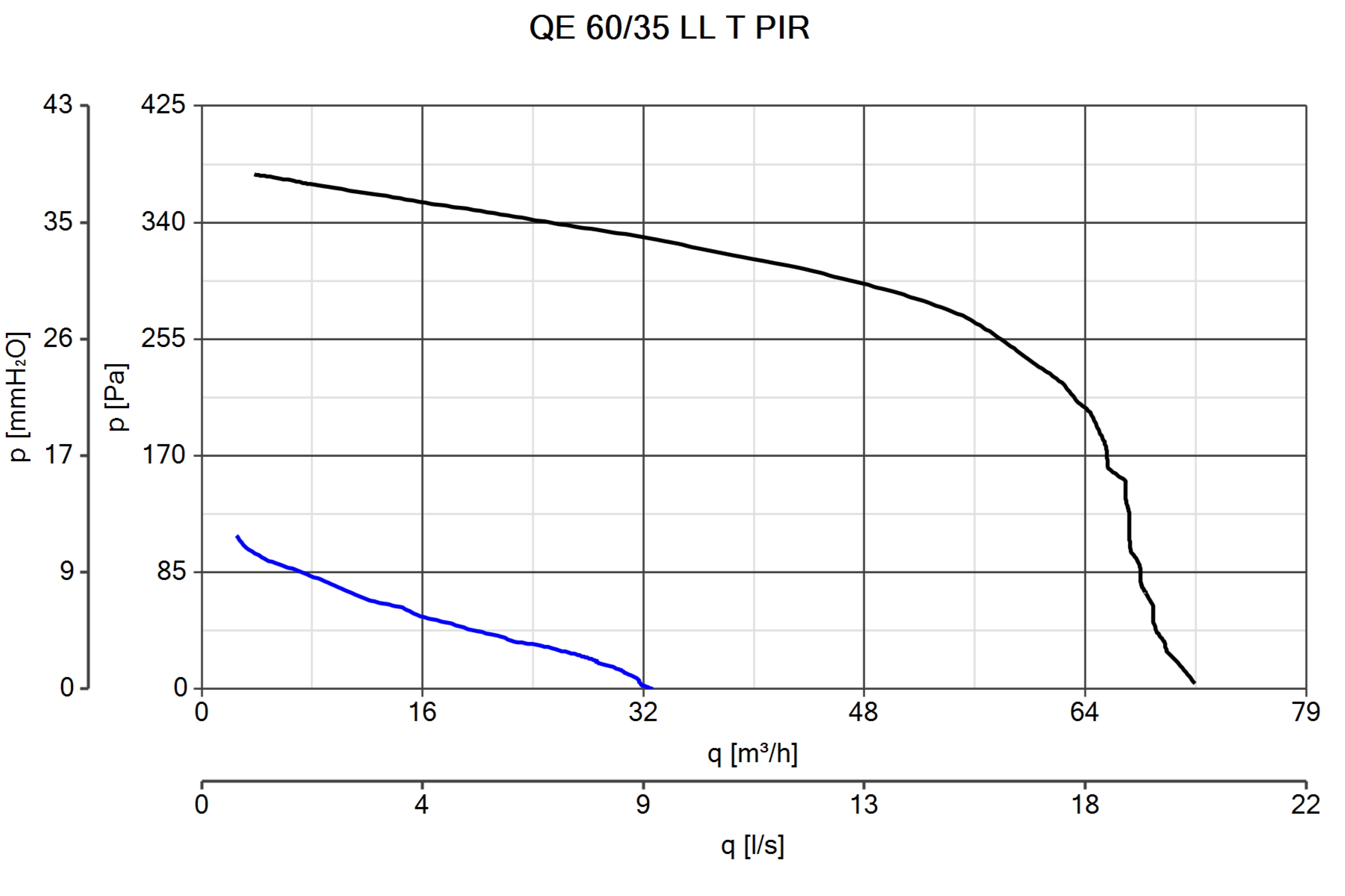 QE 60/35 LL T PIR, Ventilatoreinsatz, 60/35 m³/h, zweistufig, mit einstellbarem Nachlaufrelais (0-20 min.) und Bewegungssensor, vorwärtsgekrümmtes Radiallaufrad, Frontblende aus ABS-Kunststoff (Farbe weiß) inkl. G2 / ISO Coarse >30 % Filter, mit Filterreinigungsanzeige, 220-240 V~50 Hz, 16/9 W, 0,14/0,11 A, 343/98 Pa, 1.1700/855 U/min., Schallleistung Lw 41,0/36,0 dB(A), Schalldruck 23,5/18,5 Lp dB(A) -3m, Schutzart IP45, in Bereich 1 einsetzbar (DIN VDE 0100-701), Schutzklasse II, Temp max. für Dauerbetrieb 50 °C, Motor kugelgelagert, mit thermischem Überlastschutz, nach DIN 18017-3, Allgem. bauaufsichtl. Zulassung Z-51.1-469