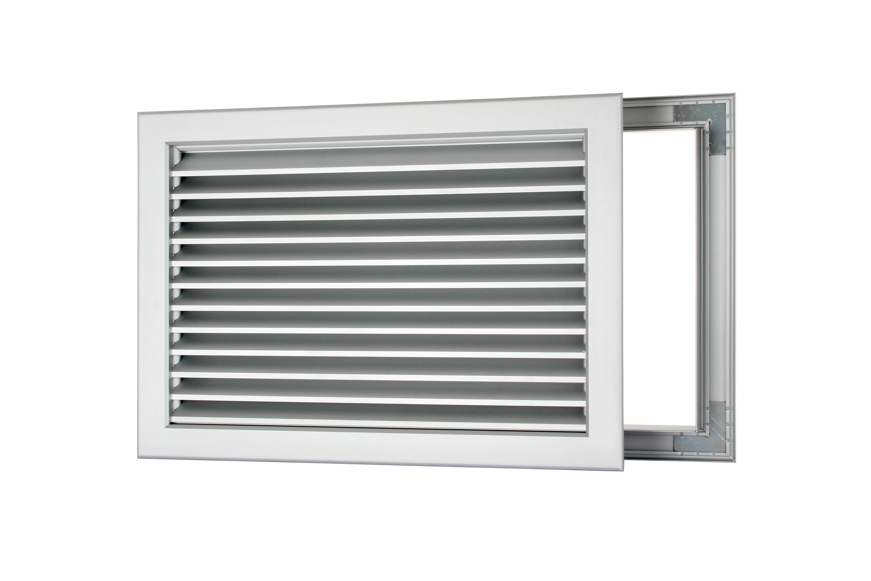 SSGA 325/225, Sichtschutzgitter zum Türeinbau mit feststehenden V-förmigen Lamellen und Rahmen sowie Gegenrahmen aus naturfarben eloxiertem Aluminium, Befestigung mittels Klemmfedern, Türausschnitt 320 x 210 mm, A frei 0,019 m², 100 V [m³/h] bei 5 Pa, 175 V [m³/h] bei 15 Pa, Einbau in Wandöffnungen ohne Gegenrahmen möglich
