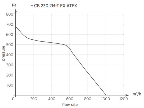 C-B 230/2 T Ex ATEX - 400V/50Hz, Radialventilator ATEX II 2G c IIB+H2 T4, Ex geschützt, Radiallaufrad aus Aluminium, Spiralgehäuse aus verzinktem Stahlblech, schwarz epoxydbeschichtet, Atex zertifizierter Asynchron-Induktionsmotor, 400 V 3~50Hz, 400 W, max. 0,8 A, max. 1.000 m³/h, max. 677 Pa, max. 2.750 U/min., LP max. 76 dB(A) -2m, Schutzart IP55, Isolierstoffklasse F, Temp. max. für Dauerbetrieb 60 °C, Motor kugelgelagert