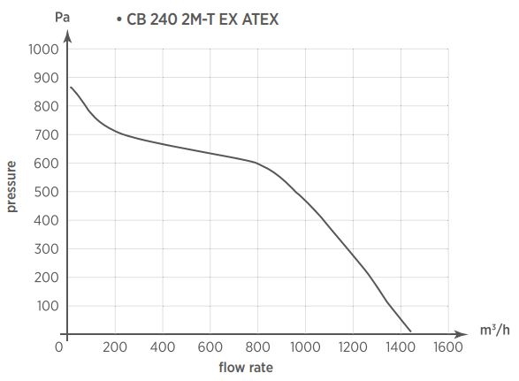 C-B 240/2 T Ex ATEX - 400V/50Hz, Radialventilator ATEX II 2G c IIB+H2 T4, Ex geschützt, Radiallaufrad aus Aluminium, Spiralgehäuse aus verzinktem Stahlblech, schwarz epoxydbeschichtet, Atex zertifizierter Asynchron-Induktionsmotor, 400 V 3~50Hz, 800 W, max. 2,3 A, max. 1.450 m³/h, max. 883 Pa, max. 2.800 U/min., LP max. 83 dB(A) -2m, Schutzart IP55, Isolierstoffklasse F, Temp. max. für Dauerbetrieb 60 °C, Motor kugelgelagert