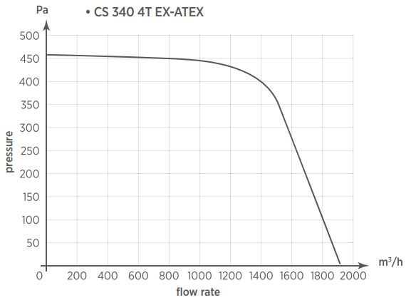 C-S 340/4 T Ex ATEX - 400V/50Hz, Radialventilator ATEX II 2G c IIB+H2 T4, Ex geschützt, Radiallaufrad aus Aluminium, Spiralgehäuse aus verzinktem Stahlblech, schwarz epoxydbeschichtet, Atex zertifizierter Asynchron-Induktionsmotor, 400 V 3~50Hz, 1.000 W, max. 2,0 A, max. 1.900 m³/h, max. 461 Pa, max. 1.400U/min., LP max. 73 dB(A) -2m, Schutzart IP55, Isolierstoffklasse F, Temp. max. für Dauerbetrieb 60 °C, Motor kugelgelagert
