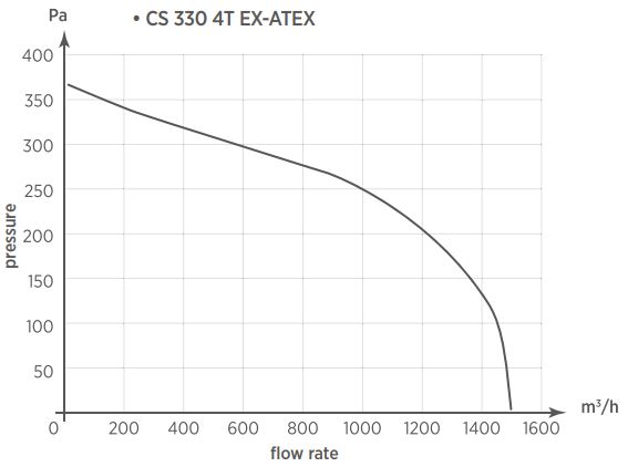 C-S 330/4 T Ex ATEX - 400V/50Hz, Radialventilator ATEX II 2G c IIB+H2 T4, Ex geschützt, Radiallaufrad aus Aluminium, Spiralgehäuse aus verzinktem Stahlblech, schwarz epoxydbeschichtet, Atex zertifizierter Asynchron-Induktionsmotor, 400 V 3~50Hz, 400 W, max. 1,1 A, max. 1.500 m³/h, max. 373 Pa, max. 1.400U/min., LP max. 70 dB(A) -2m, Schutzart IP55, Isolierstoffklasse F, Temp. max. für Dauerbetrieb 60 °C, Motor kugelgelagert