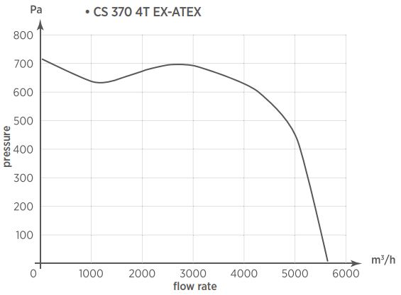 C-S 370/4 T Ex ATEX - 400V/50Hz, Radialventilator ATEX II 2G c IIB+H2 T4, Ex geschützt, Radiallaufrad aus Aluminium, Spiralgehäuse aus verzinktem Stahlblech, schwarz epoxydbeschichtet, Atex zertifizierter Asynchron-Induktionsmotor, 400 V 3~50Hz, 2.500 W, max. 5,0 A, max. 5.600 m³/h, max. 716 Pa, max. 1.400U/min., LP max. 67 dB(A) -2m, Schutzart IP55, Isolierstoffklasse F, Temp. max. für Dauerbetrieb 60 °C, inkl. Motorkonsole, Motor kugelgelagert